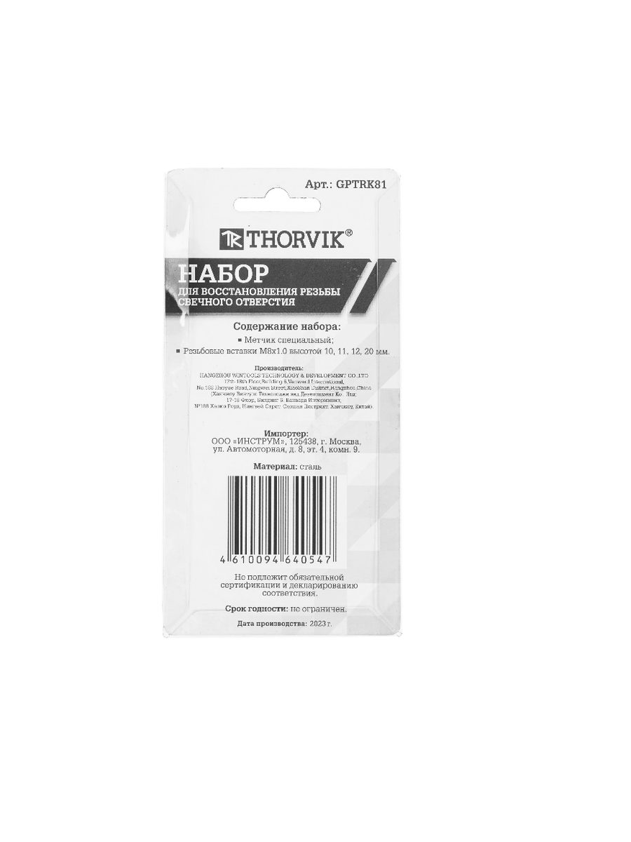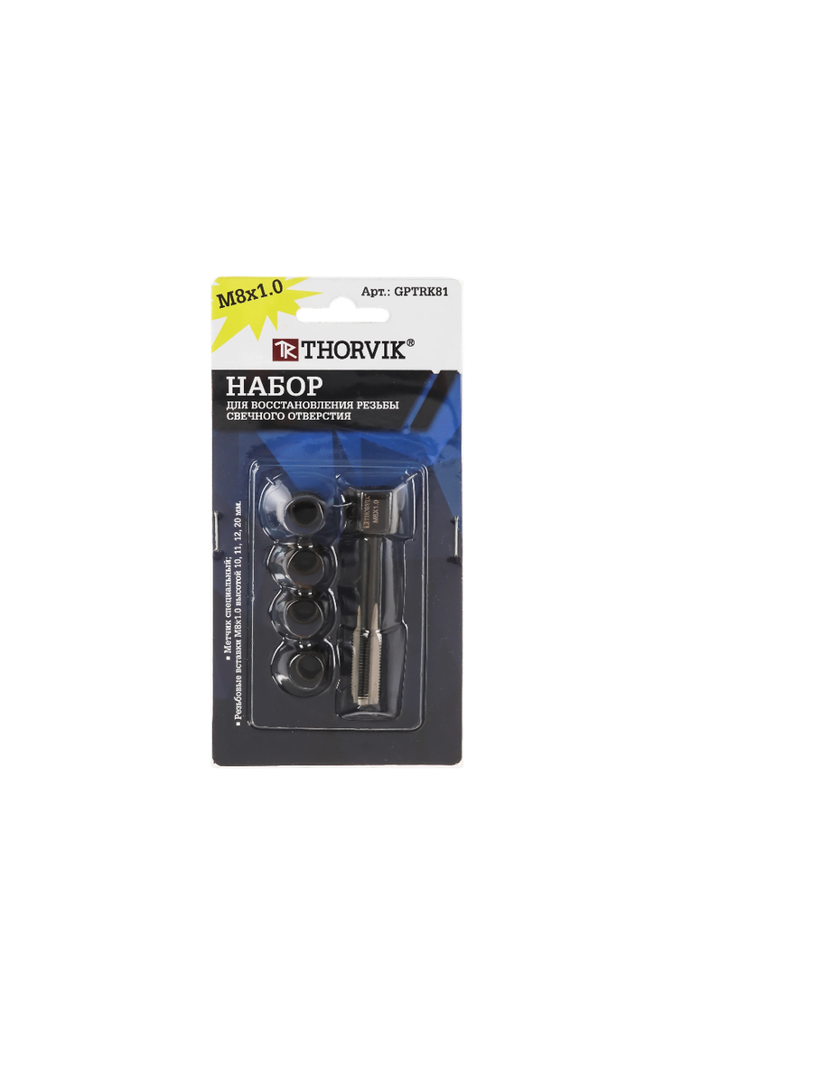 Набор для восстановления резьбы свечного отверстия Thorvik GPTRK81 М8х1.0, 5 предметов применяется для ремонта разрушенной резьбы свечных отверстий алюминиевых головок блоков цилиндров бензиновых двс различных транспортных средств и оборудования.