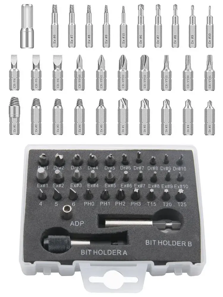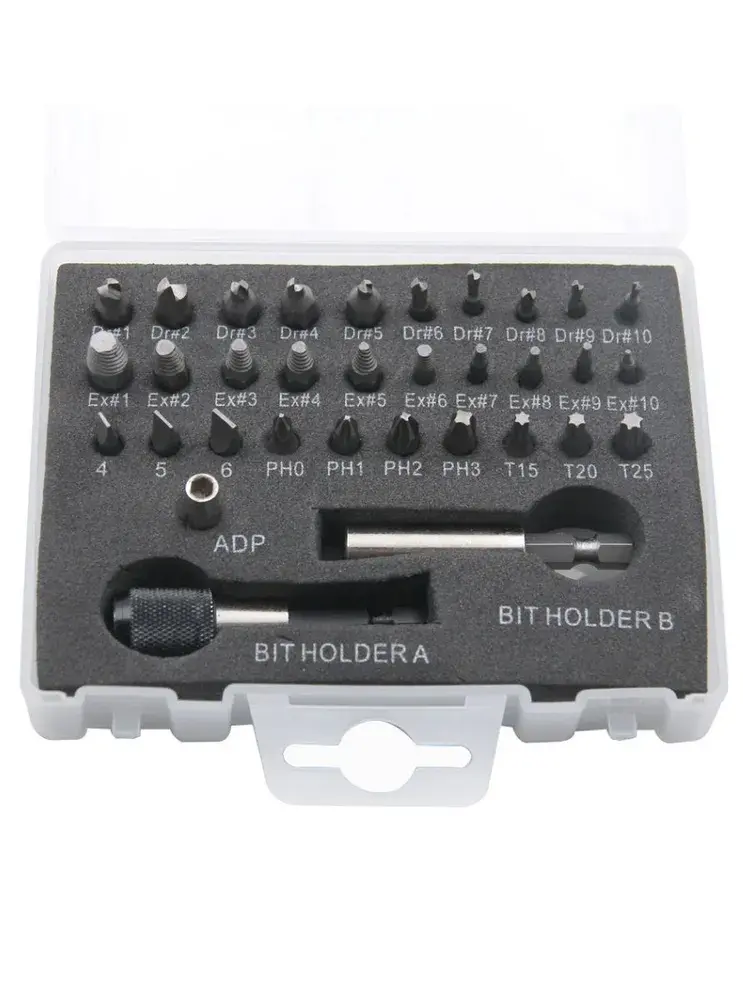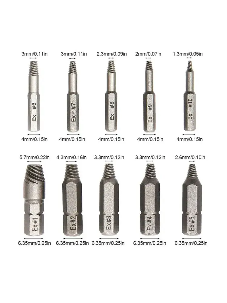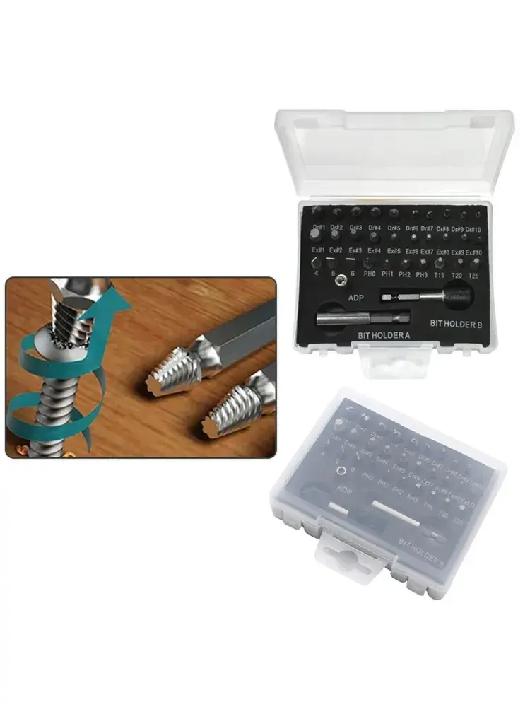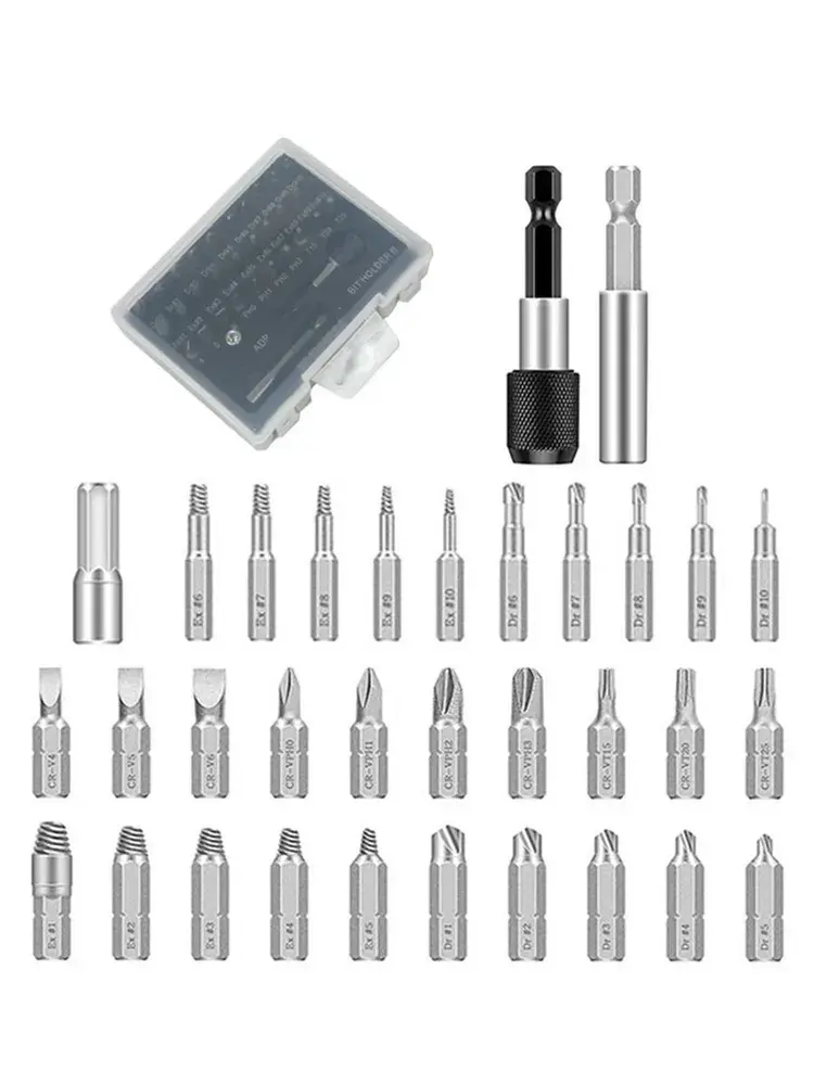Набор экстракторов - основное применение данных сверл для удаления всех видов сломанных болтов, винтов. Со временем или не правильно подобранным инструментом головка шурупа или самореза срывается и задача по выкручиваю обычной отверткой становится не выполнимой! Для аккуратного удаления метиза вам поможет наш набор экстракторов. Данная оснастка отлично справится выкрутив сорванную или сломанную резьбу. За счет увесистой прочной стали, инструмент прослужит долгое время. Дома, на даче или еще где-то, в хозяйстве нужная вещь, приобретая набор экстрактов вы всегда сможете справиться с поврежденным крепежом, а набор из 33 элементов позволит оптимально подобрать нужный размер. Набор в упаковке содержит 33 предмета с разными диаметрами и шестигранными хвостовиками. Для извлечения сломанного метиза в центре сверлится отверстие, в которое вставляется экстрактор и поворачивается против часовой стрелки. Шестигранный хвостовик инструмента надежно закрепляется в патроне дрели или шуруповерта. При этом нужно работать на низких оборотах. Инструмент для извлечения болтов. Сверло для шурупов, винтов с поврежденной шляпкой. Открутить винт с сорванными гранями. Выкрутить сломанный саморез. Выкрутить шуруп.