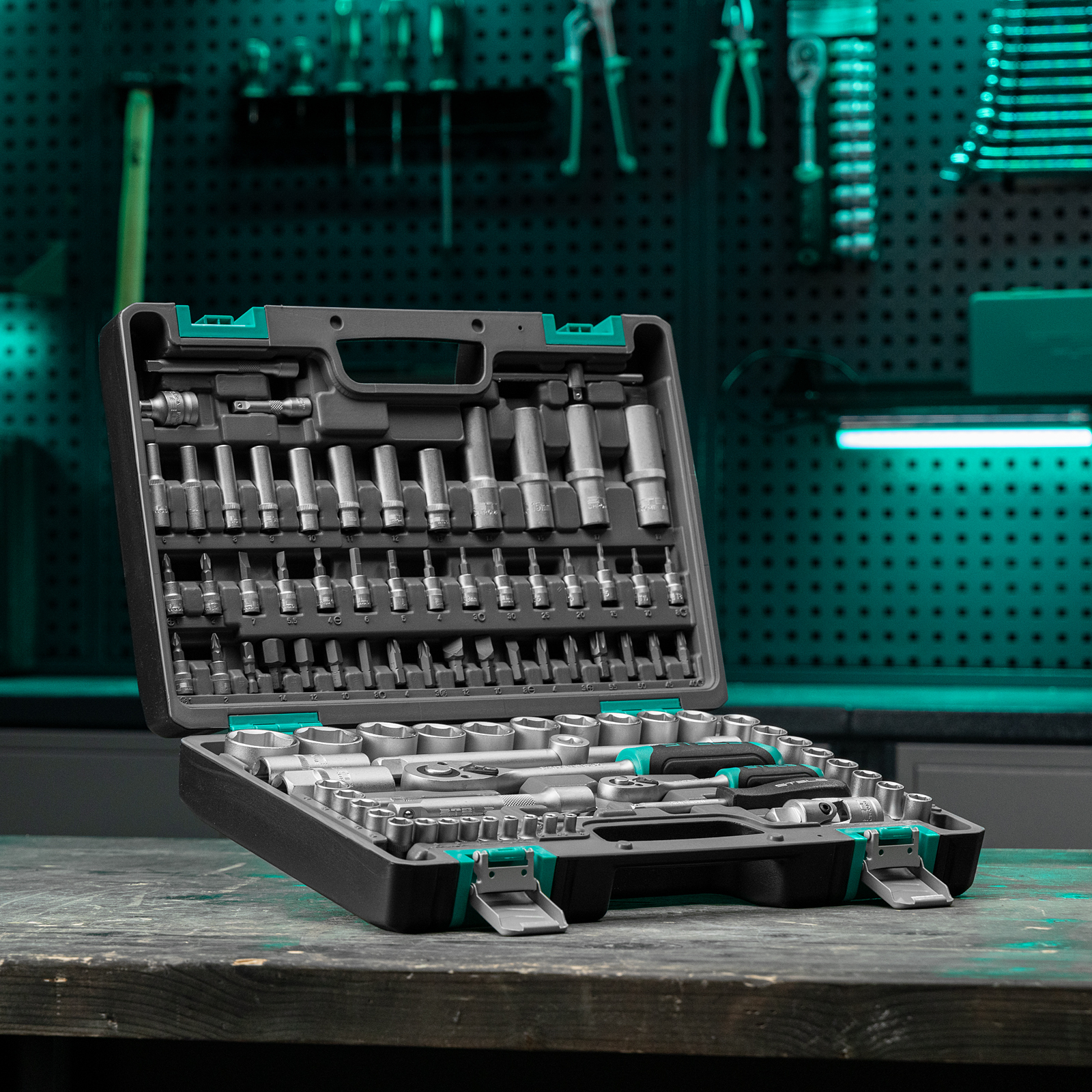 Набор инструментов Stels 14106 в ударопрочным пластиковом кейсе состоит из 94 предметов с присоединительными квадратами 1/2″ и 1/4″, из стали CrV и S2, и предназначен для выполнения слесарно-монтажных работ. Включает инструменты и насадки для работы с резьбовыми крепежами, а также удлинители (в том числе гибкий) и т-образный вороток, облегчающие работу в труднодоступных местах. Набор предназначен для профессионального использования в автомастерской, будет полезен и для решения бытовых задач.