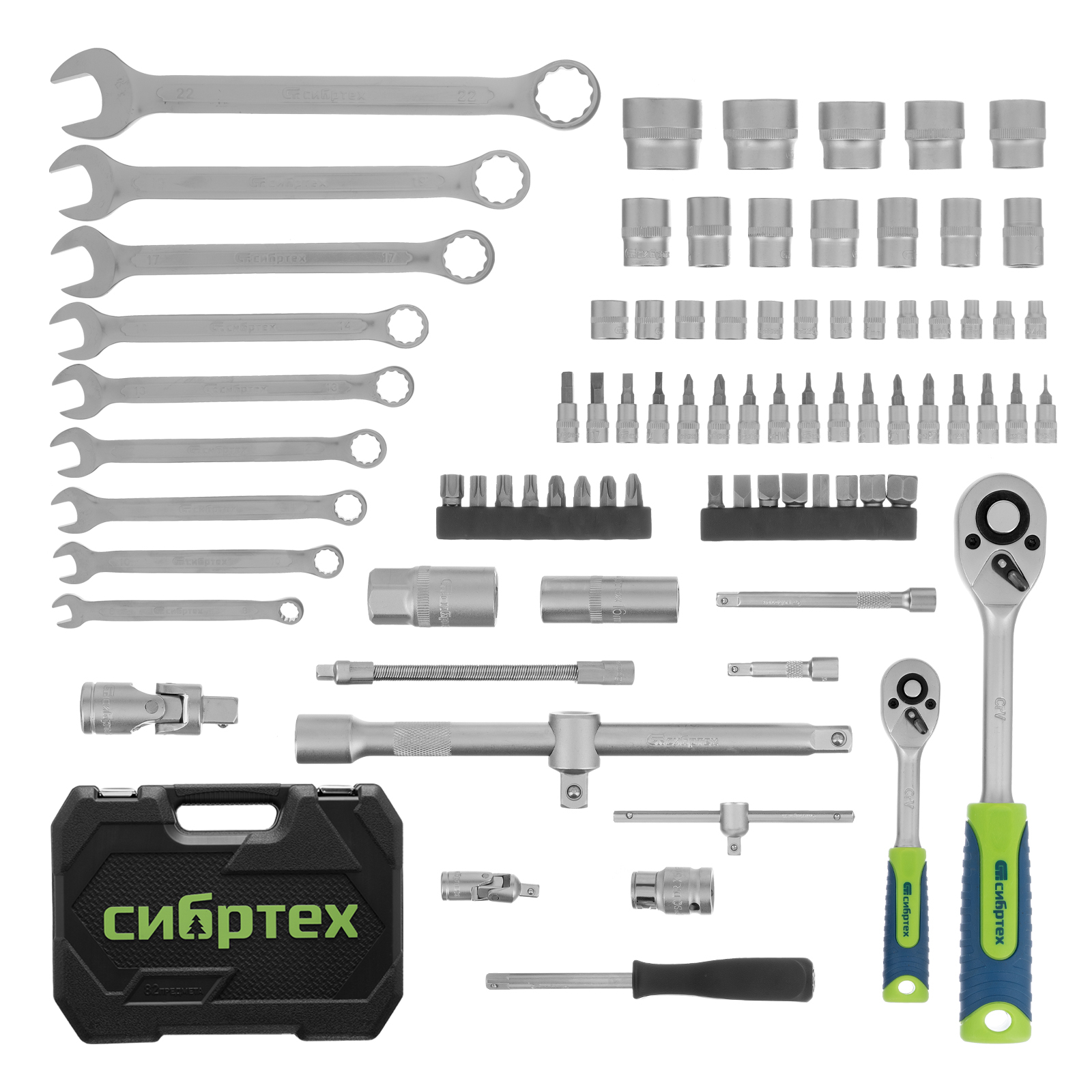 Набор инструментов Сибртех 13391 упакован в пластиковый кейс и состоит из 82 предметов с присоединительным размером 1/2" и 1/4", предназначенных для слесарных работ, преимущественно монтажа и демонтажа резьбового крепежа с разными типами шлицев. В комплект поставки входят карданы, удлинители и переходники, облегчающие работу в труднодоступных местах. Набор используется для ремонта автомобилей, а также полезен в быту.