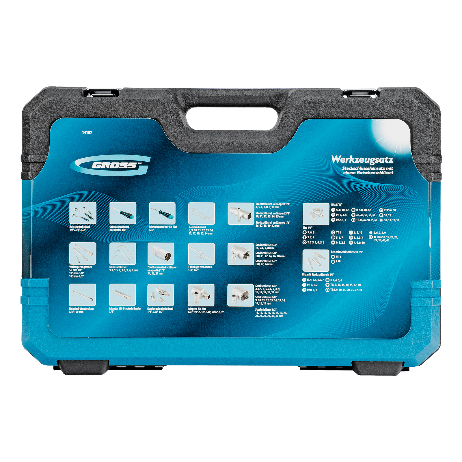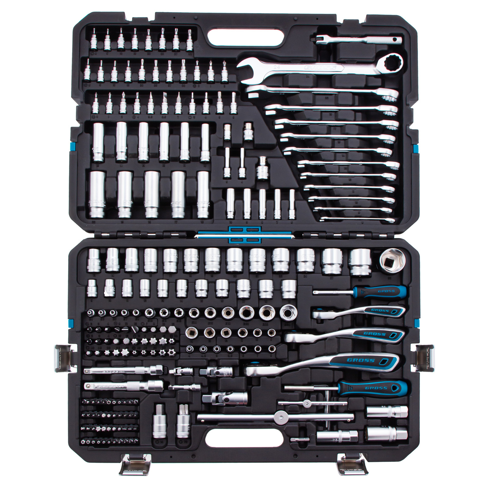 Набор инструментов Gross 14157 включает в себя 216 предметов, в том числе ключи-трещотки из стали CrV со 120 зубьями и присоединительным размером 1/4", 1/2" и 3/8". Входящие в комплект инструменты используются для монтажа и демонтажа резьбовых соединений. Воротки, удлинители и карданные шарниры облегчают работу в стесненных условиях. Набор пригодится водителям, сотрудникам автосервисов, а также домашним мастерам.
