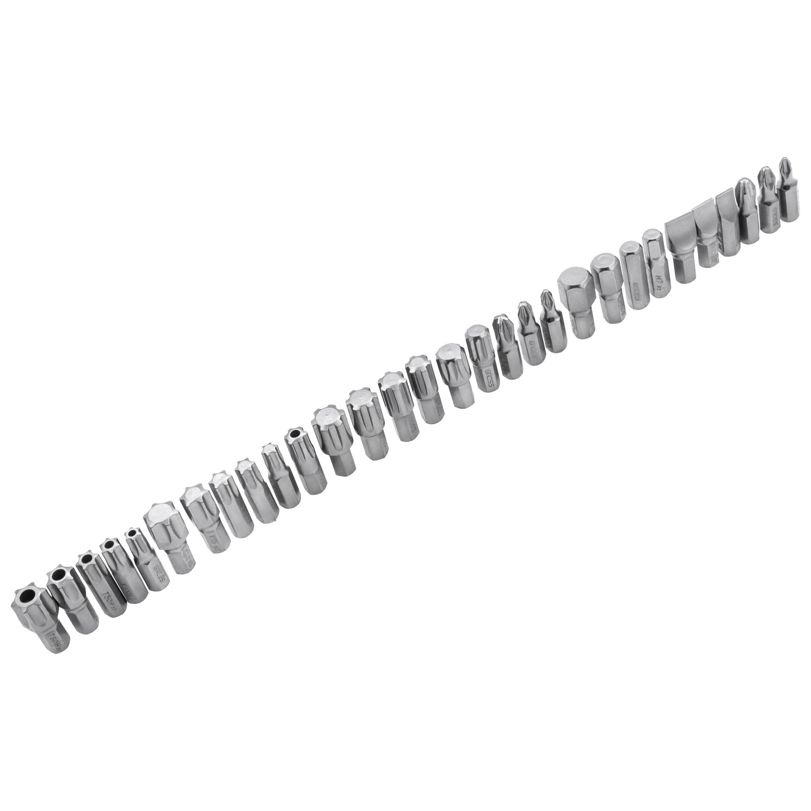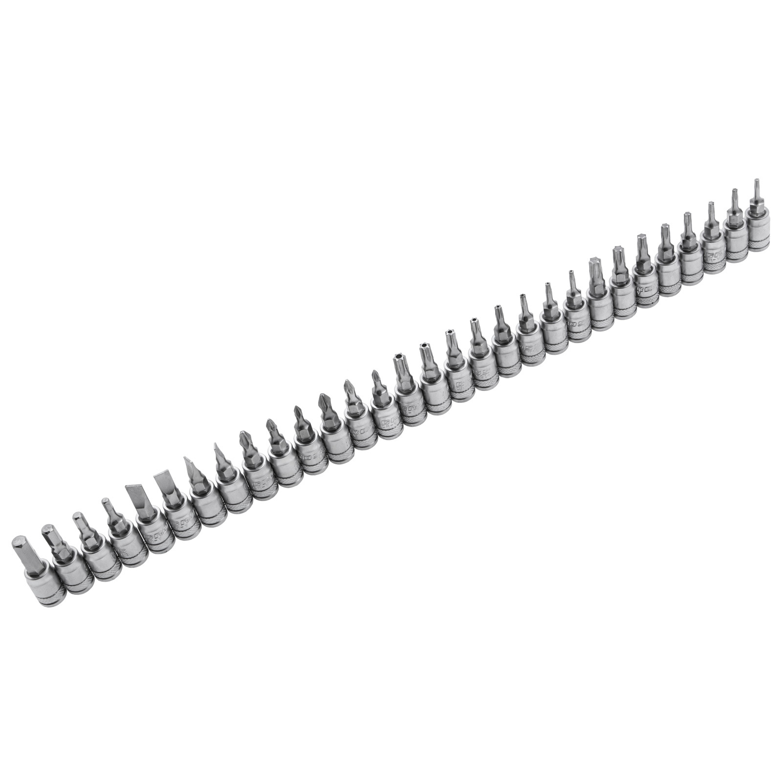 - Исключительная твердость и прочность — биты и шестигранные ключи изготовлены из японской легированной стали S2, остальные элементы набора выполнены из хромованадиевой стали.
