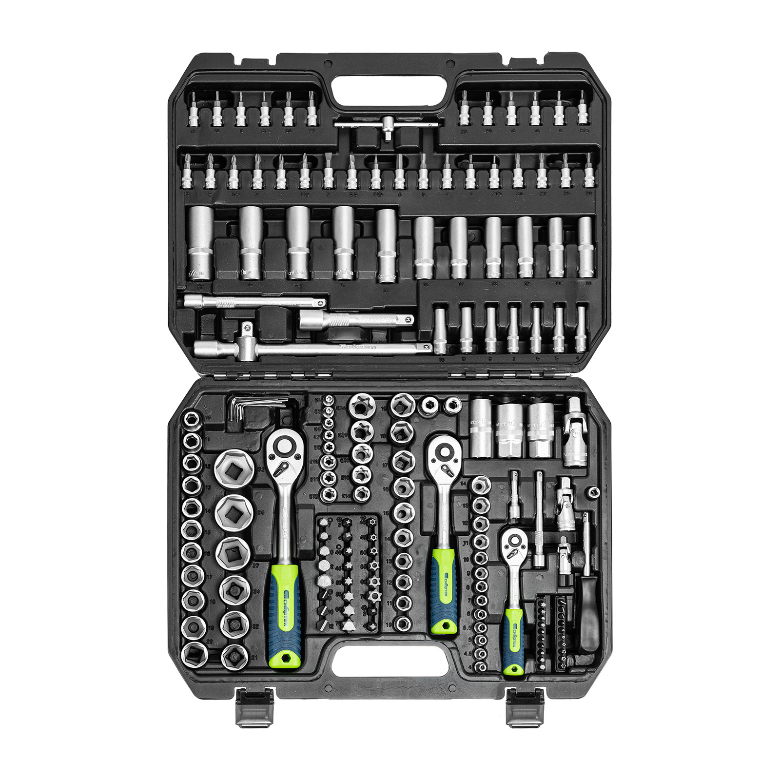 Набор инструментов Сибртех 14171 упакован в пластиковый кейс и состоит из 172 предметов с присоединительным размером 1/2", 3/8", 1/4", предназначенных для монтажа и демонтажа резьбового крепежа с разными типами шлицев. В комплект поставки входят карданы, удлинители и переходники, облегчающие работу в труднодоступных местах. Набор используется для ремонта автомобилей, а также будет полезен в быту.