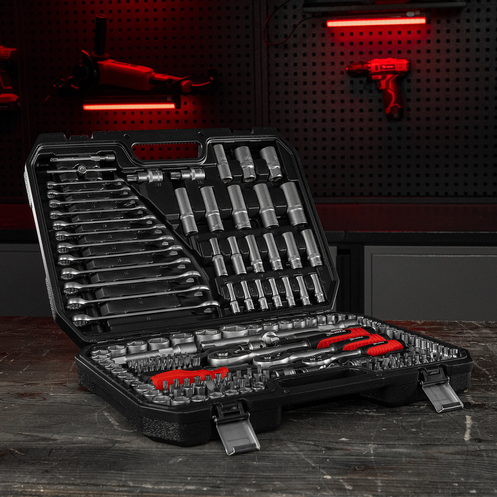Набор инструментов MTX 13589 упакован в пластиковый кейс и состоит из 215 предметов с присоединительным размером 1/2", 3/8", 1/4", предназначенных для монтажа и демонтажа резьбового крепежа с разными типами шлицев. В комплект поставки входят карданы, удлинители и переходники, облегчающие работу в труднодоступных местах. Набор используется для ремонта автомобилей, а также будет полезен в быту.