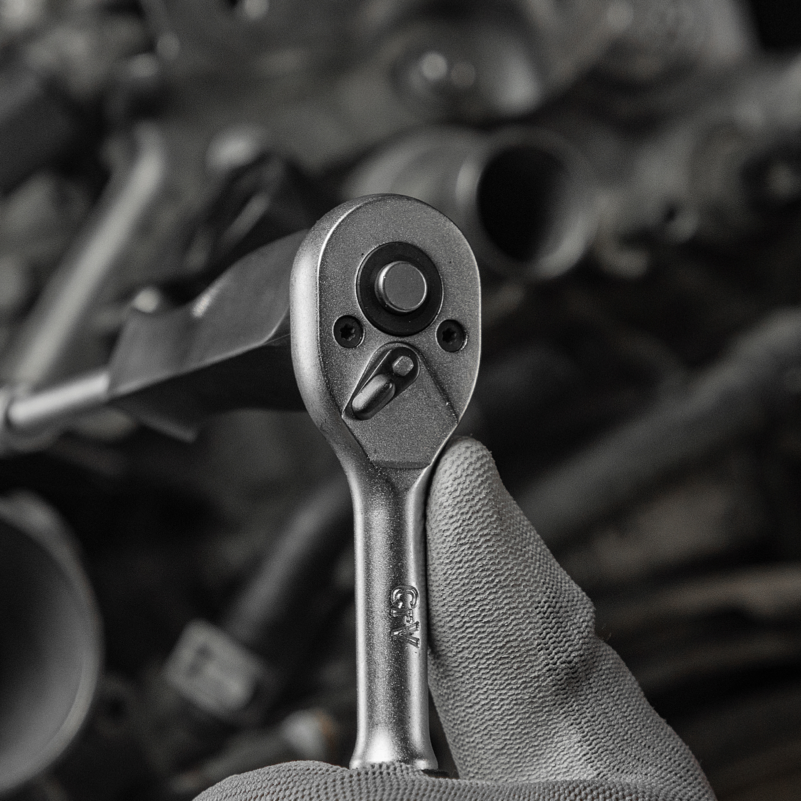 - Комфортная и эффективная работа — ключи-трещотки с 45 зубьями оснащены механизмом быстрого сброса, переключателем реверса с металлическим флажком и двухкомпонентной рукояткой.