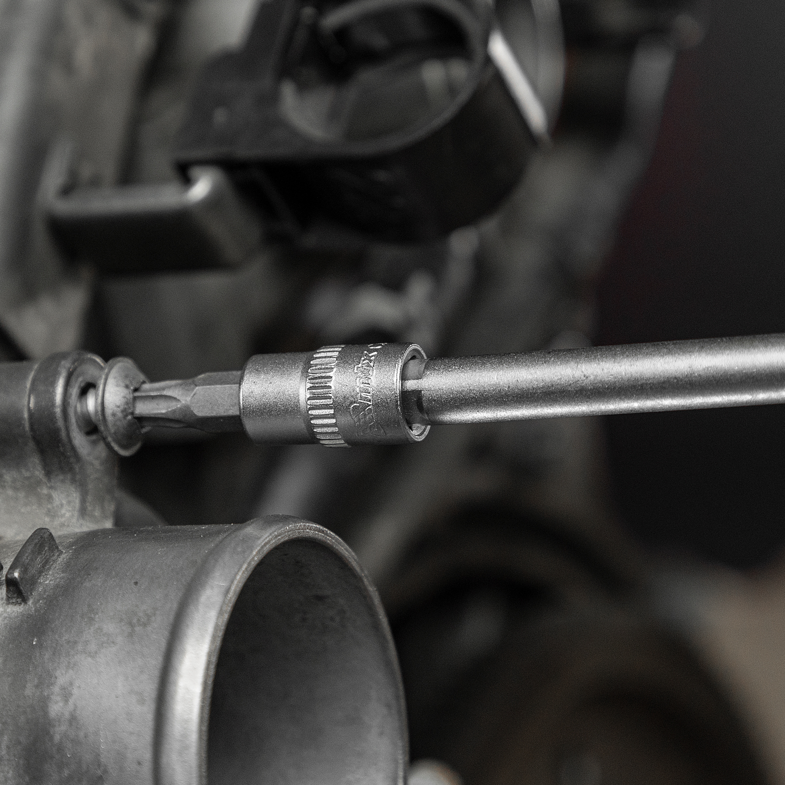 - Прочная фиксация — шариковый замок на трещотках, воротках, шарнирах и удлинителях надежно удерживает торцевые головки.