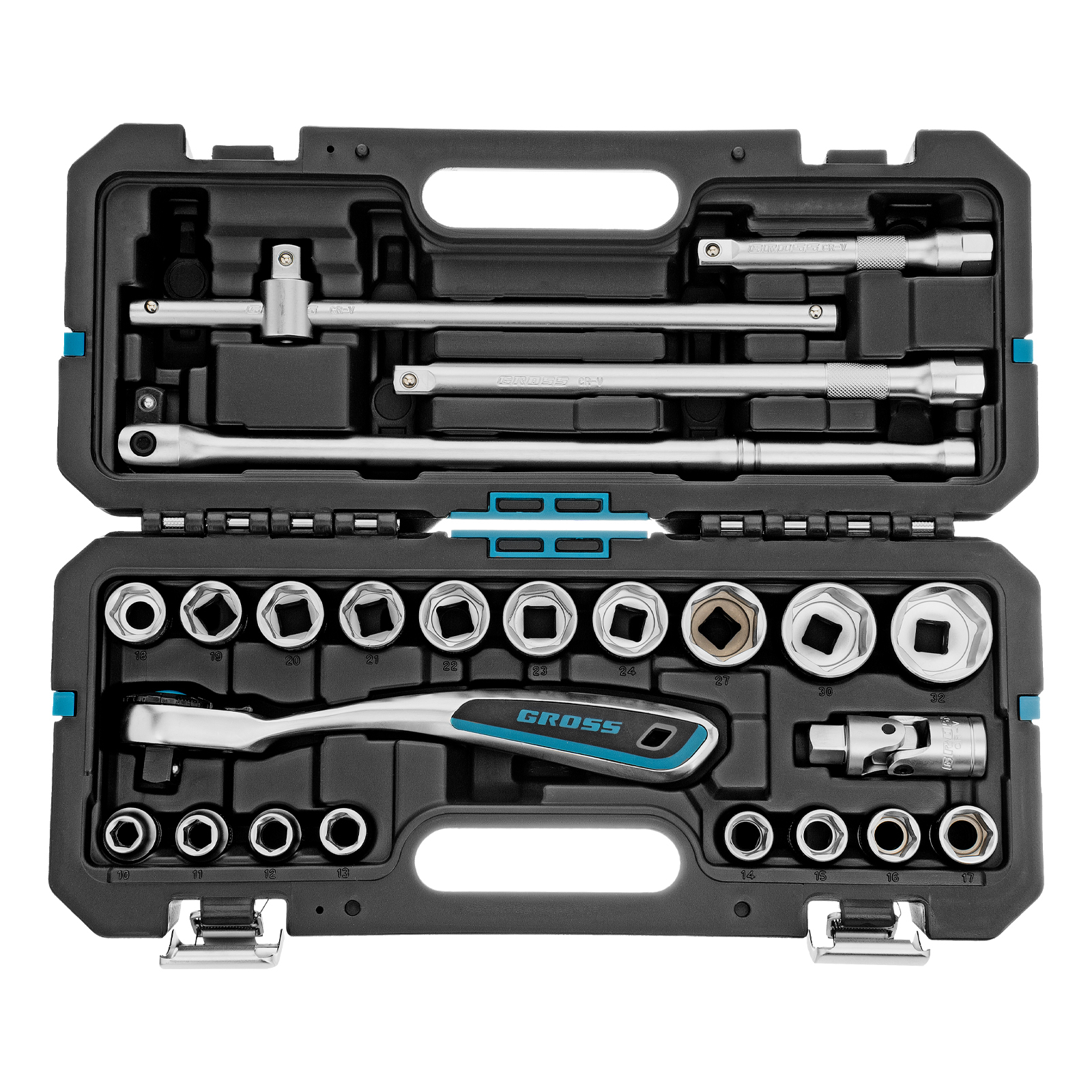 Набор инструментов Gross 14147 из стали CrV используется для закручивания и откручивания резьбового крепежа и включает 24 предмета, в том числе ключ-трещотку со 120 зубьями и присоединительным квадратом 1/2". Комплект адаптирован для работы в труднодоступных местах — для этого предусмотрены удлинители, воротки и карданный шарнир. Набор подойдет для самостоятельного ремонта автомобилей и выполнения бытовых работ.