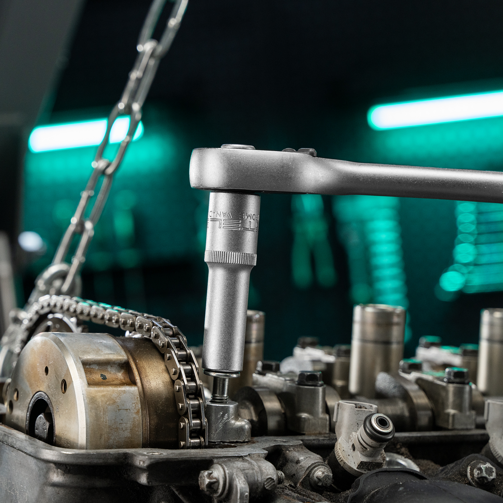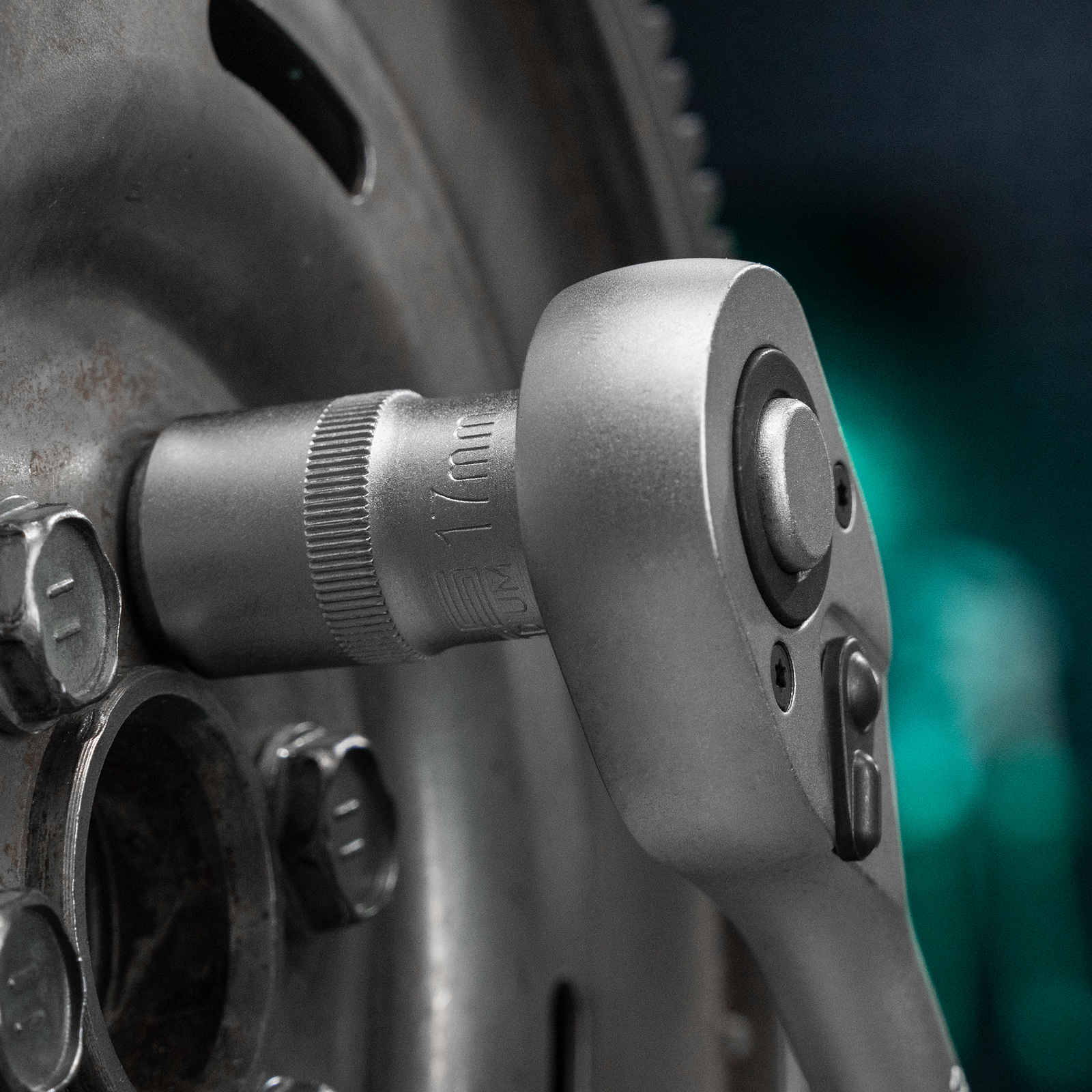 - Защита от разрушения — матовое антикоррозийное покрытие предотвращает появление ржавчины, а рукоятка трещотки из полипропилена и резины устойчива к воздействию бензина и масла.
