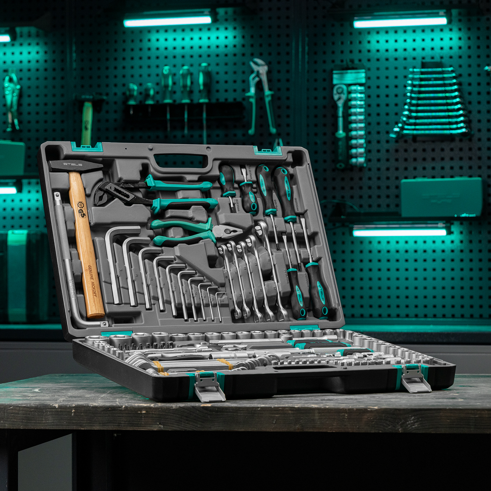 Набор инструментов Stels 14107 в ударопрочным пластиковом кейсе состоит из 142 предметов с присоединительными квадратами 1/2″, 1/4″ и 3/8″, из стали CrV и S2, и предназначен для выполнения слесарно-монтажных работ. Включает инструменты и насадки для работы с резьбовыми крепежами, а также удлинители (в том числе гибкий) и воротки, облегчающие работу в труднодоступных местах. Молоток, плоскогубцы и переставные клещи расширяют возможности использования набора. Набор предназначен для профессионального использования в автомастерской, будет полезен и для решения бытовых задач.