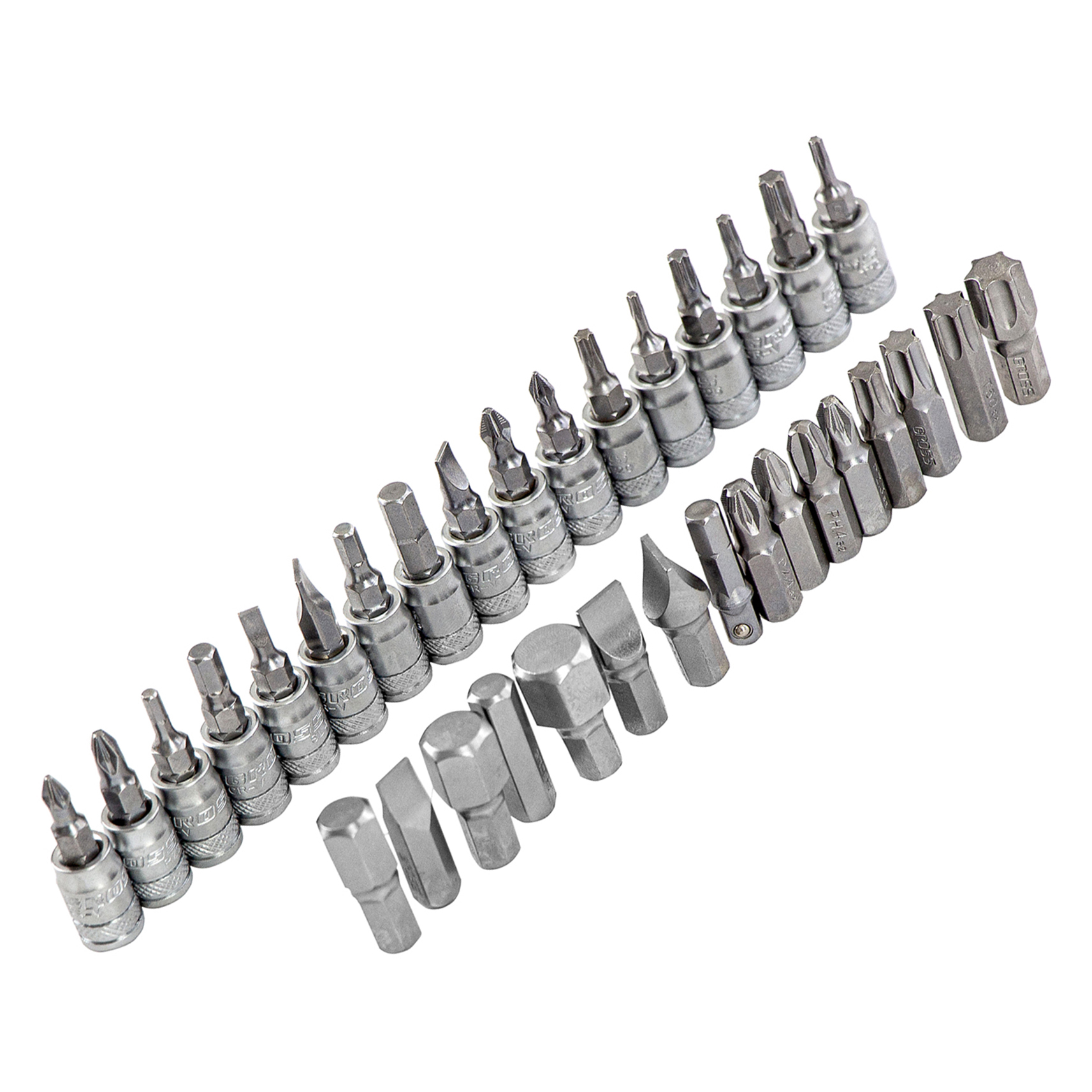 - Исключительная твердость и прочность — биты изготовлены из японской легированной стали S2, остальные элементы набора выполнены из хромованадиевой стали.