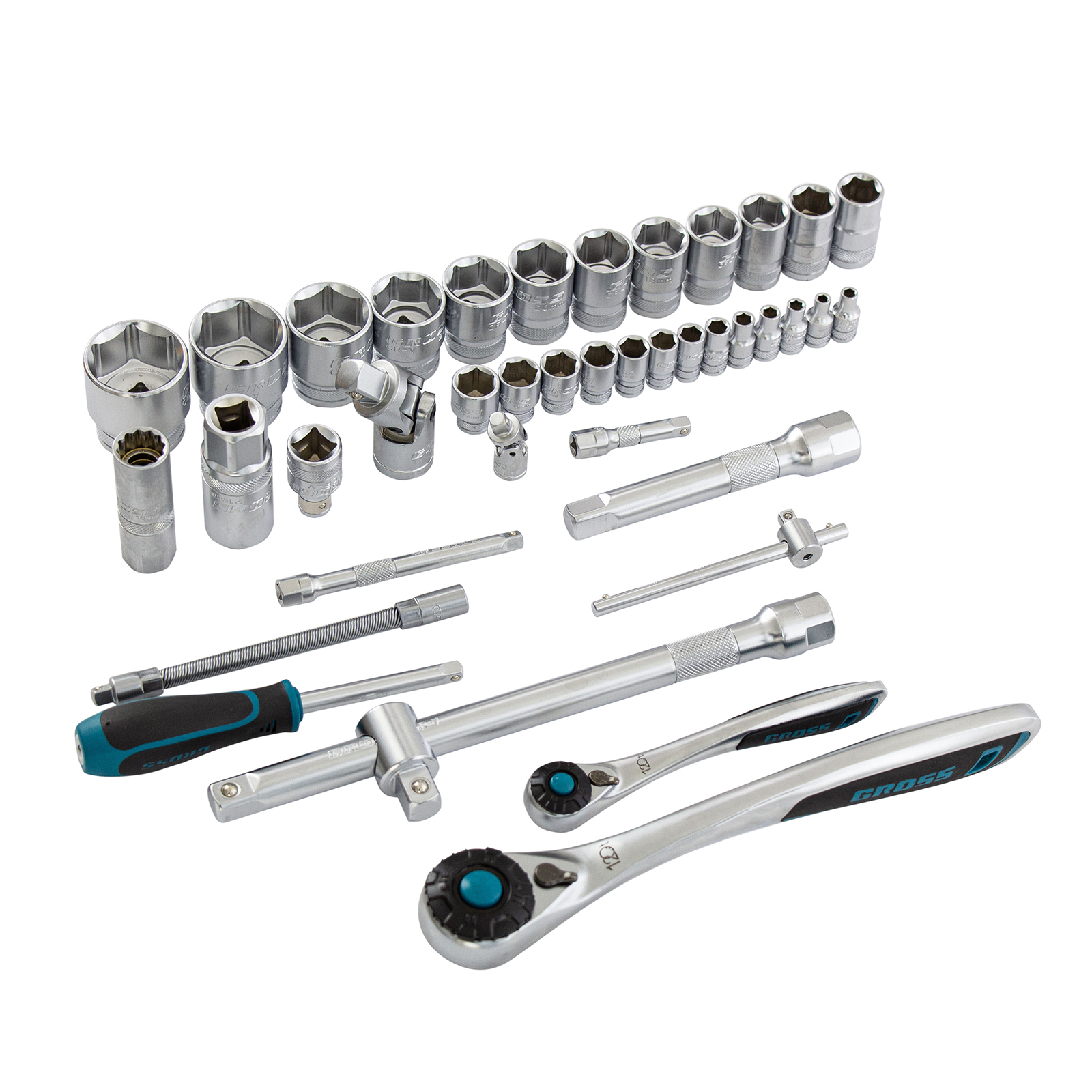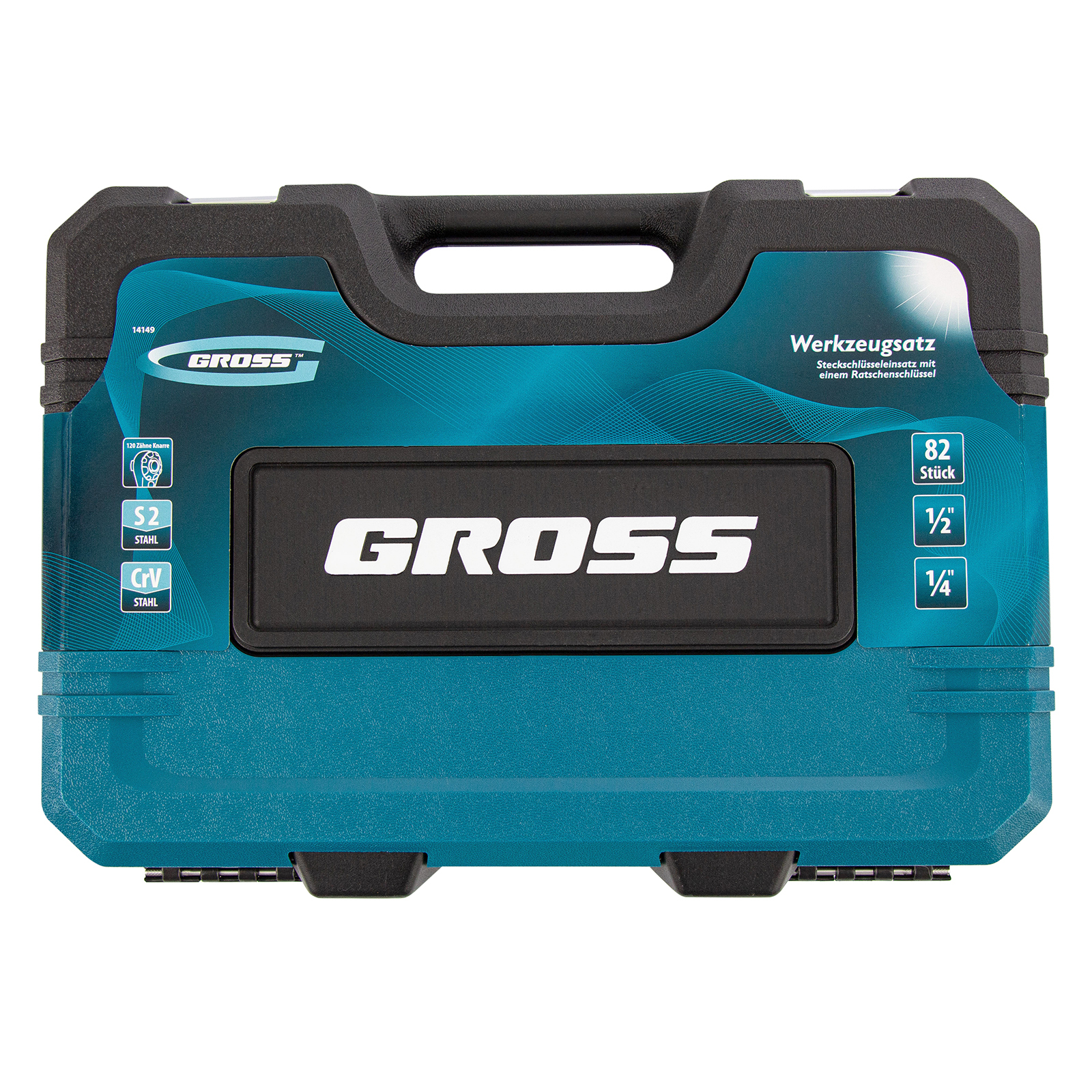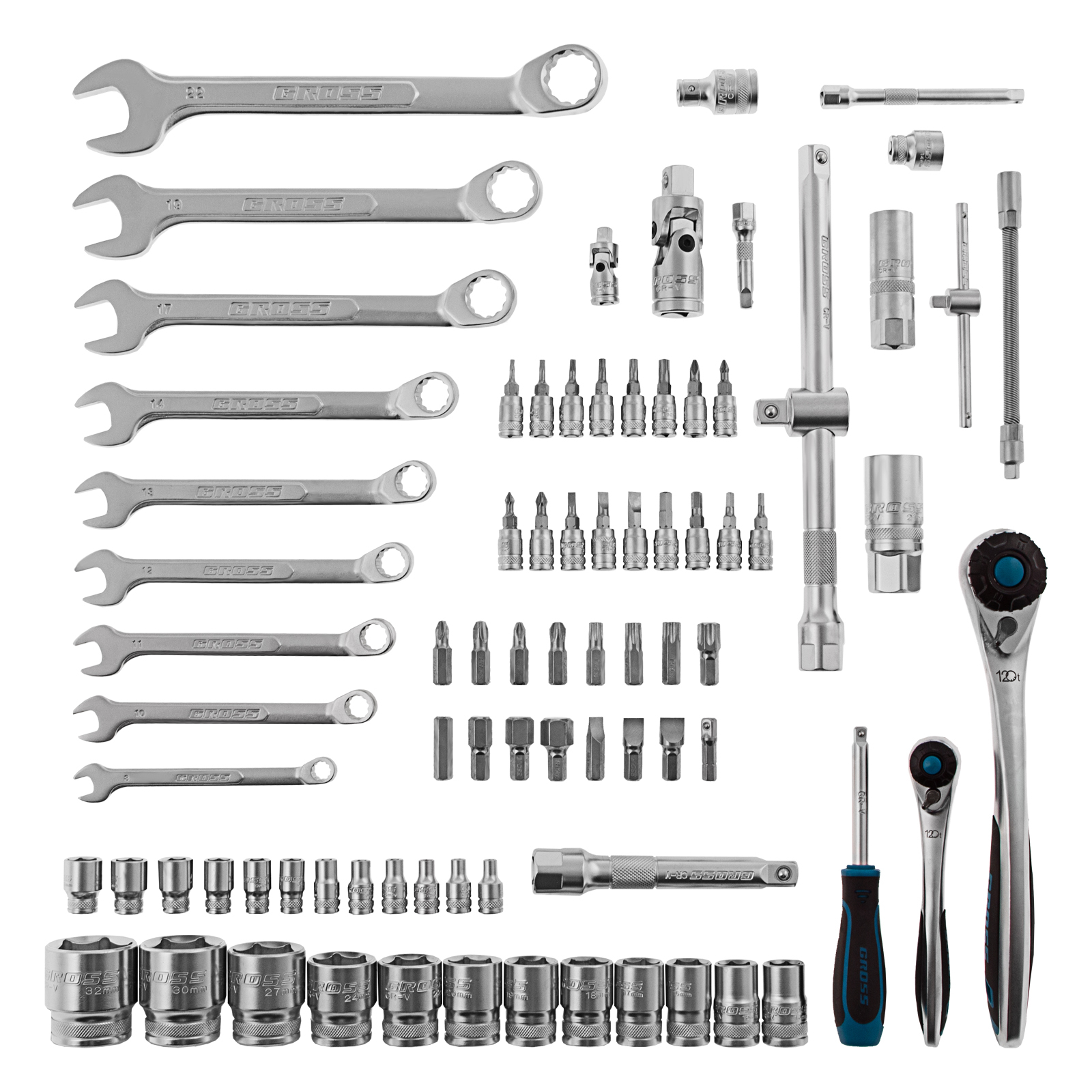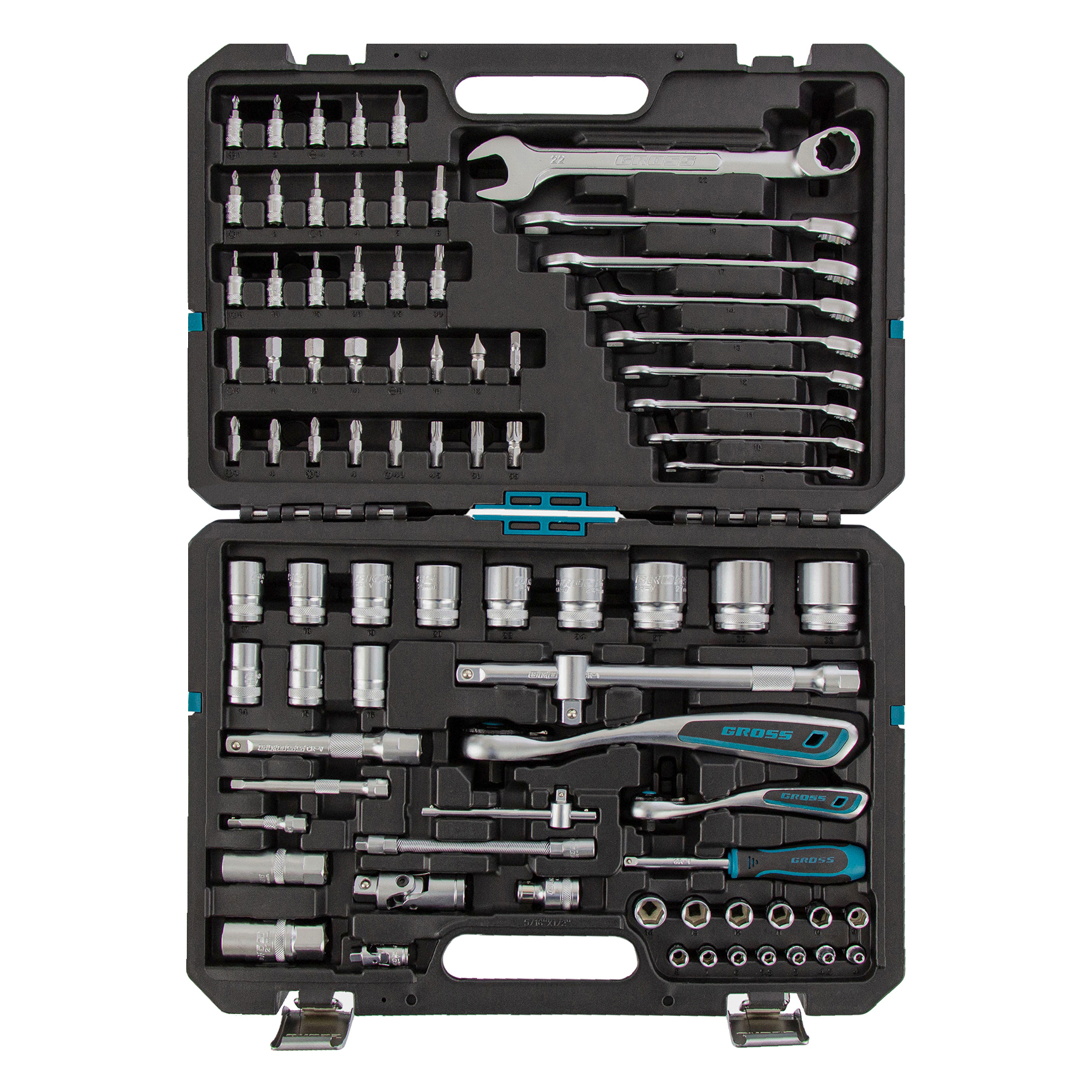 Набор инструментов Gross 14149 включает в себя 82 предмета, в том числе ключи-трещотки из стали CrV со 120 зубьями, с присоединительным размером 1/4" и 1/2". Инструменты используются для монтажа и демонтажа резьбовых соединений. Вороток, удлинители и карданные шарниры облегчают работу в стесненных условиях. Набор пригодится водителям, сотрудникам автосервисов, а также домашним мастерам.