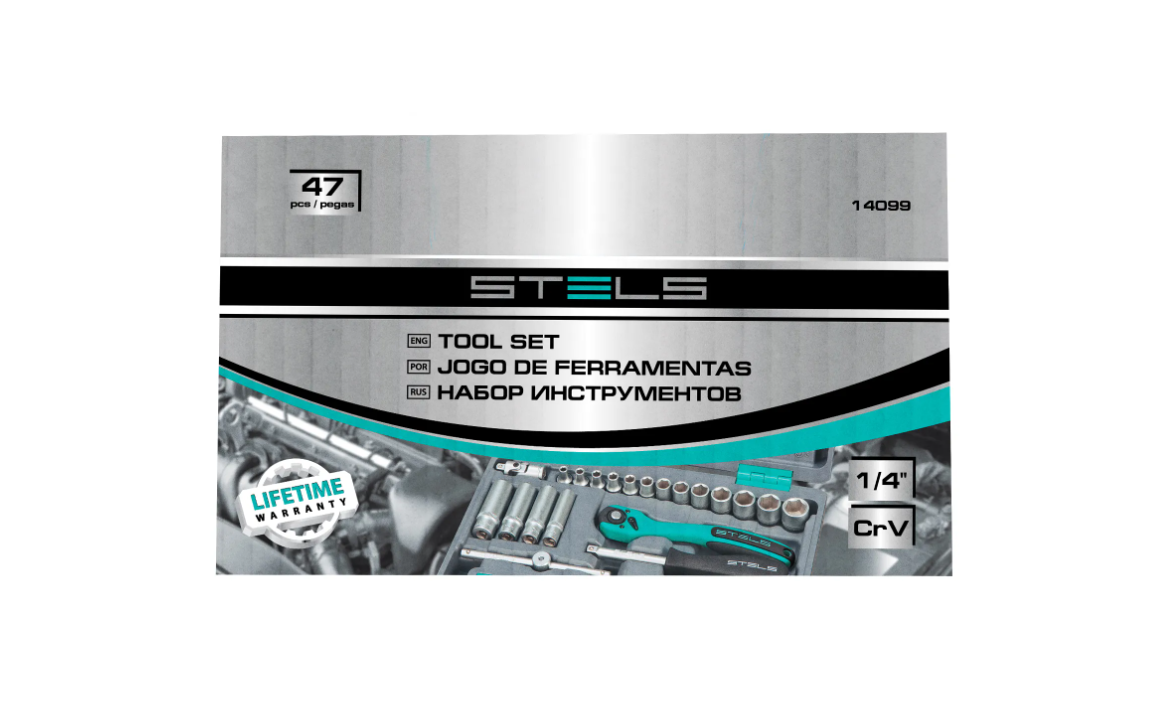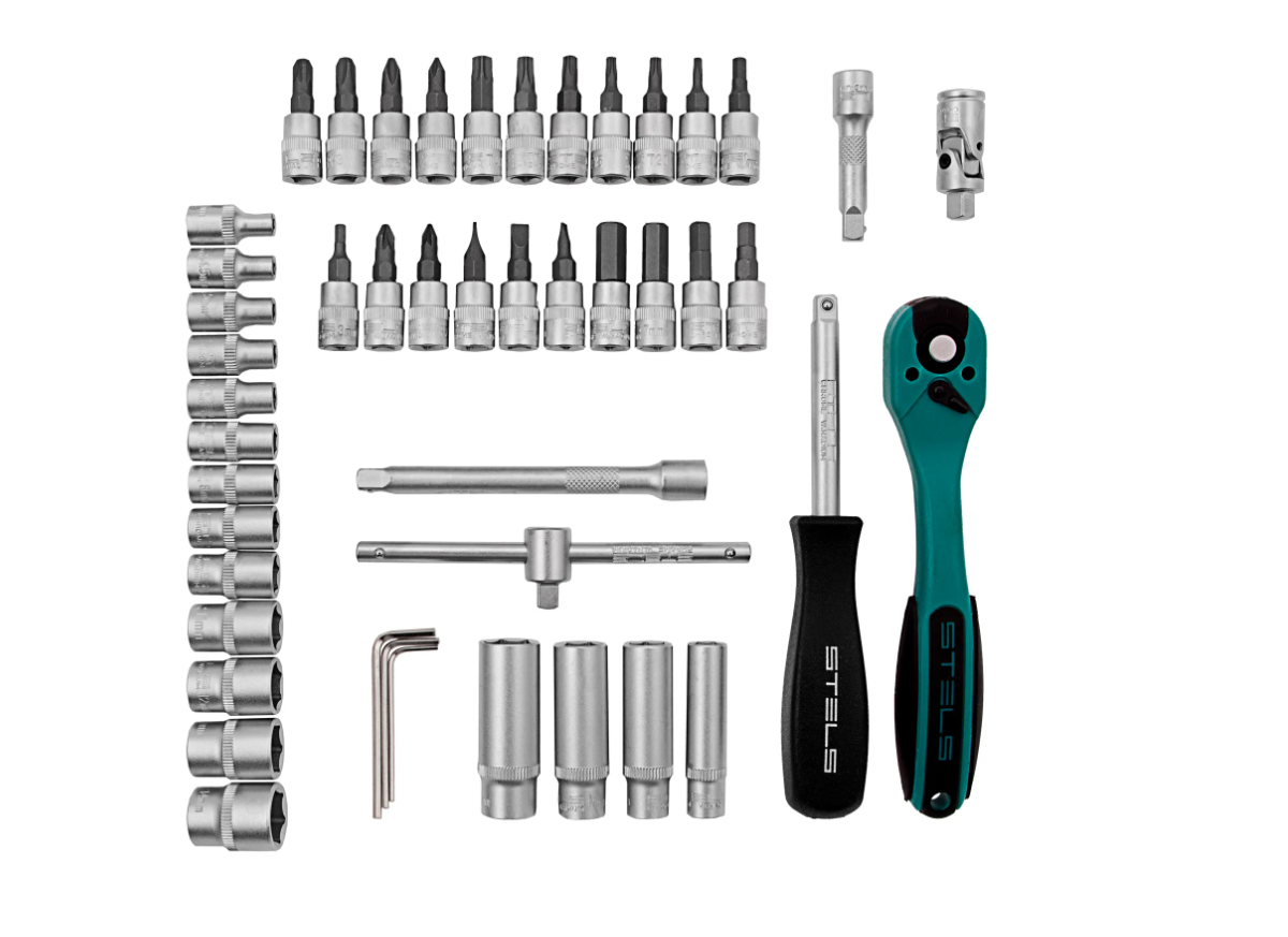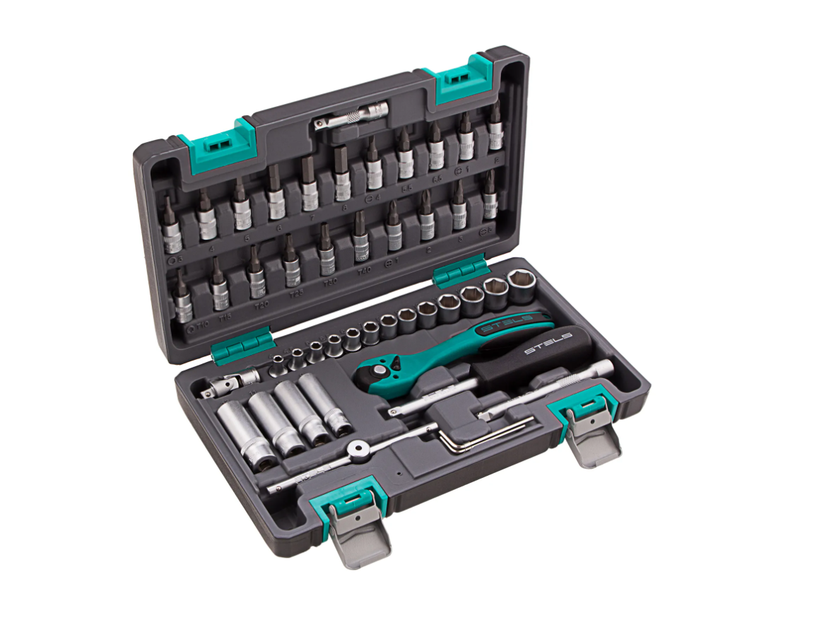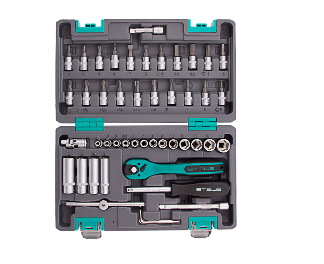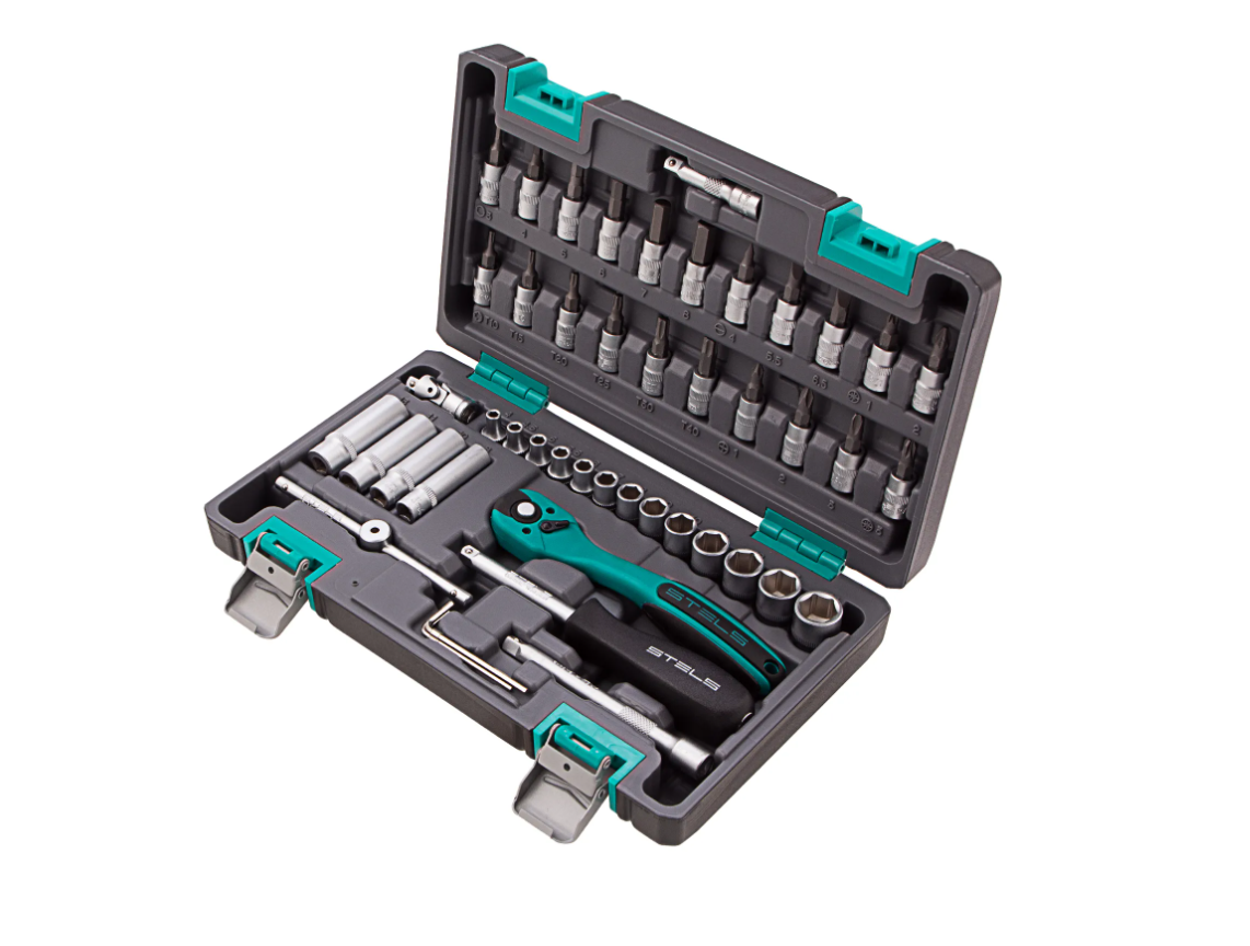 Набор инструментов Stels 14099 в усиленном кейсе включает в себя 47 предметов с присоединительным размером 1/4 дюйма из сталей марок CrV и S2. Он применяется для монтажа и демонтажа резьбовых соединений во время обслуживания и ремонта авто, а также выполнения бытовых работ. Инструменты пригодятся автолюбителям и домашним мастерам.