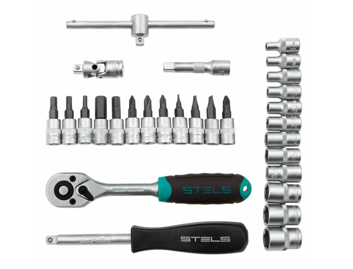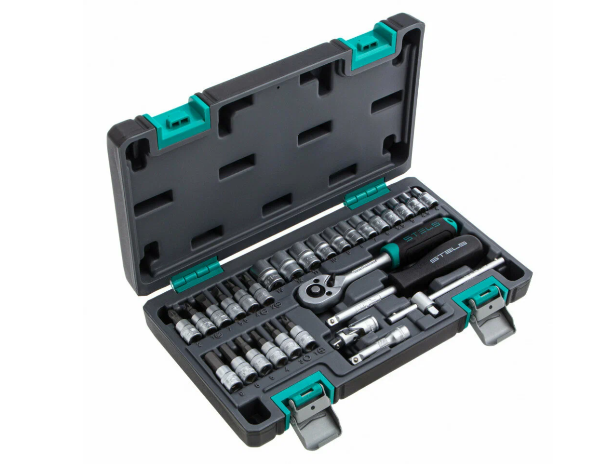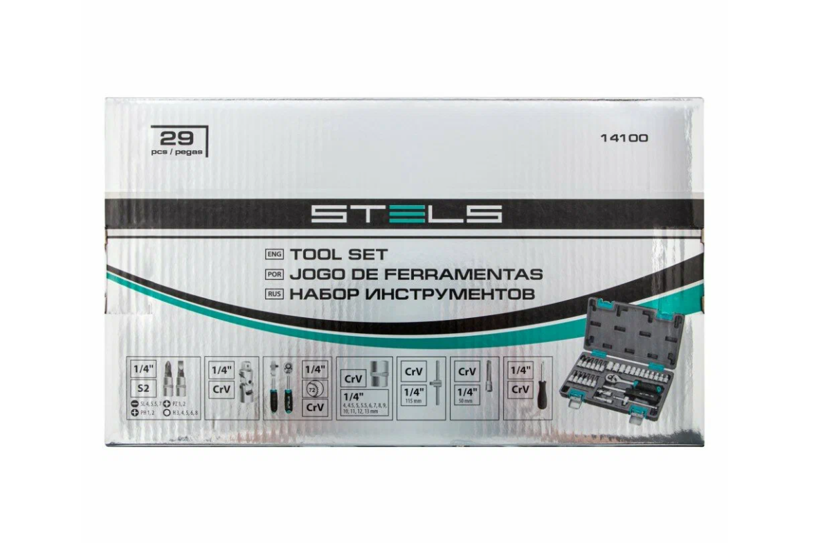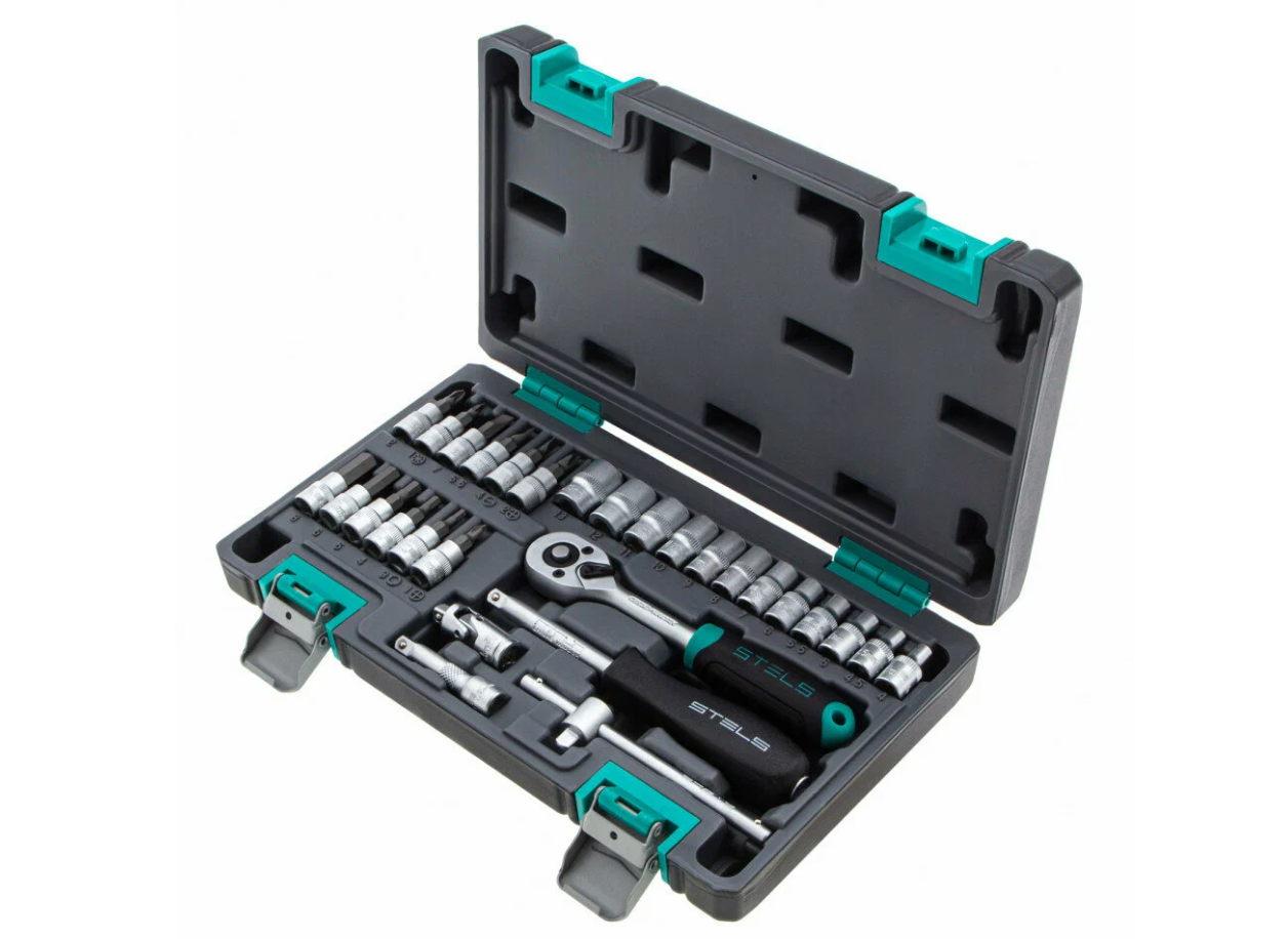 Наборы инструмента торговой марки STELS разработаны специально для автолюбителей и центров технического обслуживания.Каждый этап производства контролируется в соответствии с международными стандартами.Головки и комбинированные ключи изготовлены из хромованадиевой стали, придающей инструменту исключительную твердость в сочетании с легкостью.Биты, биты-вставки и отвертки производятся из стали S2, улучшающей свойства инструмента.Набор комплектуется трещотками с реверсом и быстрым сбросом, трещоточный механизм имеет 72 зуба и обеспечивает исключительную мягкость и плавность в работе.Шаг зуба 5 град.Все наборы упакованы в кейс, изготовленный из жесткого противоударного пластика, с металлическими застежками.Наборы инструмента STELS пригодятся вам не только в автомобиле.С их помощью можно проводить бытовой ремонт дома и на даче, ремонт бытовых конструкций и садовой техники.На все наборы инструментов STELS предоставляется пожизненная гарантия (подробнее об условиях гарантии вы можете узнать из гарантийного талона).Состав набора:Ключ трещоточный 1/4.Головки торцевые 1/4: 4, 4.5, 5, 5.5, 6, 7, 8, 9, 10, 11, 12, 13.Кардан 1/4.Удлинители 1/4: 50 мм и 100 мм.Отвертка-держатель 1/4.Вороток Т-образный 1/4.Головки торцевые 1/4 со вставкой: H3, H4, H5, H6, H8, SL4, SL5.5, SL7, PH1, PH2, PZ1, PZ2.