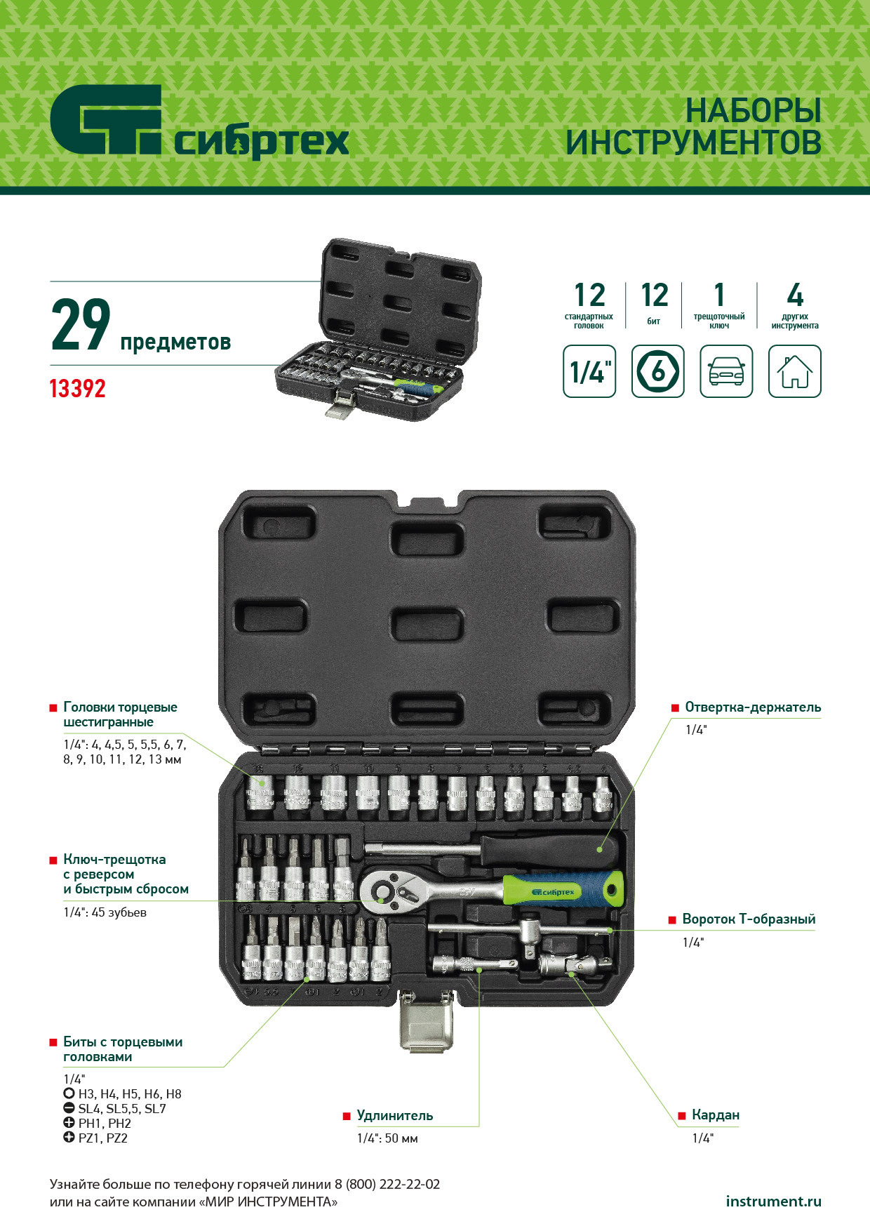 Набор инструментов Сибртех 13392, поставляющийся в пластиковом кейсе, состоит из 29 предметов с присоединительным размером 1/4", предназначенных для работы с резьбовыми соединениями. В комплект поставки входят кардан, удлинитель и вороток, упрощающие работу в труднодоступных местах. Набор будет полезен автолюбителю и домашнему мастеру.