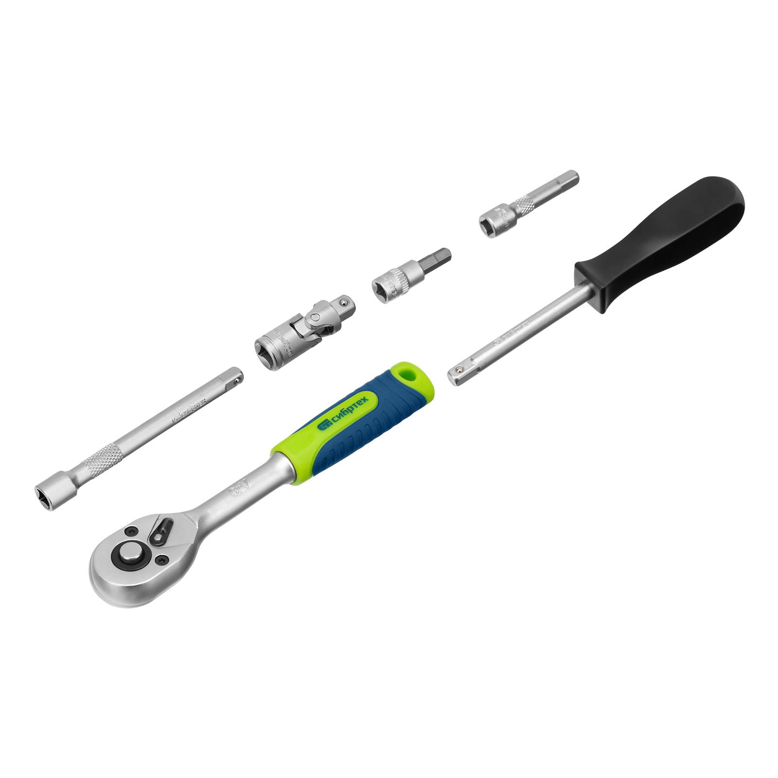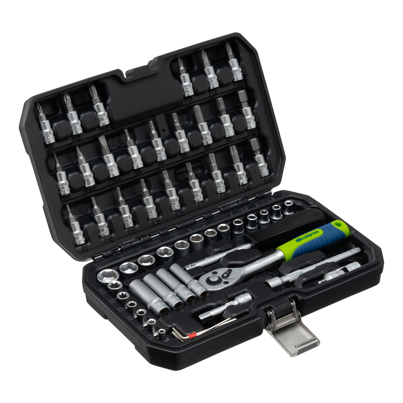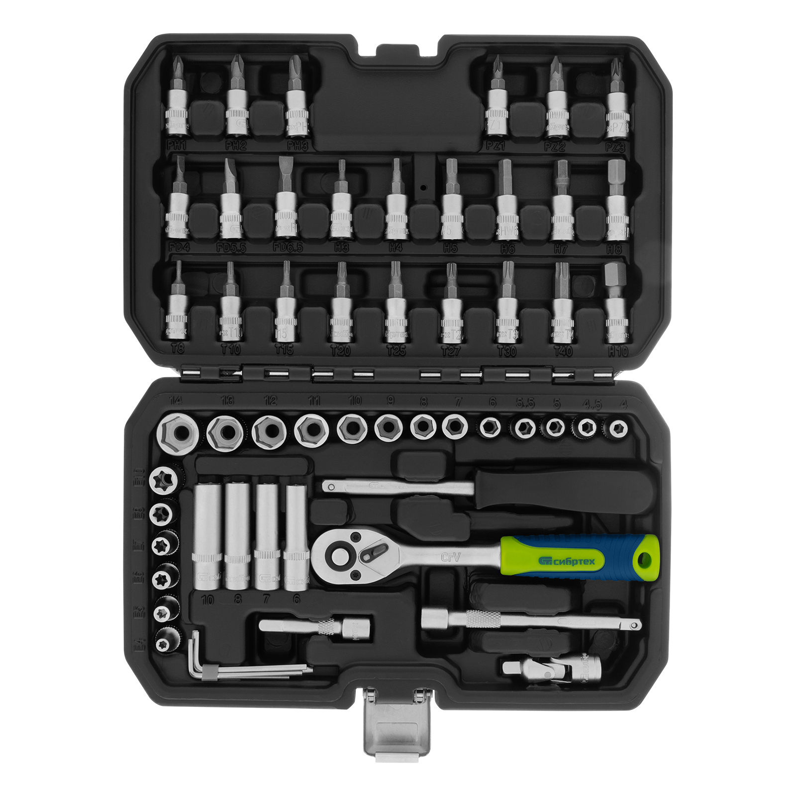 Набор инструментов Сибртех 13399, поставляющийся в пластиковом кейсе, состоит из 56 предметов с присоединительным размером 1/4", предназначенных для закручивания и откручивания резьбового крепежа. В комплект поставки входят 2 удлинителя и кардан, облегчающие работу в труднодоступных местах. Набор будет полезен для ремонта автомобиля в гараже, пригодится также и в быту.
