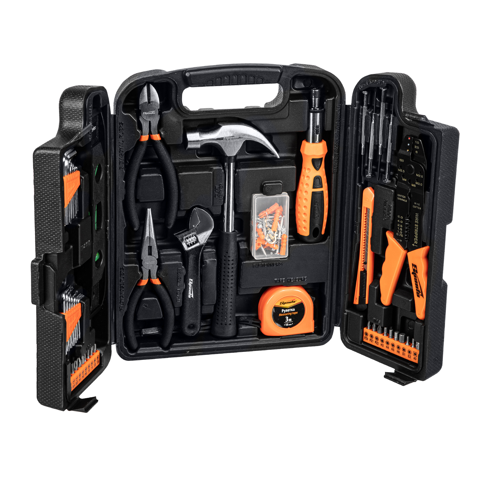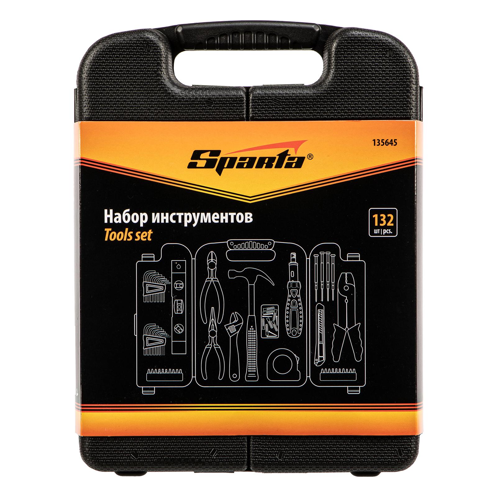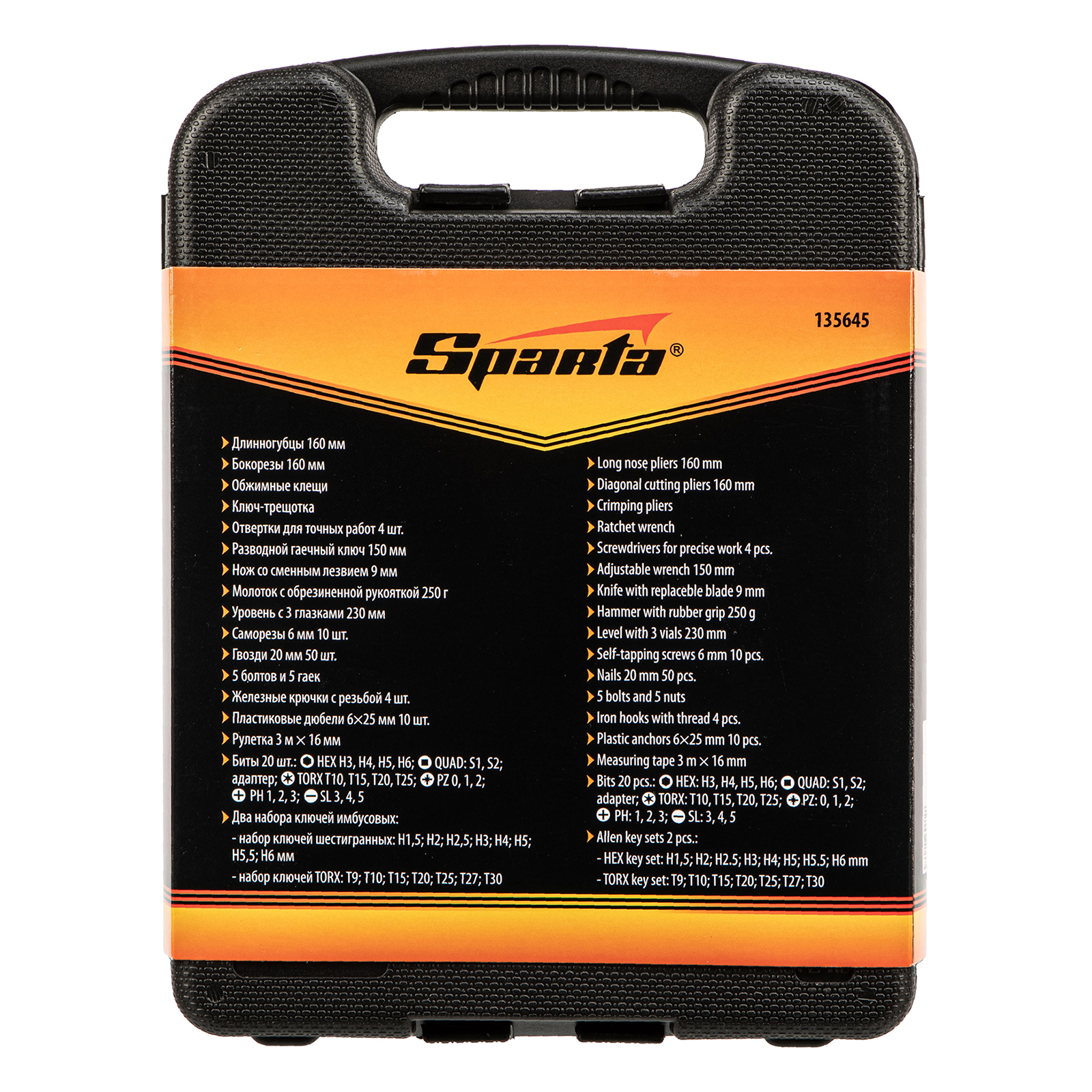 Набор инструментов Sparta 135645 включает в себя 132 предмета для бытового применения: обжимные клещи, отвертки, в том числе для точных работ, молоток-гвоздодер, бокорезы, строительный уровень, разводной и имбусовые ключи, биты-вставки с адаптером, длинногубцы, рулетку, канцелярский нож, а также набор крепежа. Инструменты оптимально подходят для выполнения слесарно-монтажных работ дома или на даче.