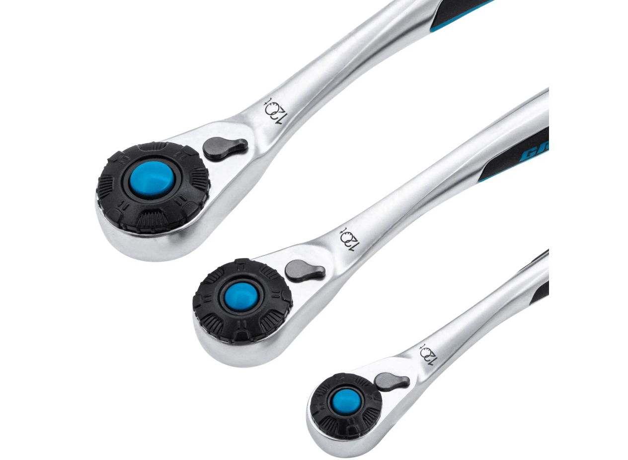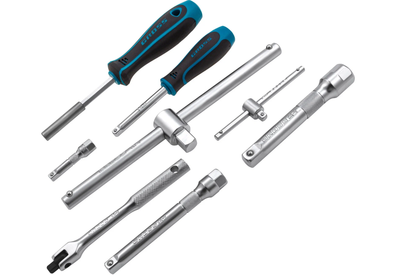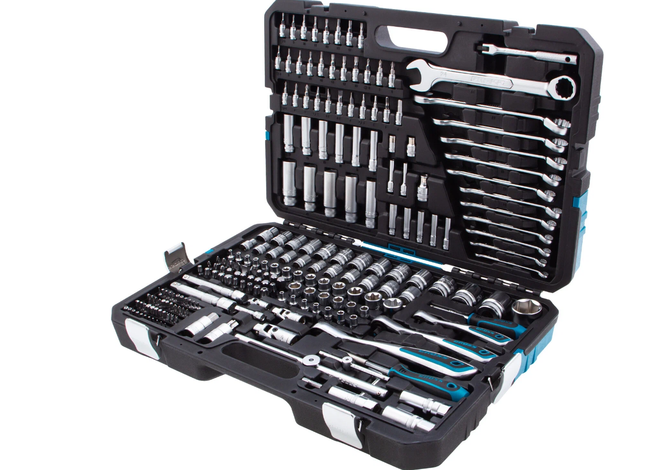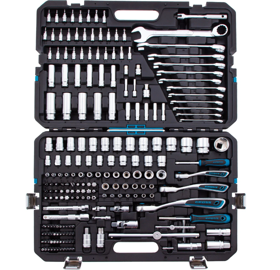 Набор инструментов Gross 14157 включает в себя 216 предметов, в том числе ключи-трещотки из стали CrV со 120 зубьями и присоединительным размером 1/4", 1/2" и 3/8". Входящие в комплект инструменты используются для монтажа и демонтажа резьбовых соединений. Воротки, удлинители и карданные шарниры облегчают работу в стесненных условиях. Набор пригодится водителям, сотрудникам автосервисов, а также домашним мастерам.