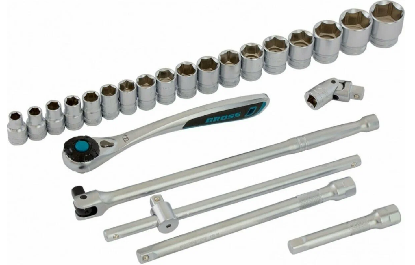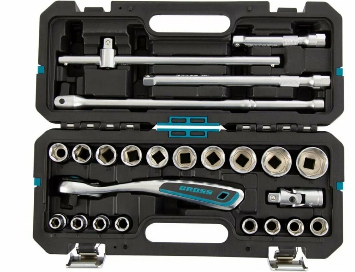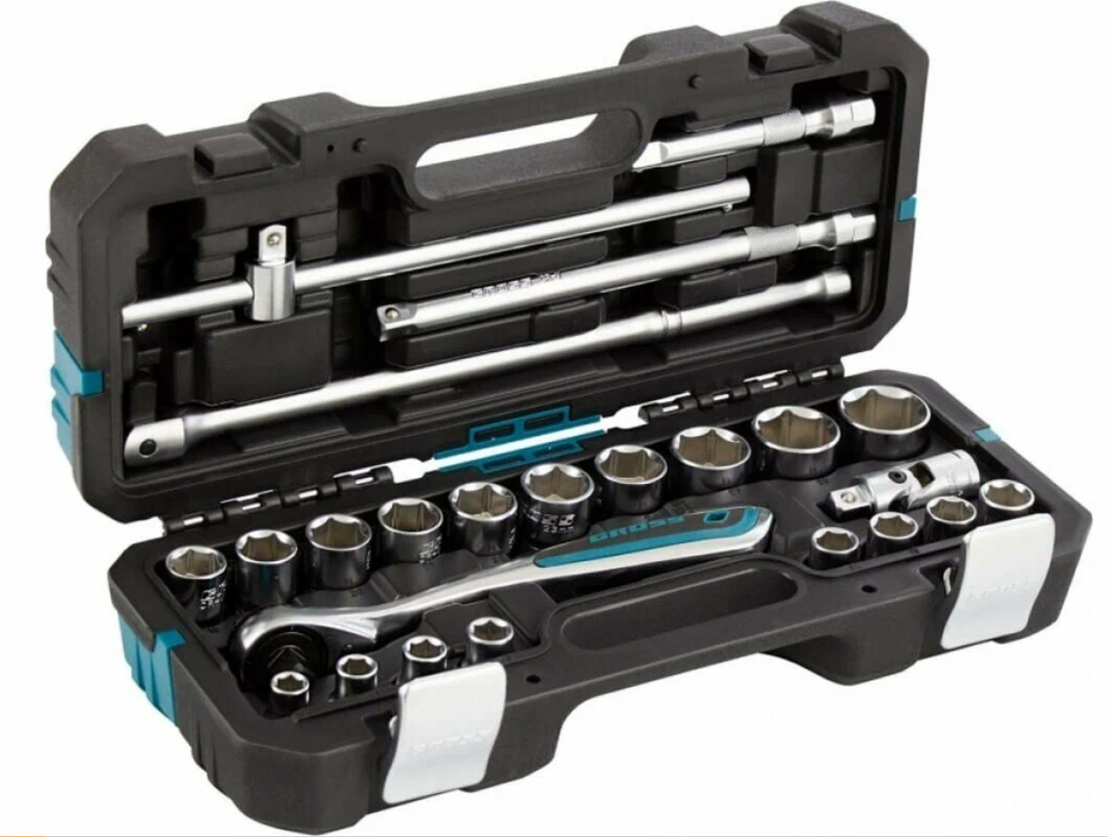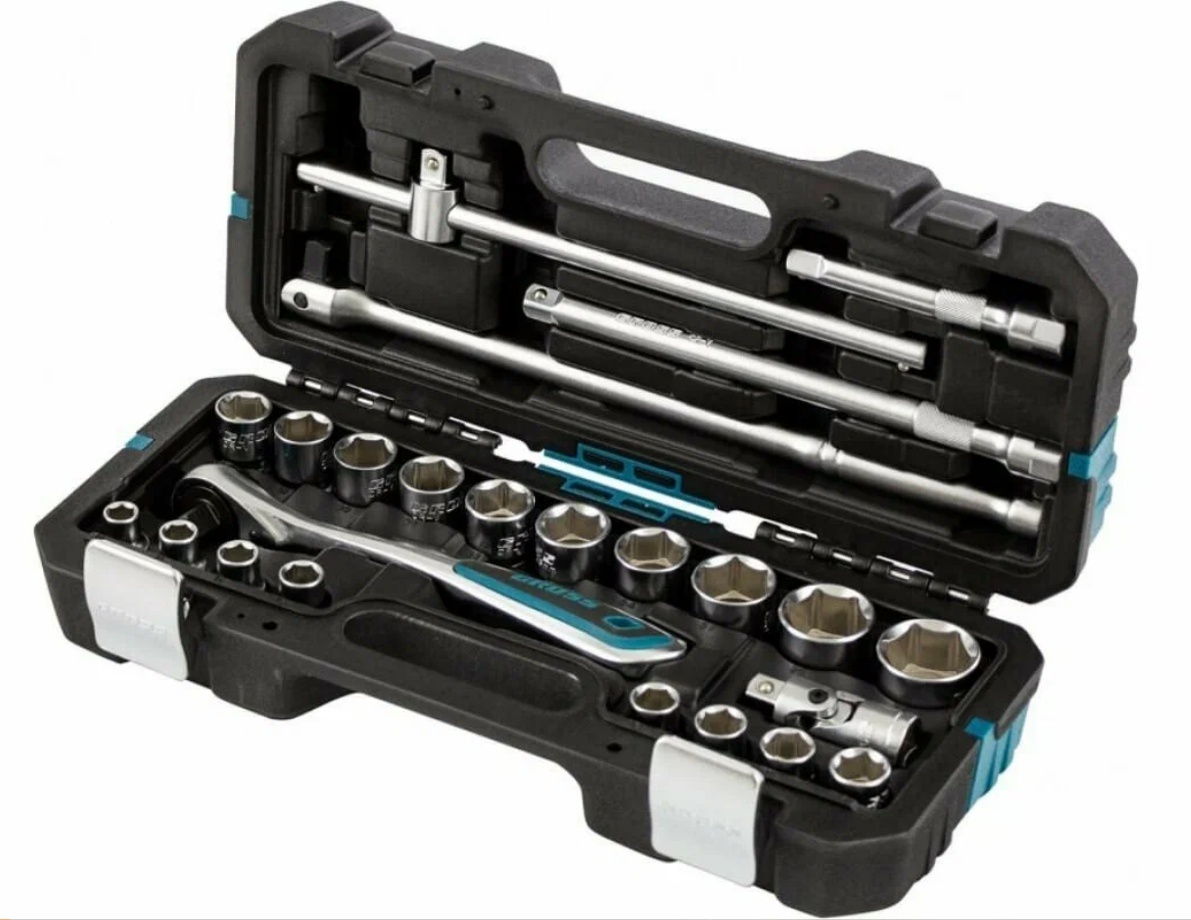 С трещоткой: есть; Гаечные ключи: нет; Шарнирно-губцевые инструменты: нет; Тип: набор инструментов; Головки: есть; Отвертки: нет; Кейс (сумка) в комплекте: есть; Количество предметов: 24;