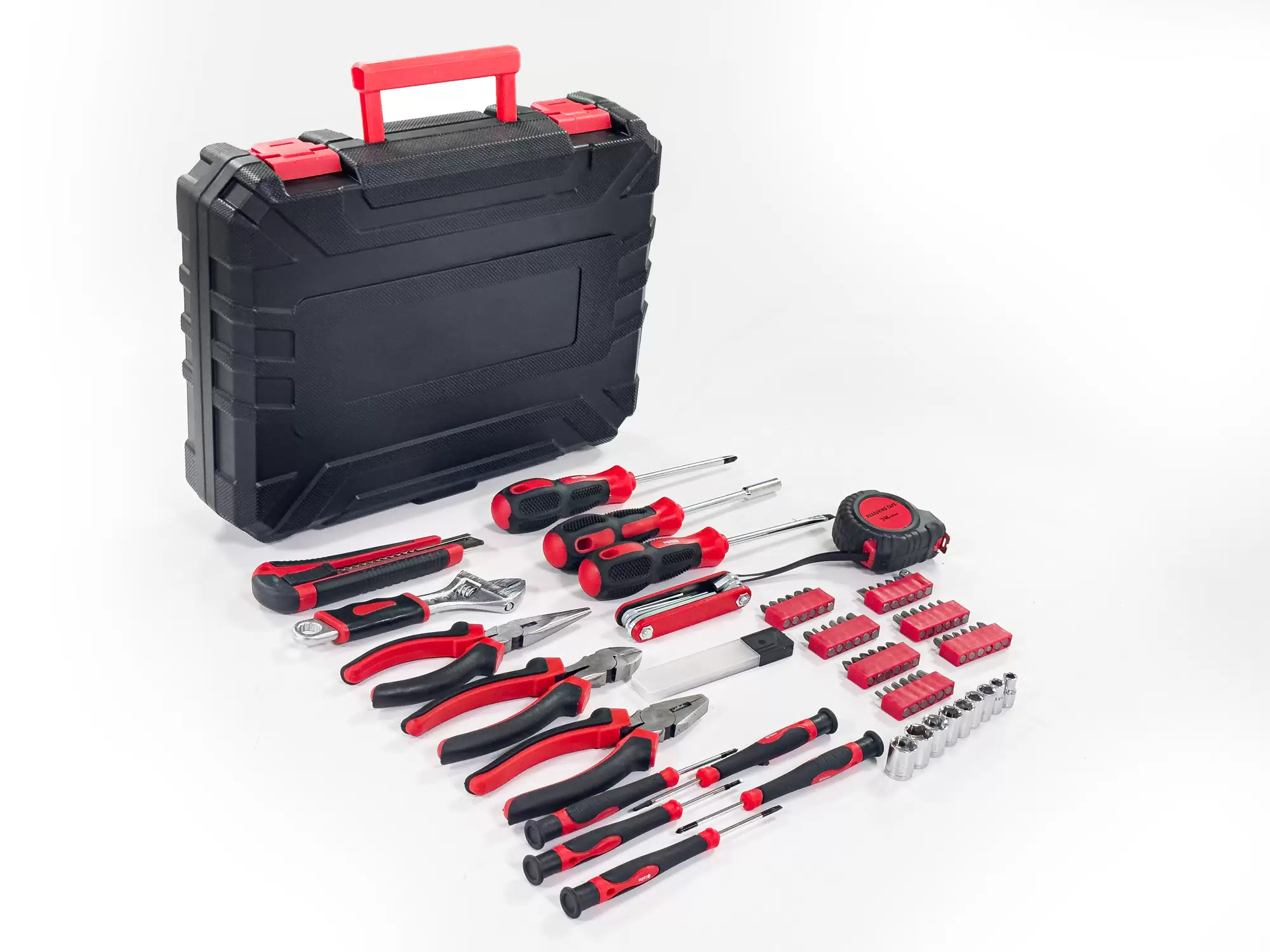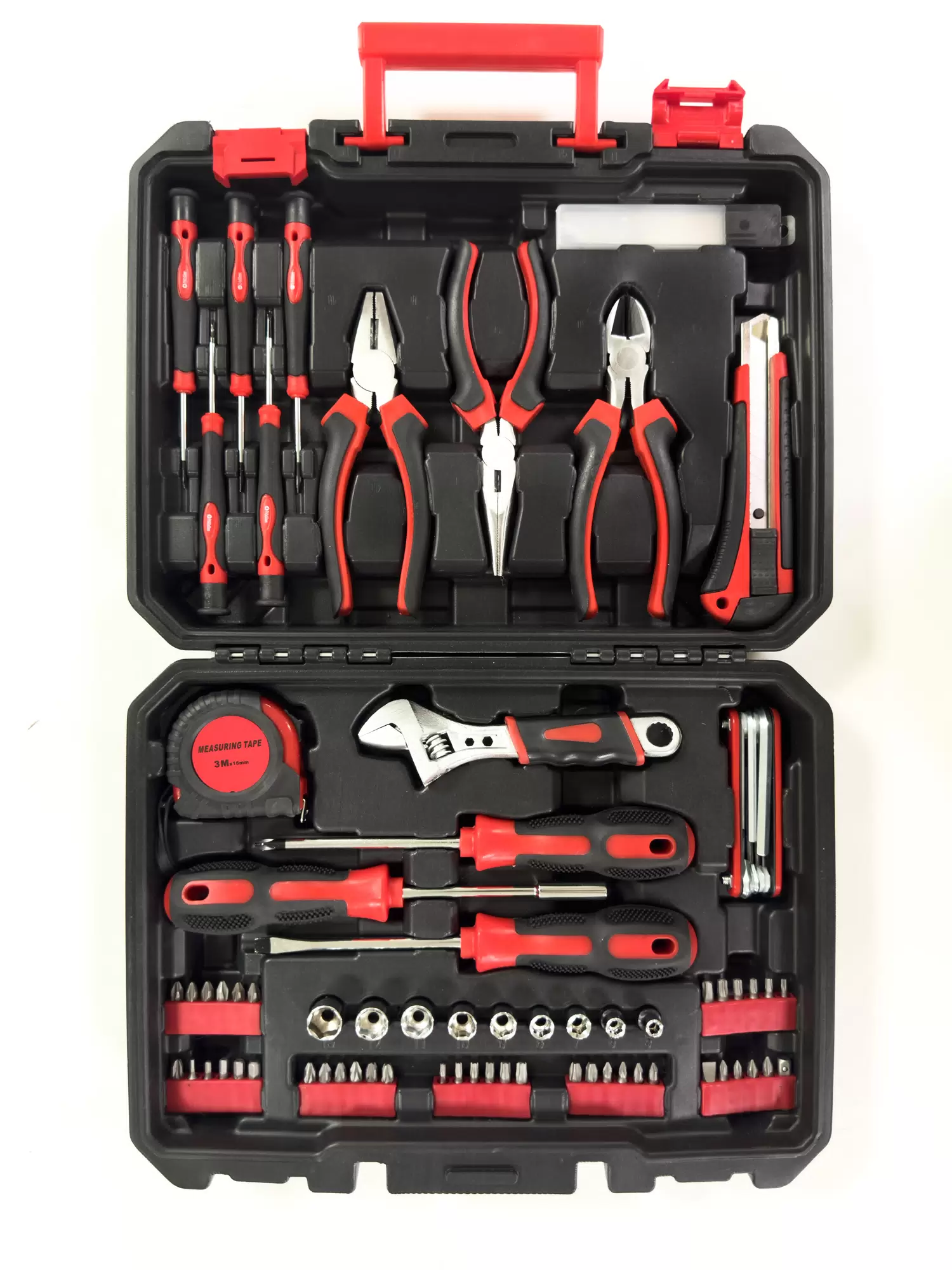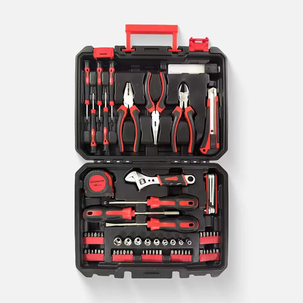 Универсальный набор инструментов состоит из 82 предметов. Предназначен для монтажа и демонтажа узлов и деталей. Изготовлены из хромованадиевой стали — прочный материал, устойчив к коррозии. Рукоятки выполнены из маслобензостойкой резины — эргономичные, не скользят в руке. Конструкция трещоток позволяет работать в ограниченном пространстве. В комплекте: удлинители, Т-образный воротники, трещотки, шарниры, головки, переходники, ключи и отвертки. Кейс сделан из пластика с металлическими замками — ударопрочный, защищает от воздействия влаги. Бокс упрощает поиск и подбор инструмента или оснастки. Подходит для ремонта автомобиля, садовой и бытовой техники, а также сборки мебели.