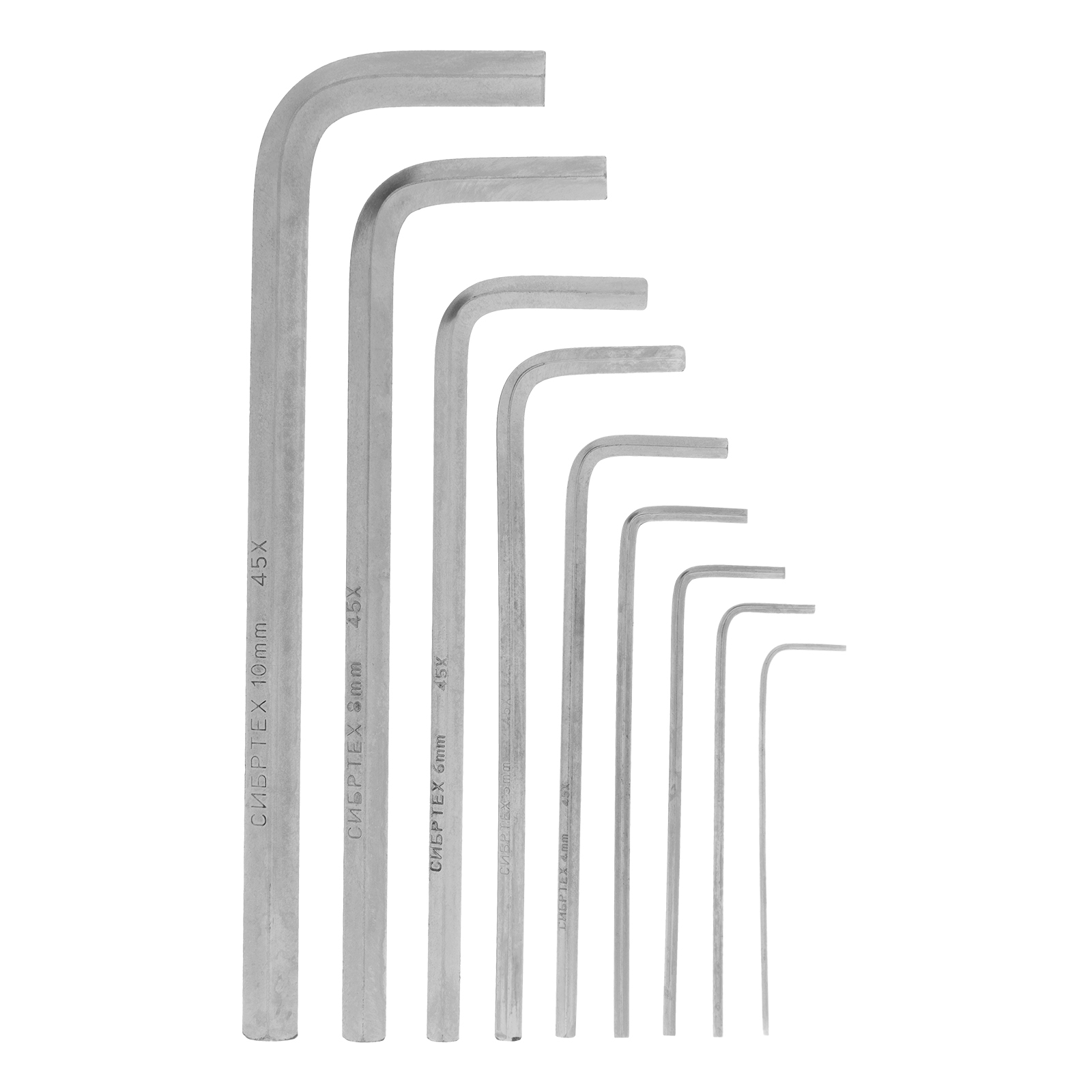 Набор удлиненных имбусовых ключей Сибртех 12318 из закаленной стали 45Х, покрытых никелем, 9 шт. в упаковке, используется для работы с евровинтами, имеющими шлиц HEX в виде внутреннего шестигранника. В комплекте 9 ключей размером от 1,5 до 10 мм, что обеспечивает широкие возможности применения набора. Он пригодится при сборке мебели, для ремонта велосипедов, установки и регулировки пластиковых окон.