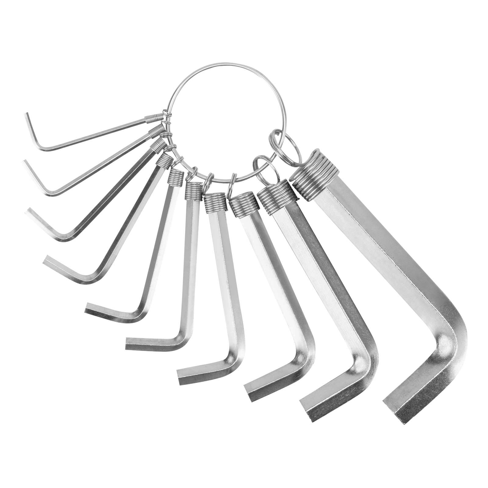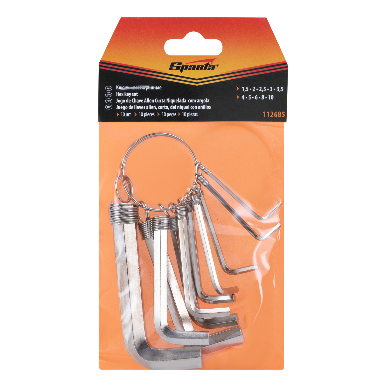 Набор имбусовых ключей HEX Sparta 112685, 10 шт. размером 1,5-10 мм, никелированный, на кольце, пригодится как начинающему мастеру, так и профессионалу. Ключи применяются при работе с крепежом, имеющим внутренний шестигранник. С их помощью можно собрать мебель или решить мелкие бытовые задачи.