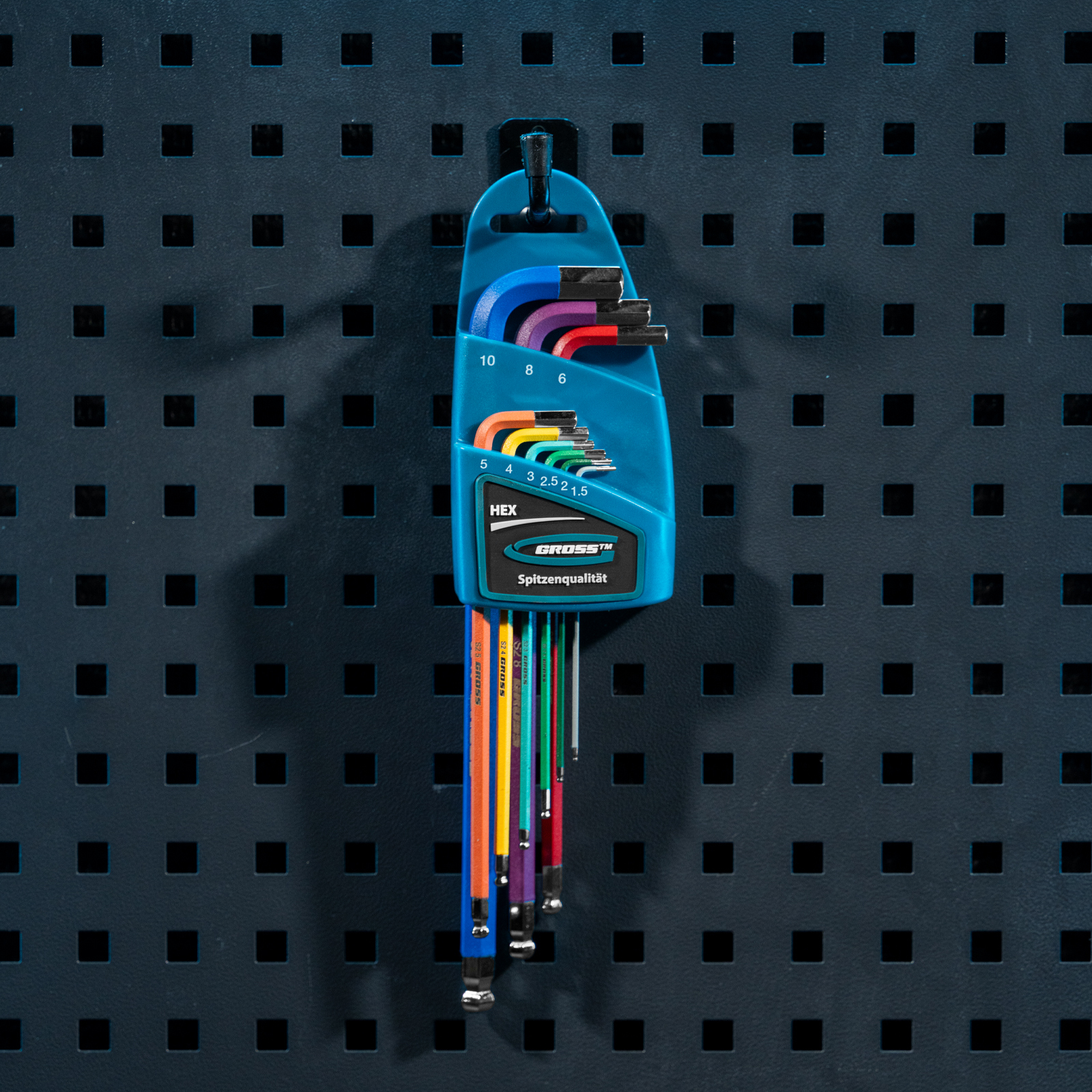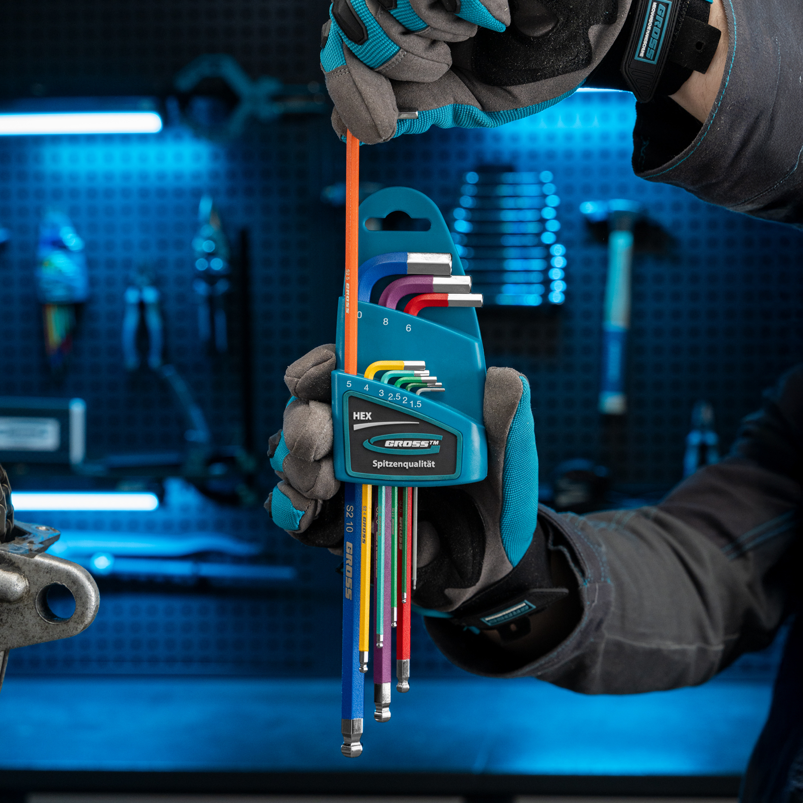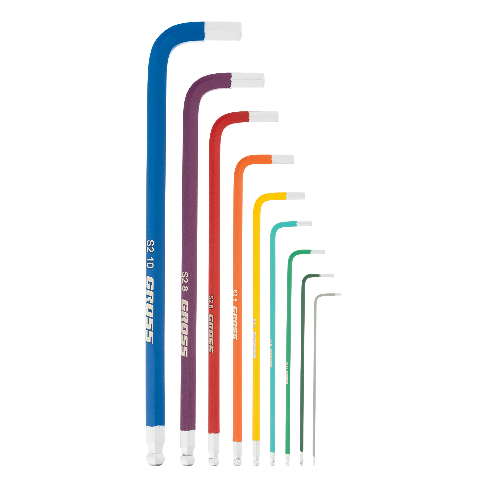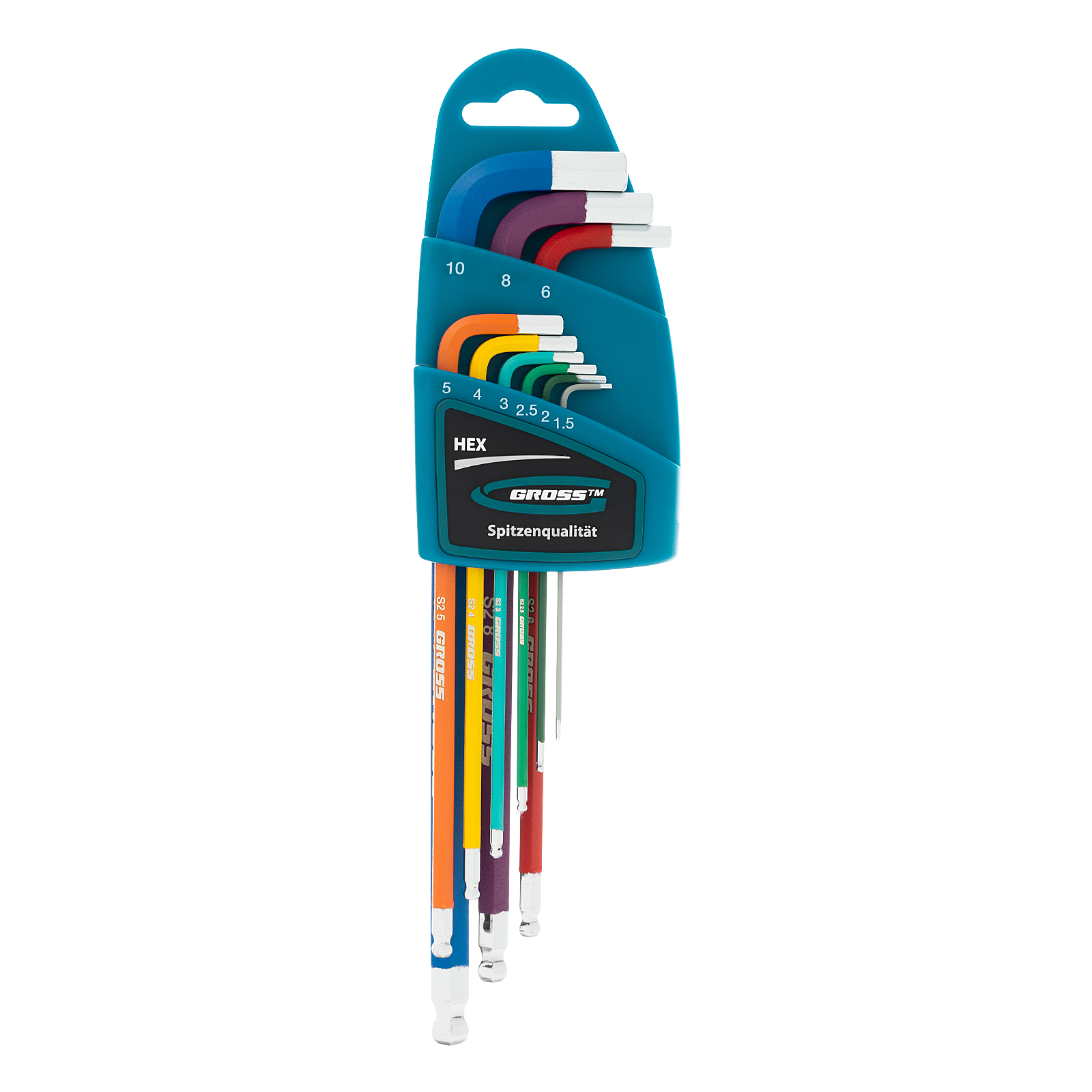 Набор экстрадлинных имбусовых ключей HEX Gross 16400 из стали S2, с шаром и магнитом, с покрытием хром/краска, включает 9 инструментов размером 1,5-10 мм и используется для работы с евровинтами, имеющими шестигранные шлицы. Ключи увеличенной длины облегчают действия в ограниченном пространстве, а также позволяют экономить усилия во время работы. Набор будет полезен во время проведения монтажных работ, сборки мебели и различных конструкций.