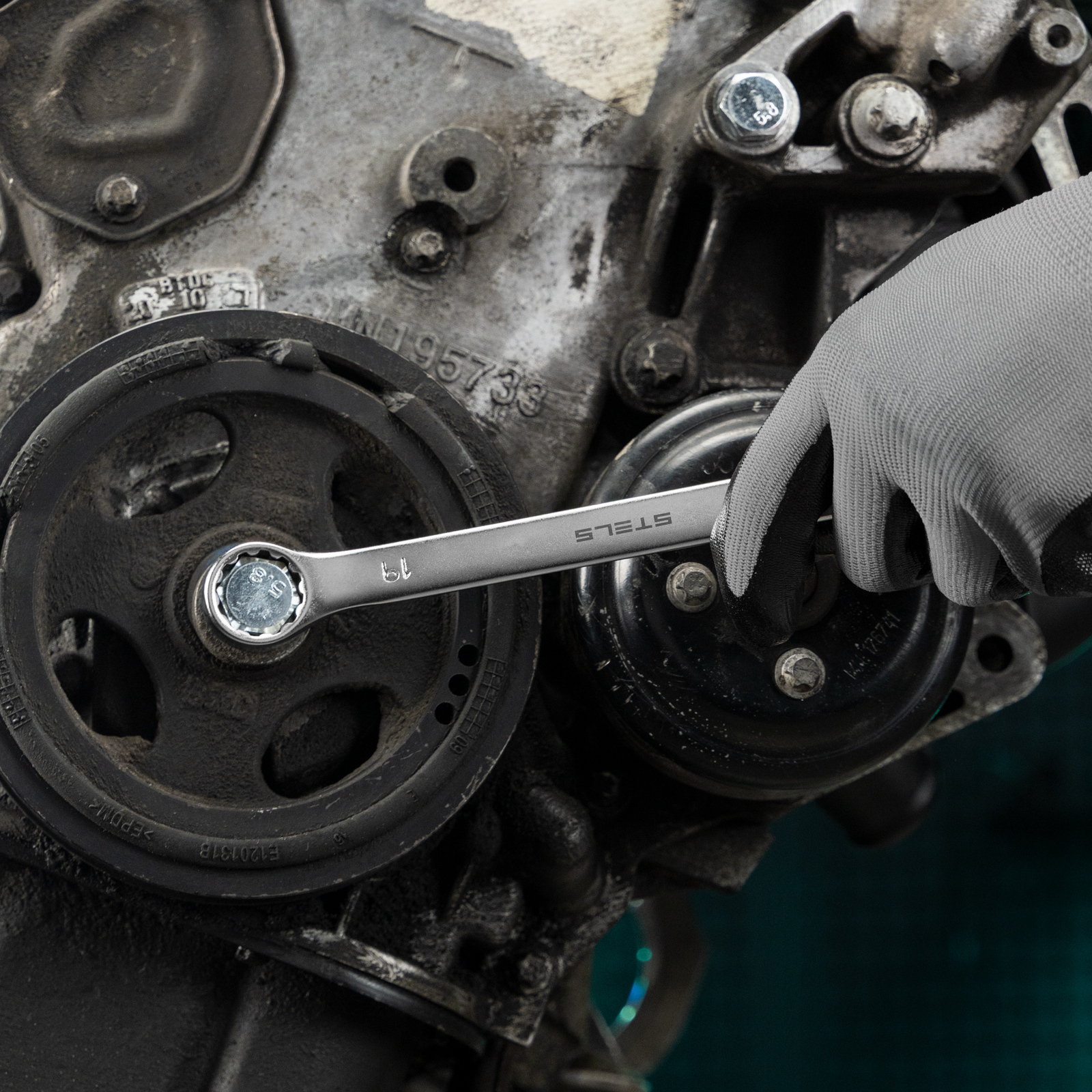 Набор Stels 15428 включает 8 комбинированных ключей из стали CrV, размером от 8 до 19 мм, покрытых матовым хромом, и используется для закручивания и откручивания гаечных и болтовых соединений. Накидная головка каждого ключа имеет 12-гранную внутреннюю поверхность, что облегчает работу с крепежом и уменьшает опасность его повреждения. Ключи применяются в слесарных мастерских и автосервисах, а также будут полезны для решения бытовых задач.