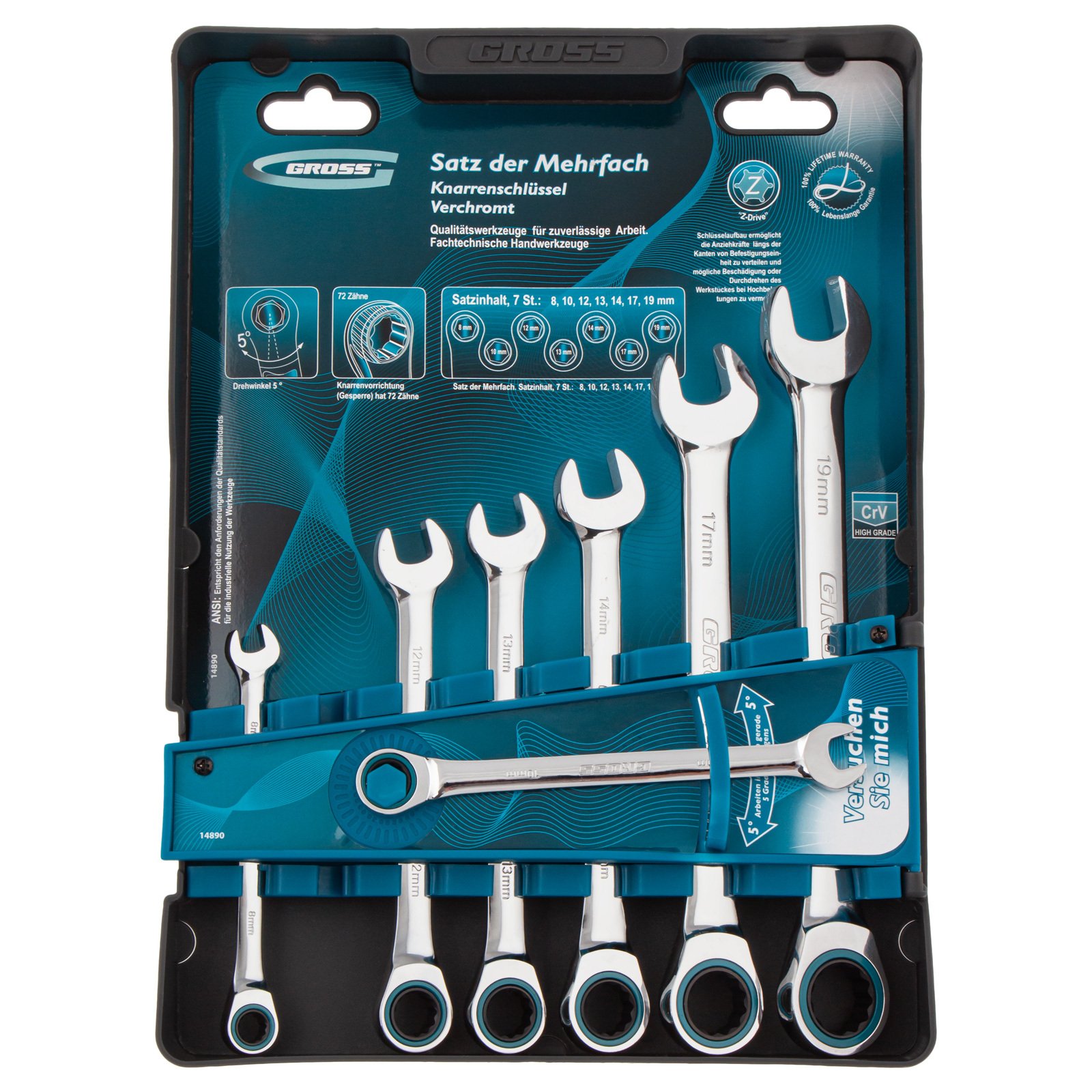 Набор комбинированных ключей с трещоткой Gross 14890 используется для монтажа и демонтажа болтов и гаек и включает 7 инструментов размером от 8 до 19 мм, выполненных из стали CrV. Каждый из них имеет две рабочие головки — рожковую и накидную, что расширяет возможности применения. У накидной головки 12-гранный профиль, благодаря чему она надежно захватывает крепеж. Набор подходит как для профессионального, так и для самостоятельного ремонта автомобилей.