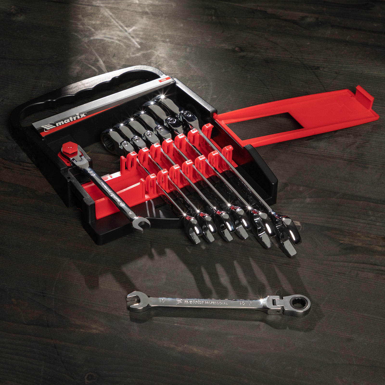 Набор из 8 комбинированных трещоточных шарнирных ключей Matrix 14898 пригодится мастерам и автолюбителям для фиксации и раскручивания крепежных элементов. Трещоточный механизм повышает скорость работы и легко справляется даже с закисшим крепежом.