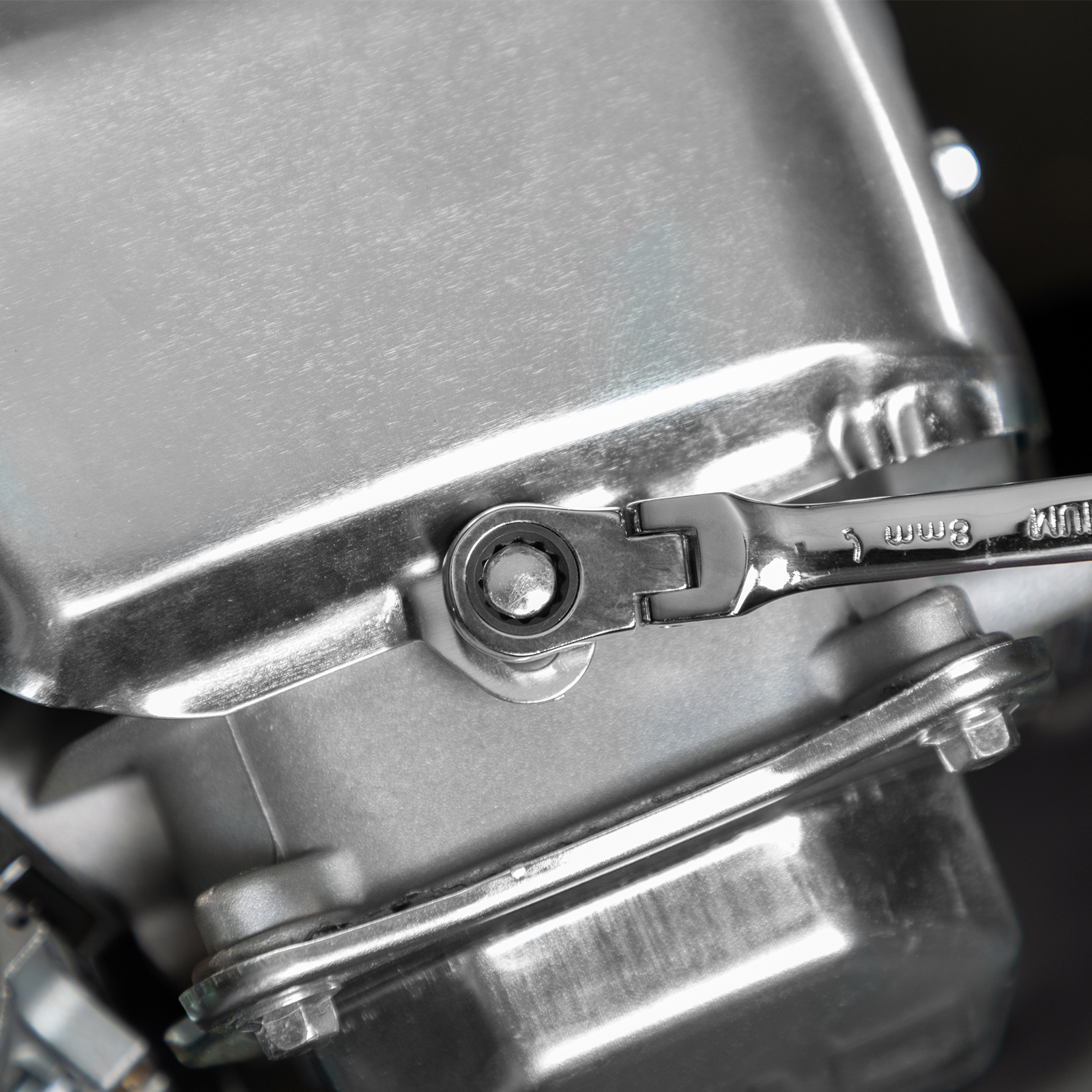 - Удобная работа в труднодоступных местах — храповой механизм на 72 зуба обеспечивает плавное вращение (шаг трещотки составляет 5°), а шарнир позволяет поворачивать рабочую часть под углом.