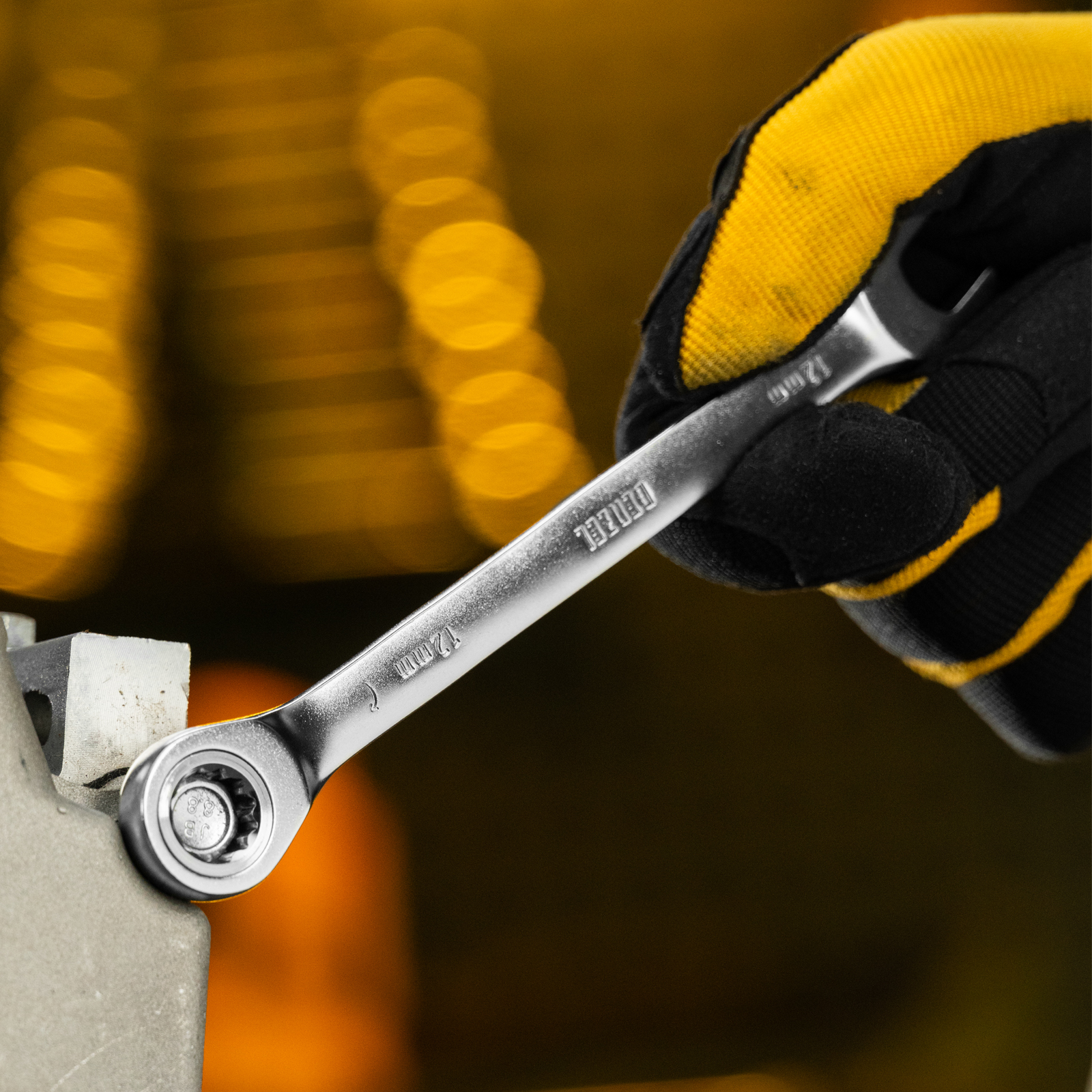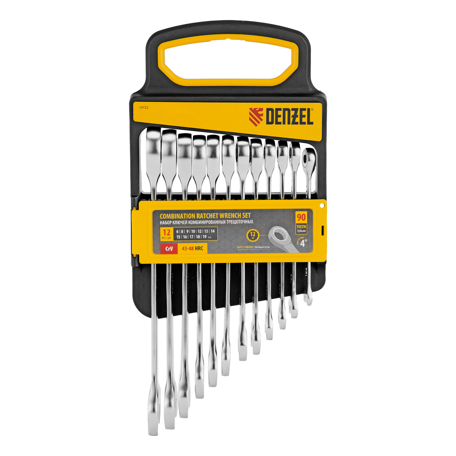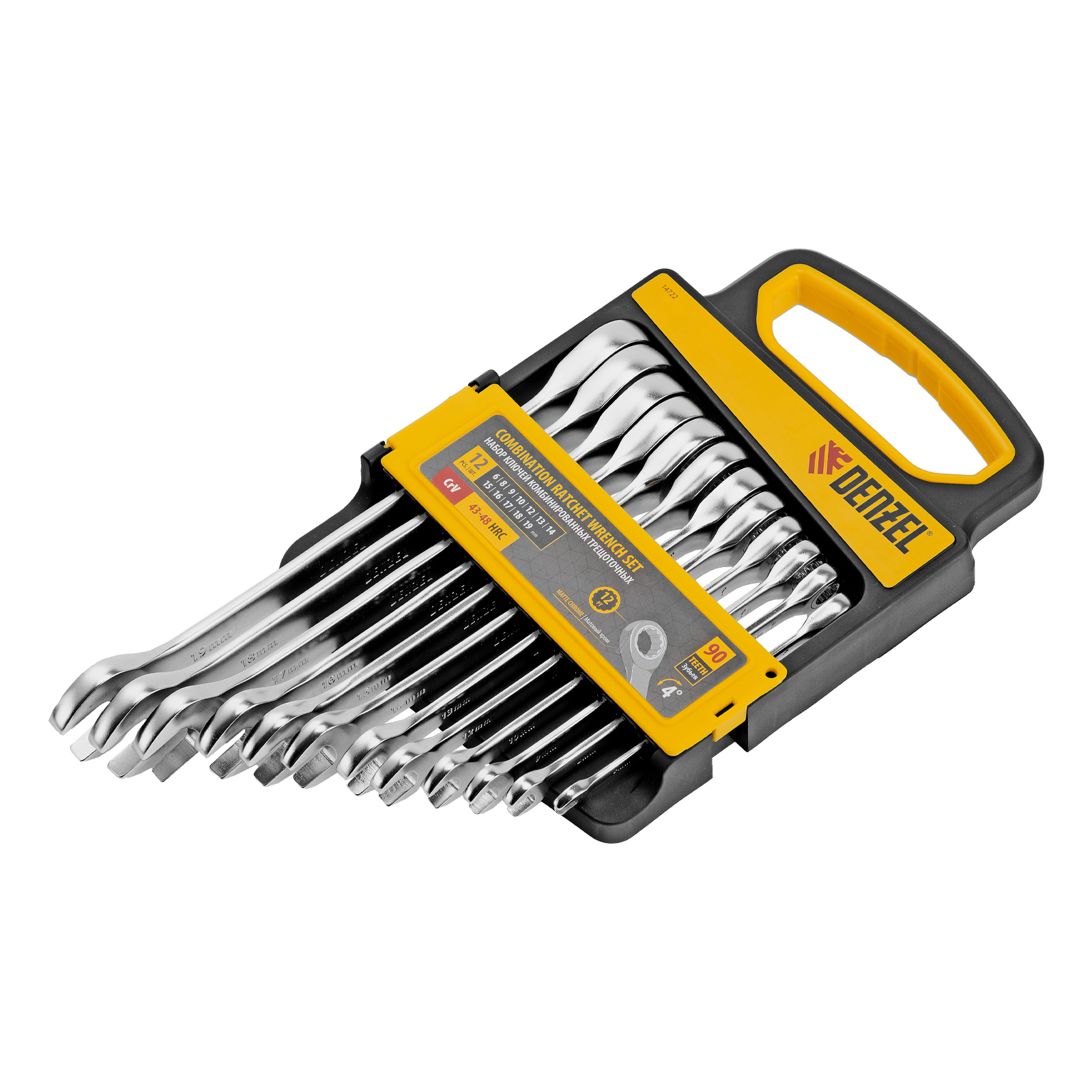 Набор комбинированных трещоточных ключей Denzel 14722 состоит из 12 инструментов из стали CrV, размером 6-19 мм, с покрытием «матовый хром». Используется для проведения монтажных и демонтажных работ с резьбовыми соединениями, в том числе в труднодоступных местах. У каждого ключа 2 рабочих профиля, что расширяет возможности использования набора. Инструменты пригодятся дома и в гараже.