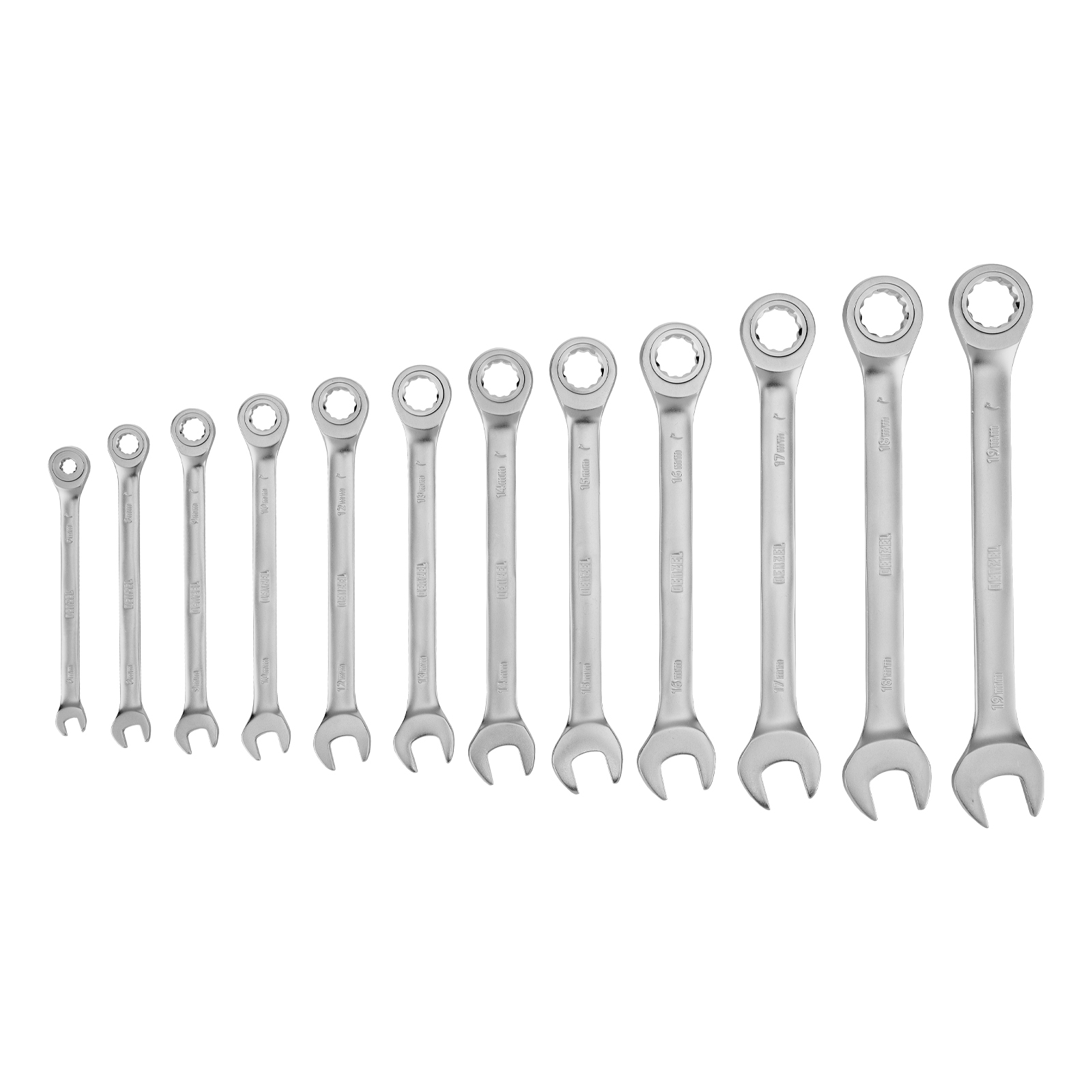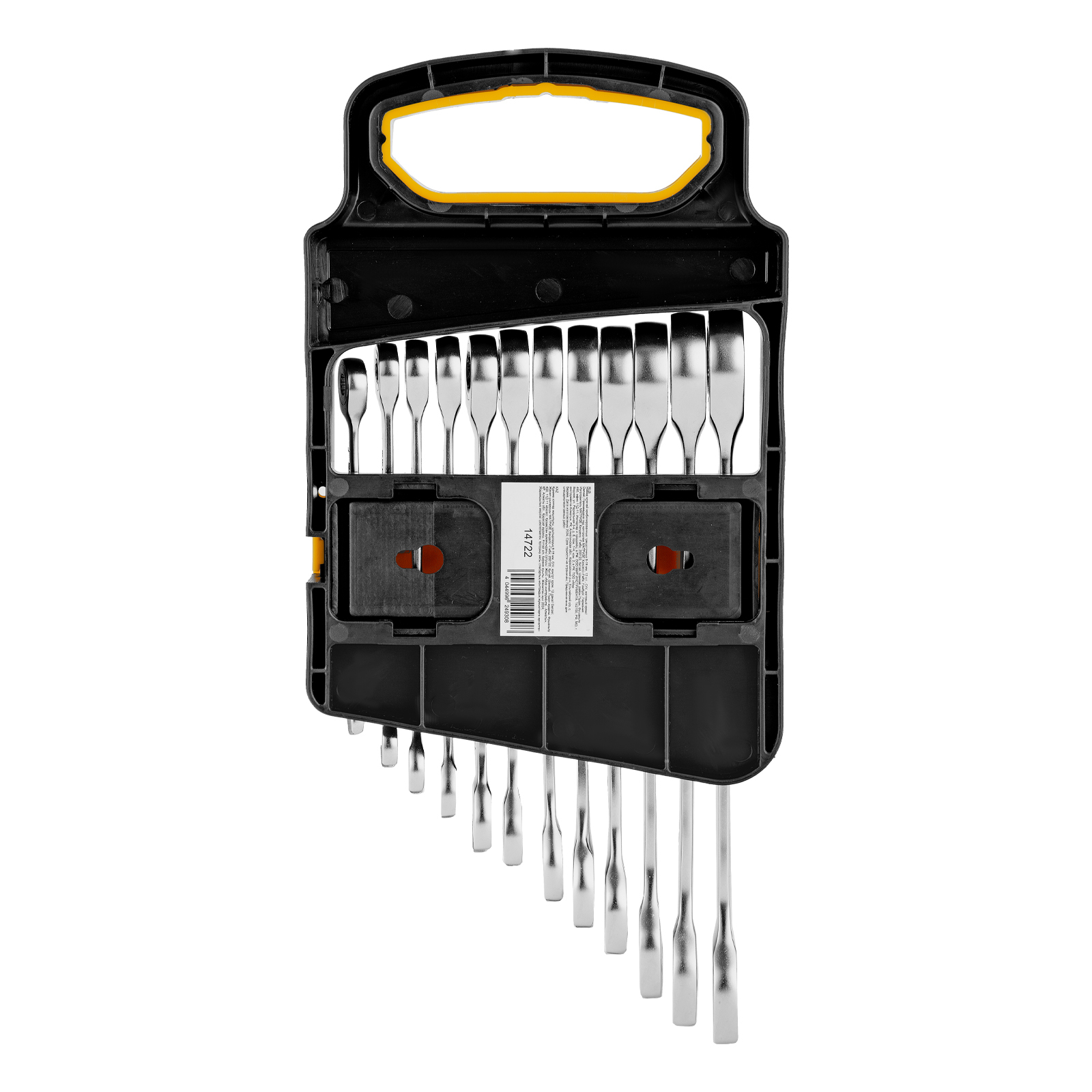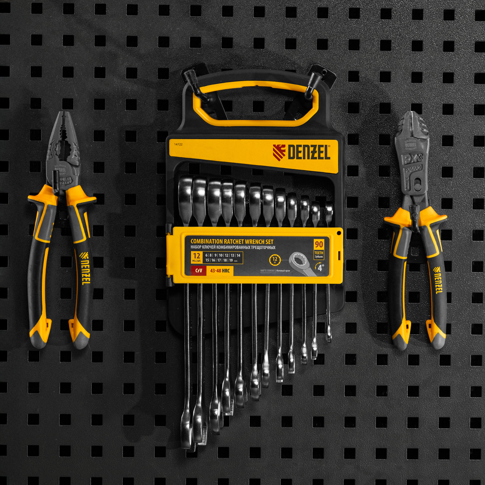Набор комбинированных трещоточных ключей Denzel 14722 состоит из 12 инструментов из стали CrV, размером 6-19 мм, с покрытием «матовый хром». Используется для проведения монтажных и демонтажных работ с резьбовыми соединениями, в том числе в труднодоступных местах. У каждого ключа 2 рабочих профиля, что расширяет возможности использования набора. Инструменты пригодятся дома и в гараже.