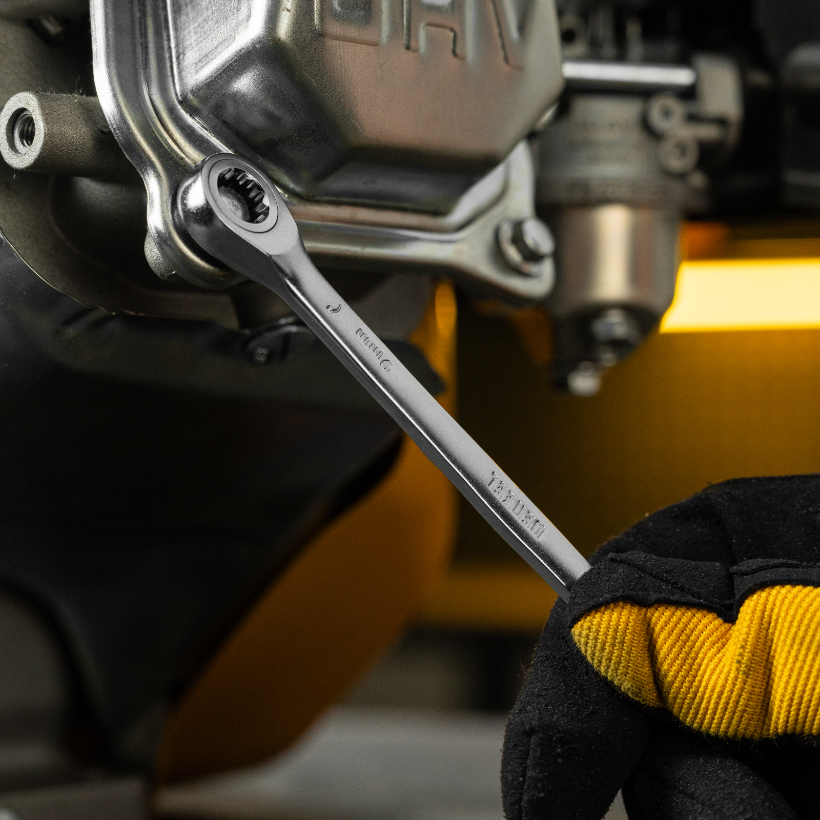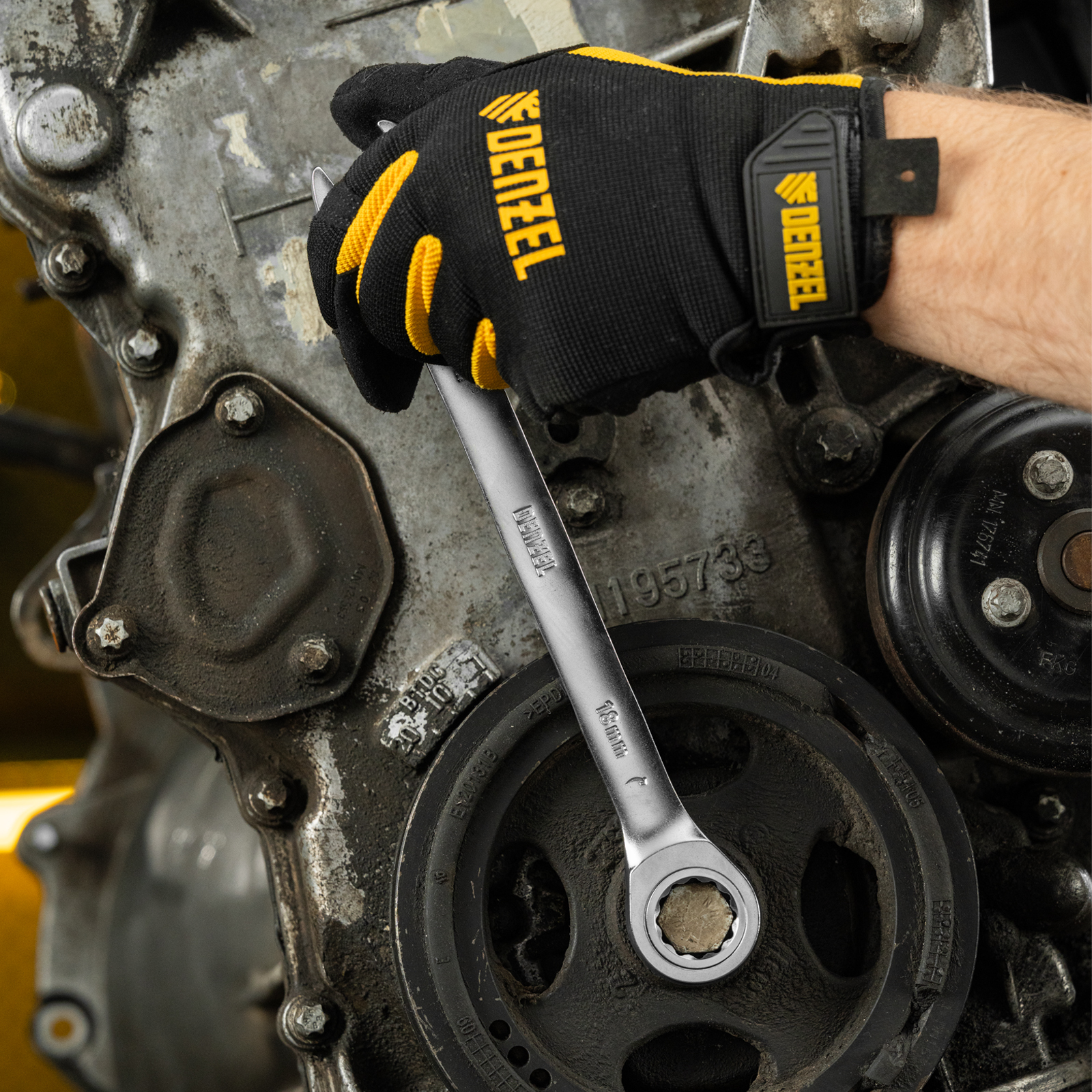 - Аккуратная работа — 12-гранная накидная часть увеличивает площадь соприкосновения с головкой крепежа и снижает риск ее деформации.