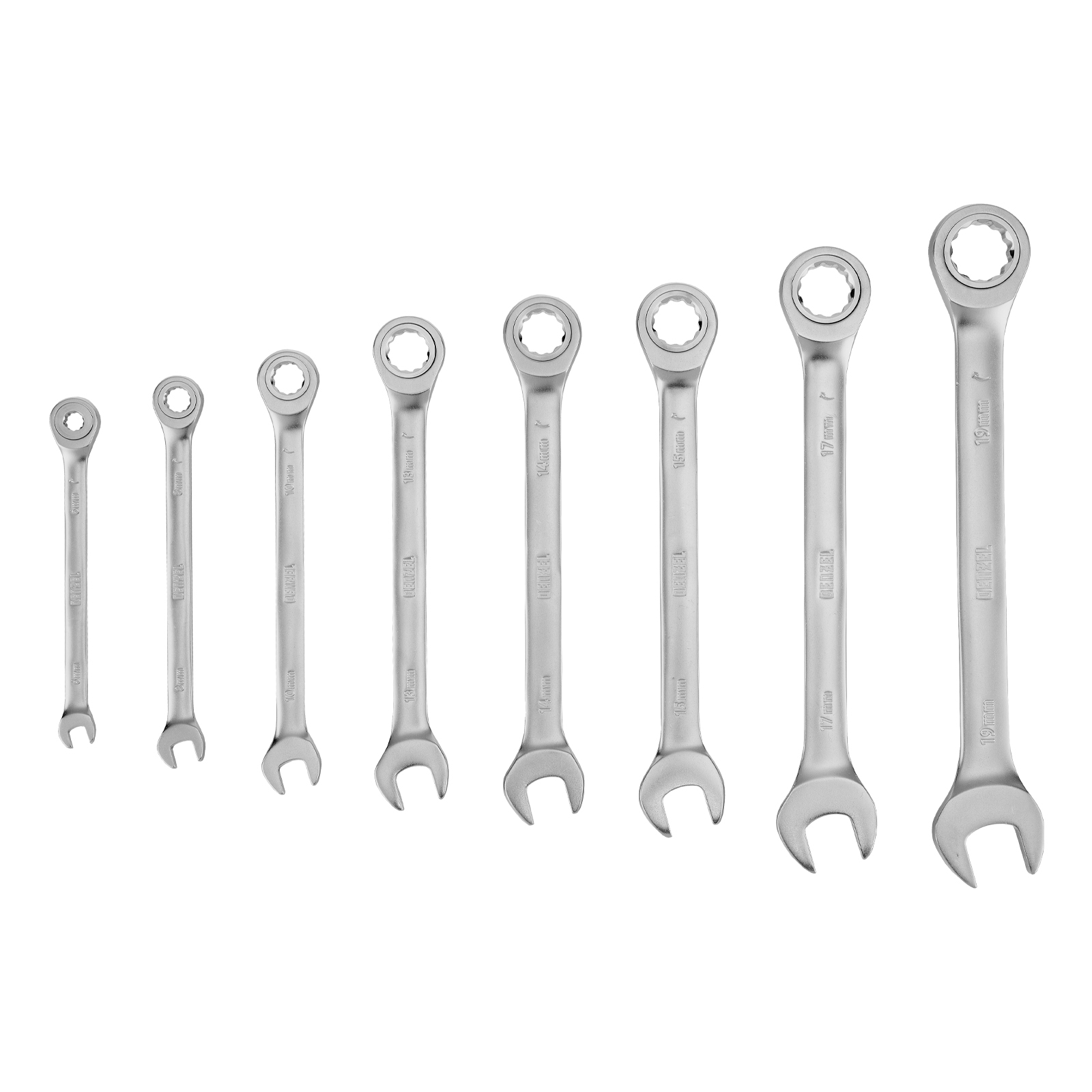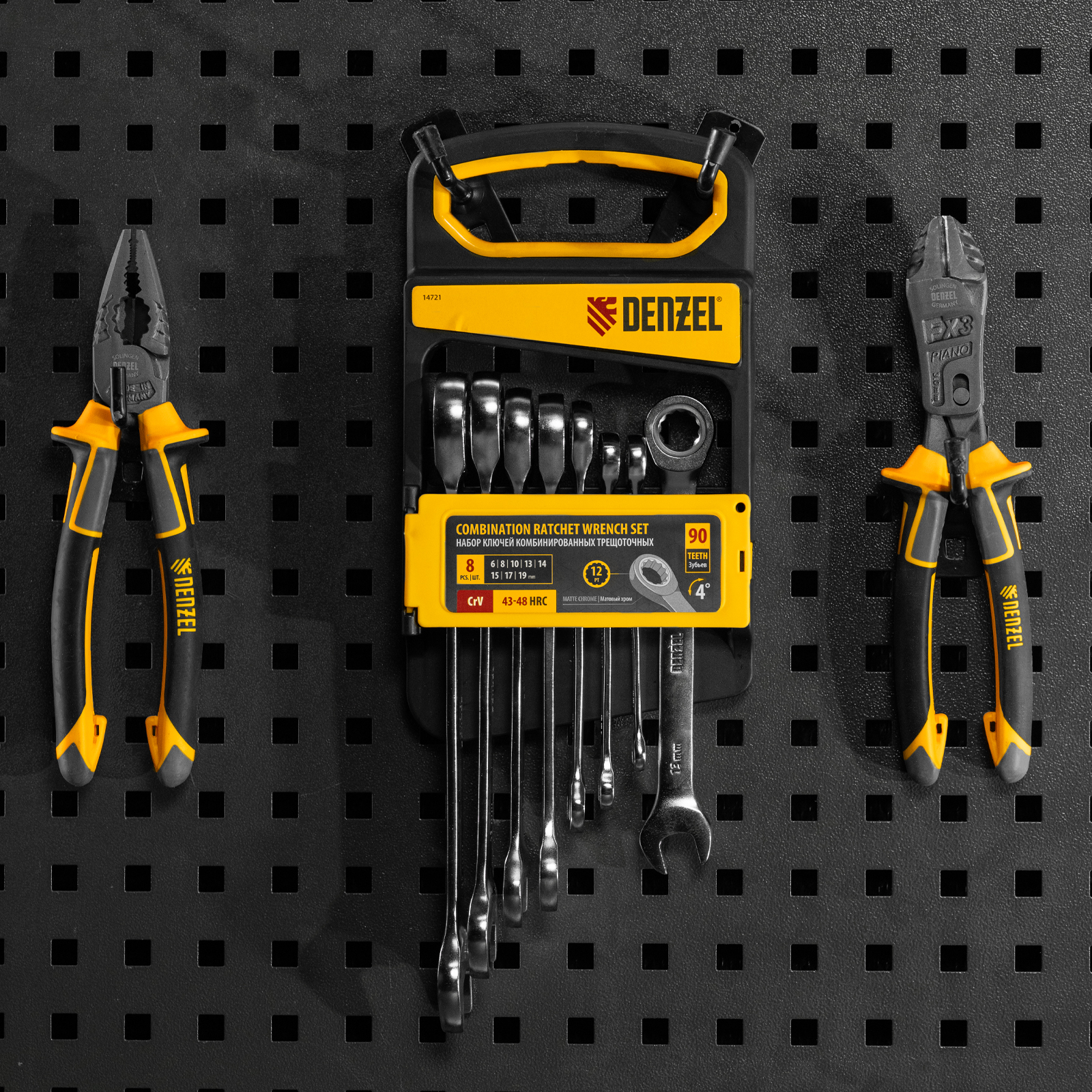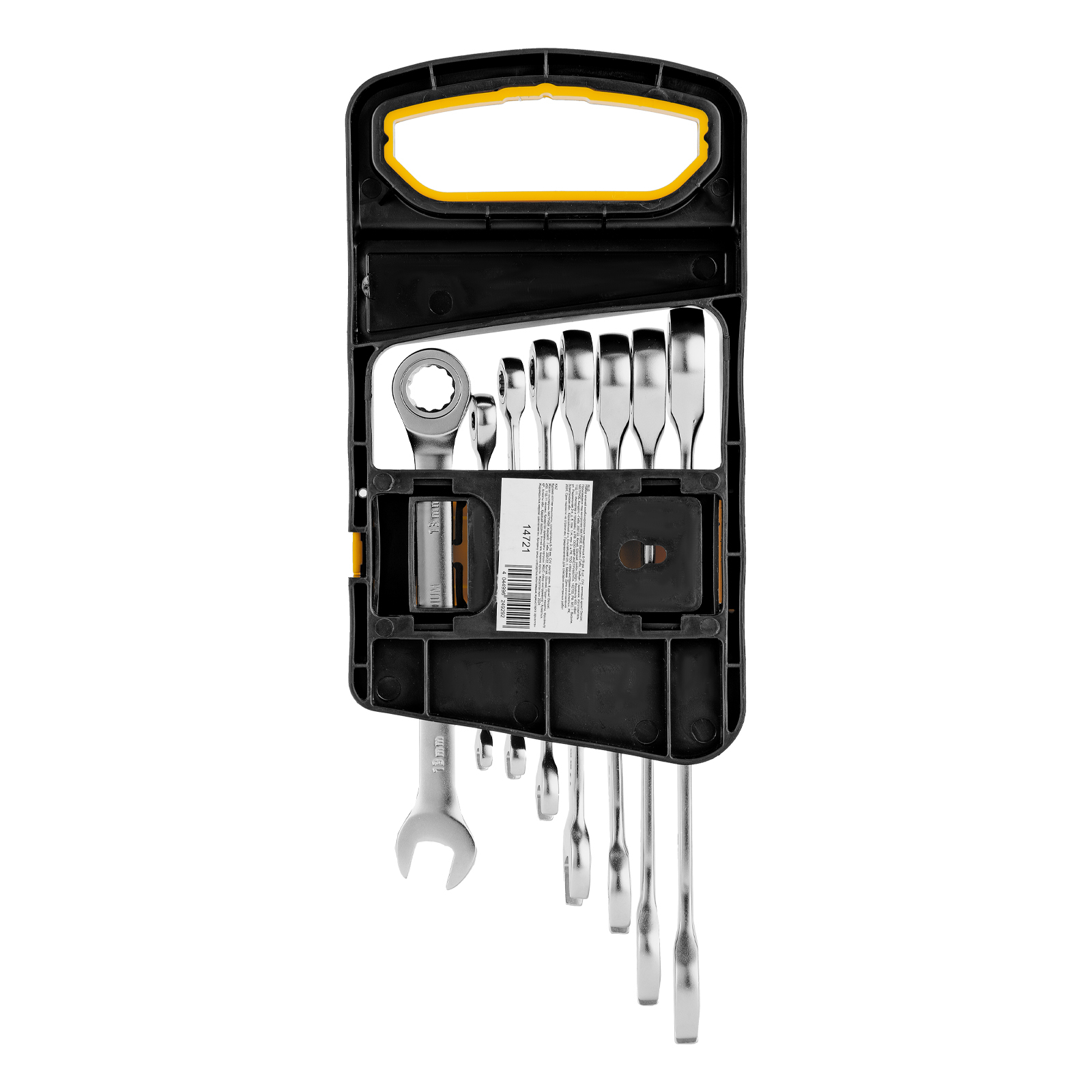Набор комбинированных трещоточных ключей Denzel 14721 состоит из 8 инструментов из стали CrV, размером 6-19 мм, с покрытием «матовый хром». Используется для проведения монтажных и демонтажных работ с резьбовыми соединениями, в том числе в труднодоступных местах. У каждого ключа 2 рабочих профиля, что расширяет возможности использования набора. Инструменты пригодятся дома и в гараже.