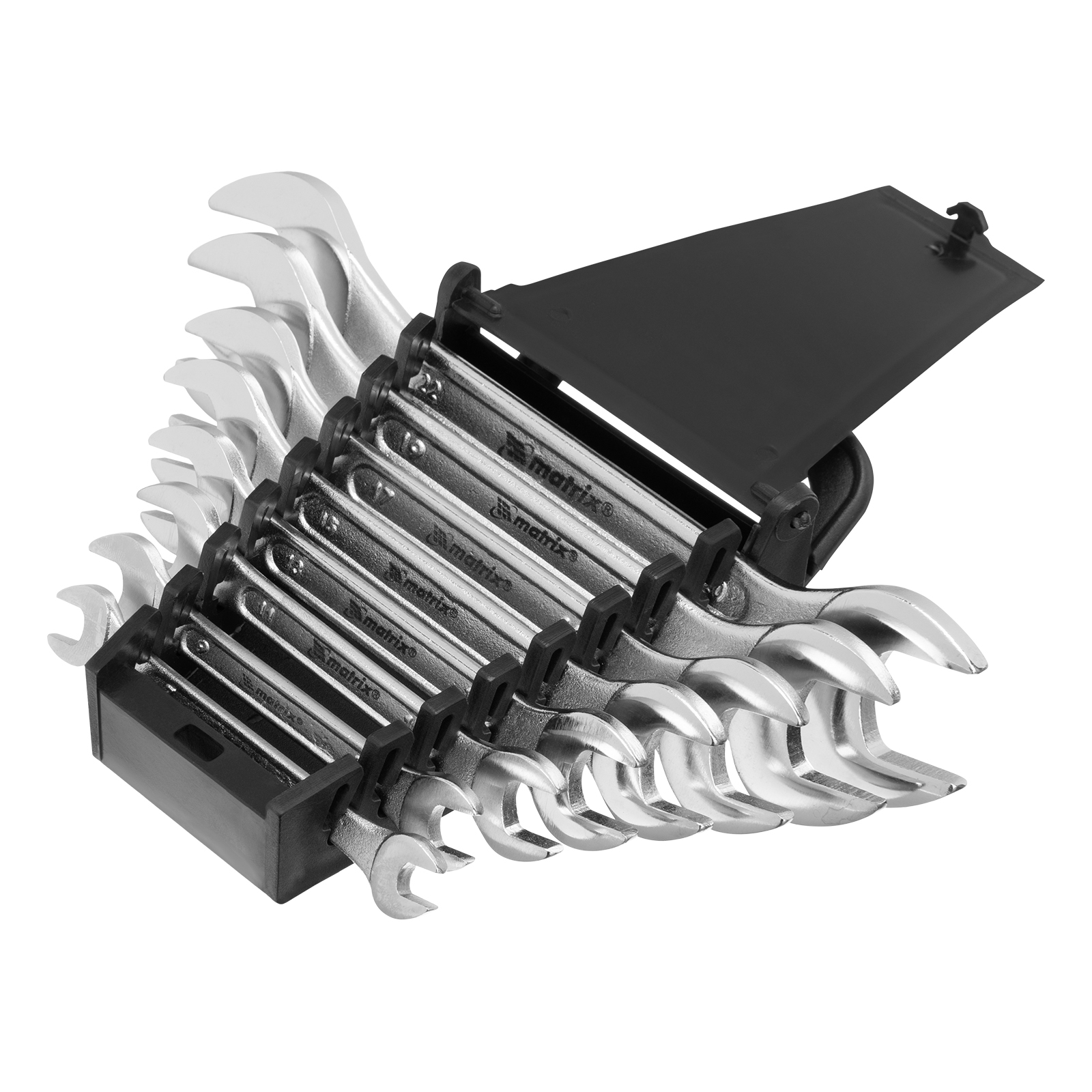 Набор ключей рожковых хромированных Matrix 15276 состоит из 8 инструментов с величиной зева от 6 до 22 мм, выполненных из стали CrV. Используется для монтажа и демонтажа гаечных, болтовых и других резьбовых соединений с шестигранным профилем. Ключи удобны для работы в ограниченном пространстве благодаря небольшому наклону губок относительно рукоятки. Набор пригодится в слесарной или авторемонтной мастерской, сервисном центре, а также дома, в гараже или на даче.