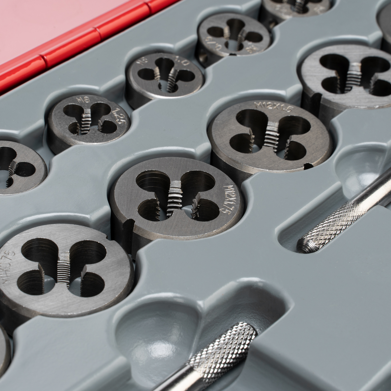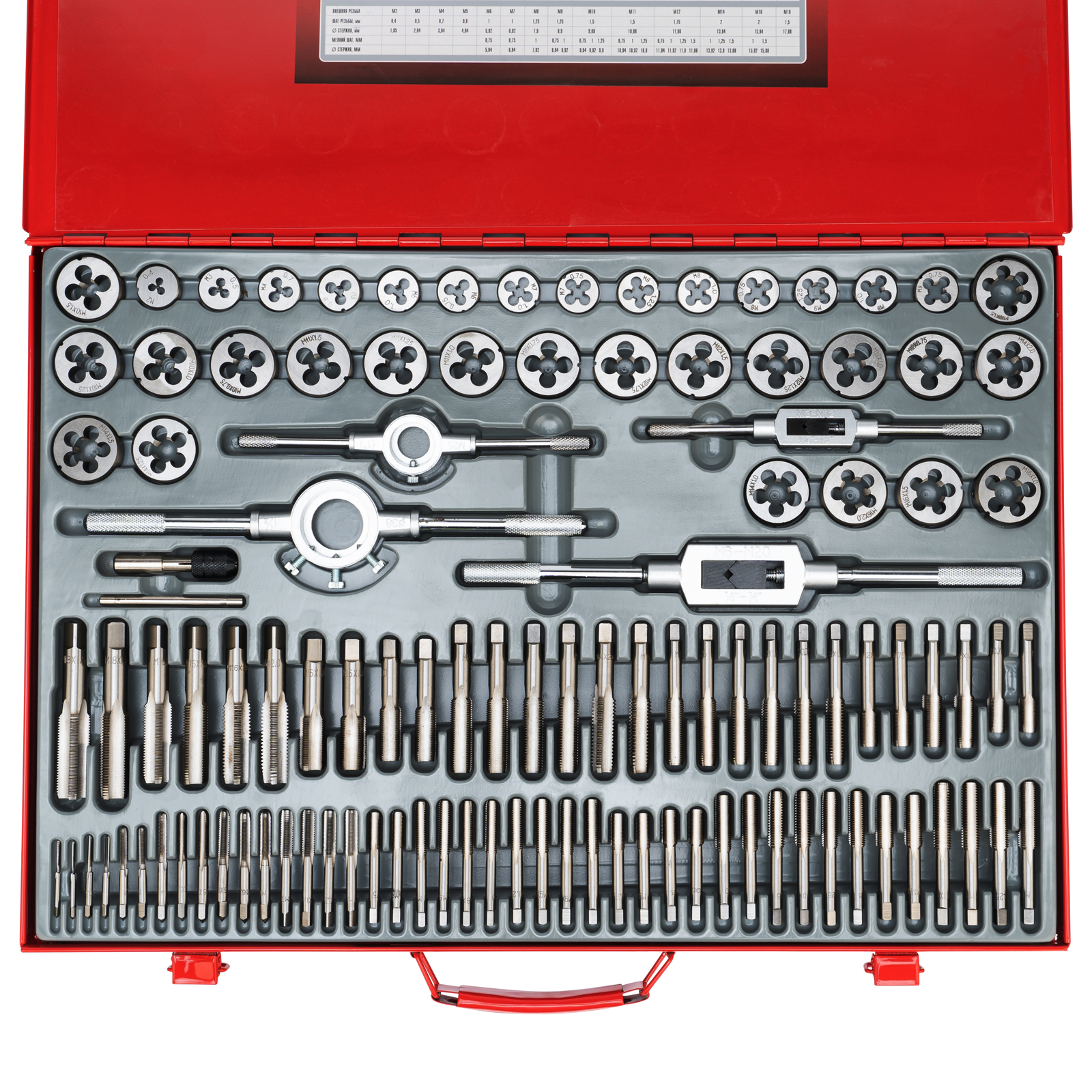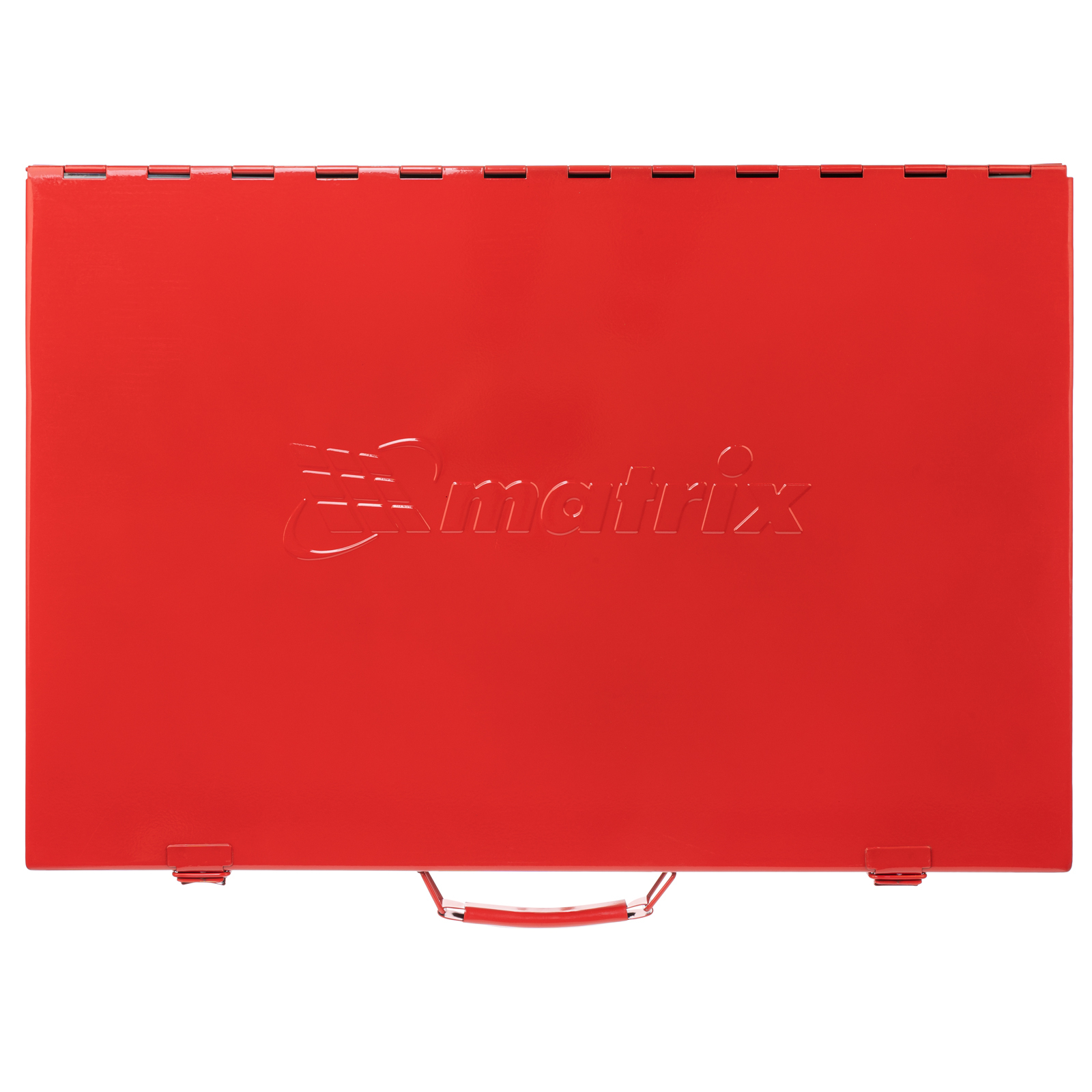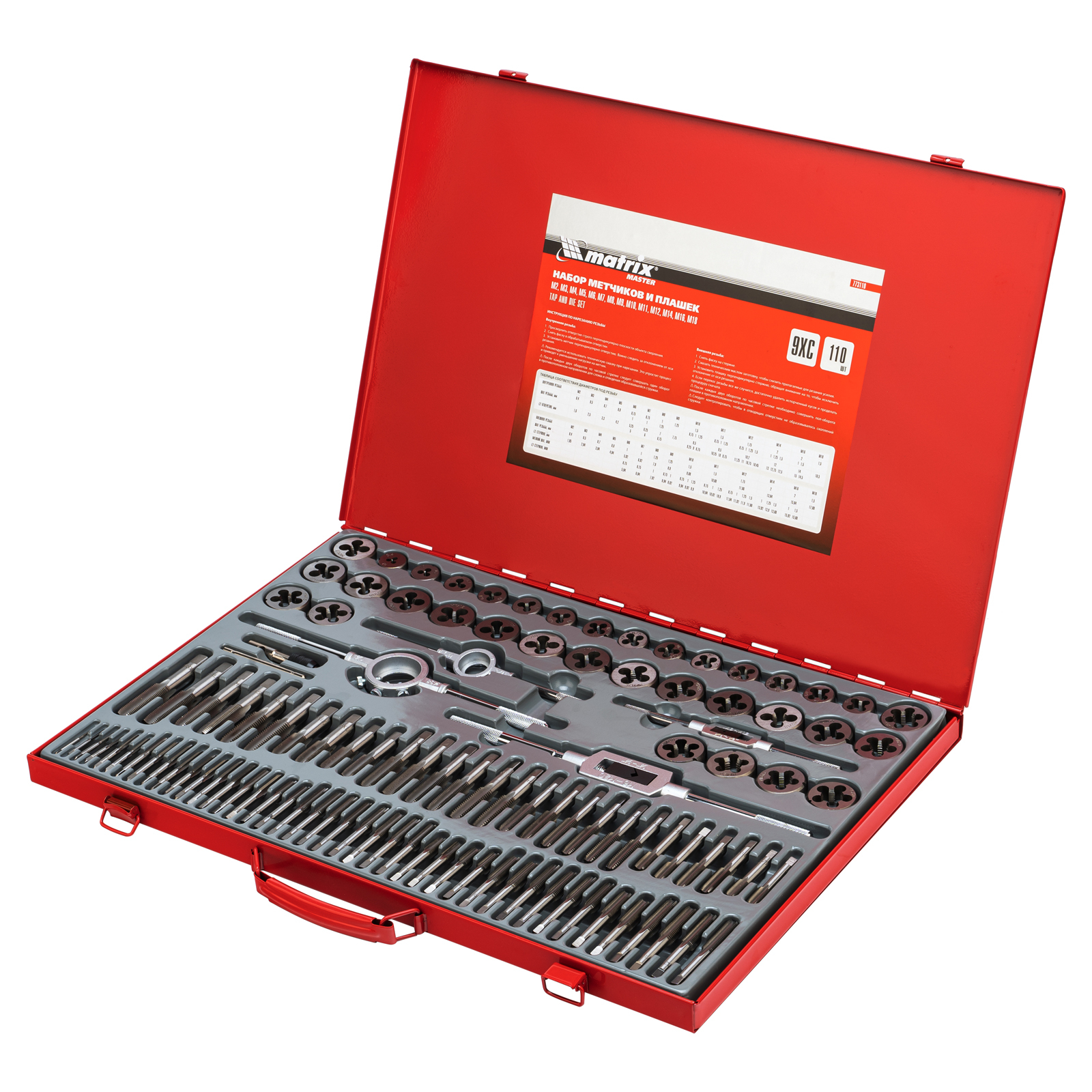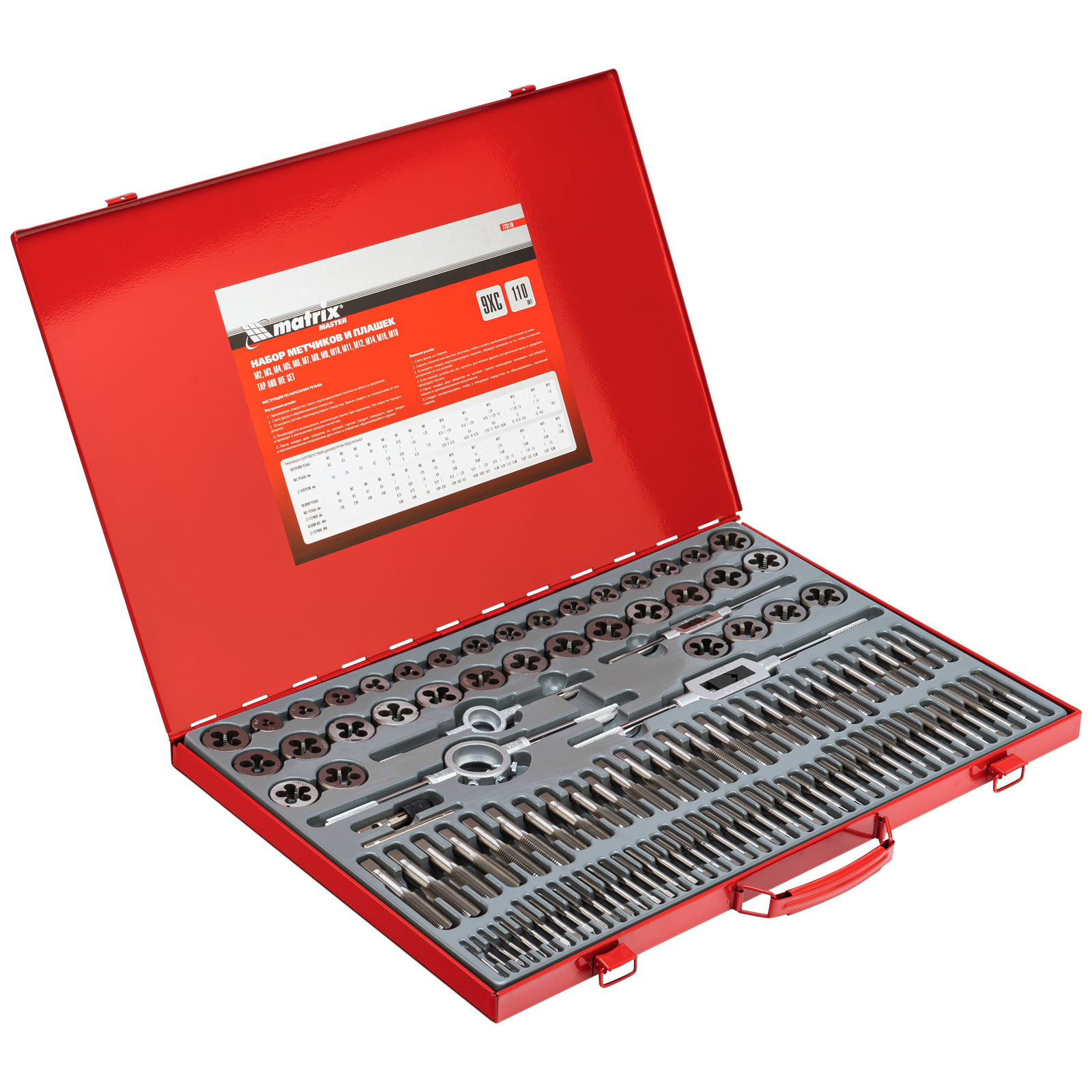 Набор метчиков и плашек М2-М18 Matrix 773110 в металлическом кейсе состоит из 110 предметов — резьбонарезных инструментов и держателей для них. Они позволяют нарезать внутреннюю и наружную резьбу, а также используются для восстановления сорванной резьбы. Благодаря наличию метчиков разного типа набор подходит для работы как со сквозными, так и с глухими отверстиями. Набор будет полезен в сервисном центре, авторемонтной мастерской, пригодится также в быту.