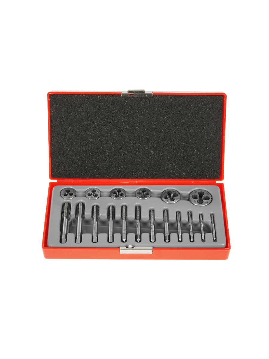 Набор метчиков и плашек 28120-H18 станет надежным помощником для нарезания внешней или внутренней резьбы в заготовках из стали и цветных металлов. Процесс выполнения резки может осуществляться как в глухих, так и сквозных отверстиях. В наборе поставляются 18 предметов – 5 метчиков с диаметром M3-M10 и плашки для метрической резьбы разного размера. Выполненные из инструментальной стали высокой степени твердости, инструменты 28120-H18 отличаются износостойкостью и длительным сроком службы. Для сохранности и удобного размещения в комплекте предусмотрен компактный прочный кейс.