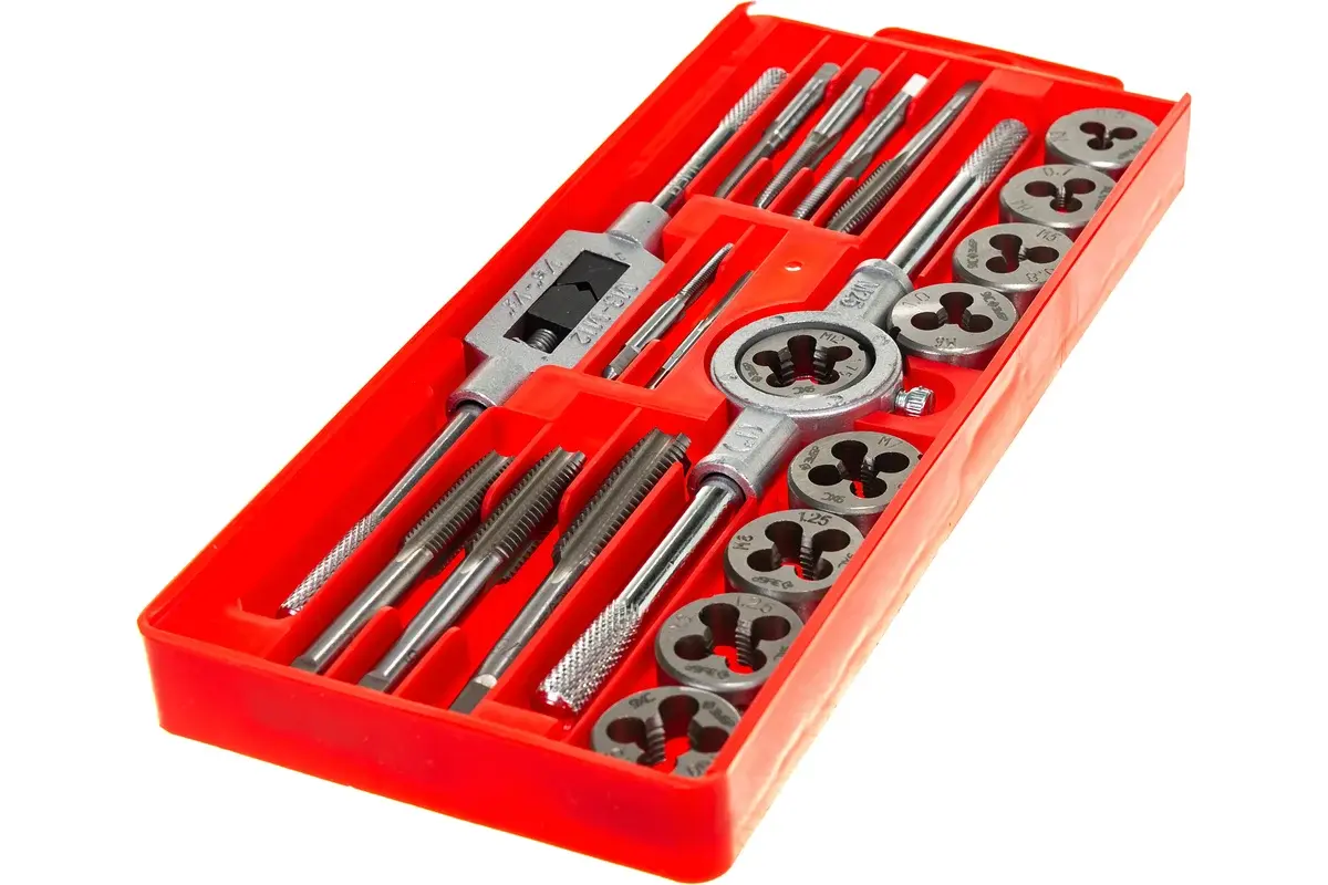 Набор метчиков 2810-H20_Z01 позволяет эффективно и качественно справляться с широким спектром задач по нарезанию внутренней и внешней резьбы. В наборе поставляются различные виды плашек для получения метрической резьбы, метчики разного размера, а также держатели для метчиков и плашек. Всего в наборе поставляется 20 предметов. Все предметы изготовлены из высококачественной инструментальной стали, что является гарантией износостойкости и долгого срока службы. Набор 2810-H20_Z01 оснащен пластиковым контейнером с прозрачной крышкой для удобства хранения.