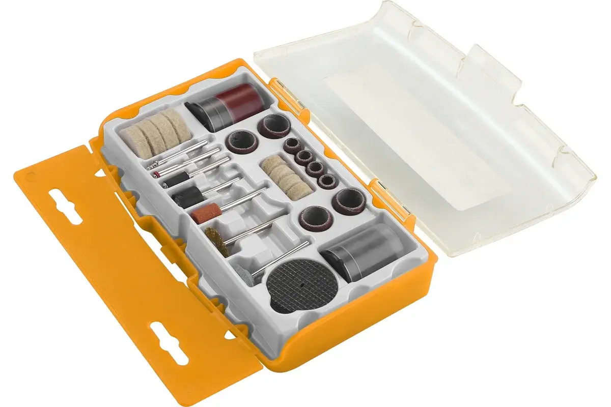 Набор насадок DEKO DH56 065-0784 включает в себя предметы для выполнения работ любой сложности. Содержит насадки разной формы и зернистости, предназначенные для шлифовки, резки и полировки металла, камня, керамики, стекла. Набор поставляется в пластиковом кейсе