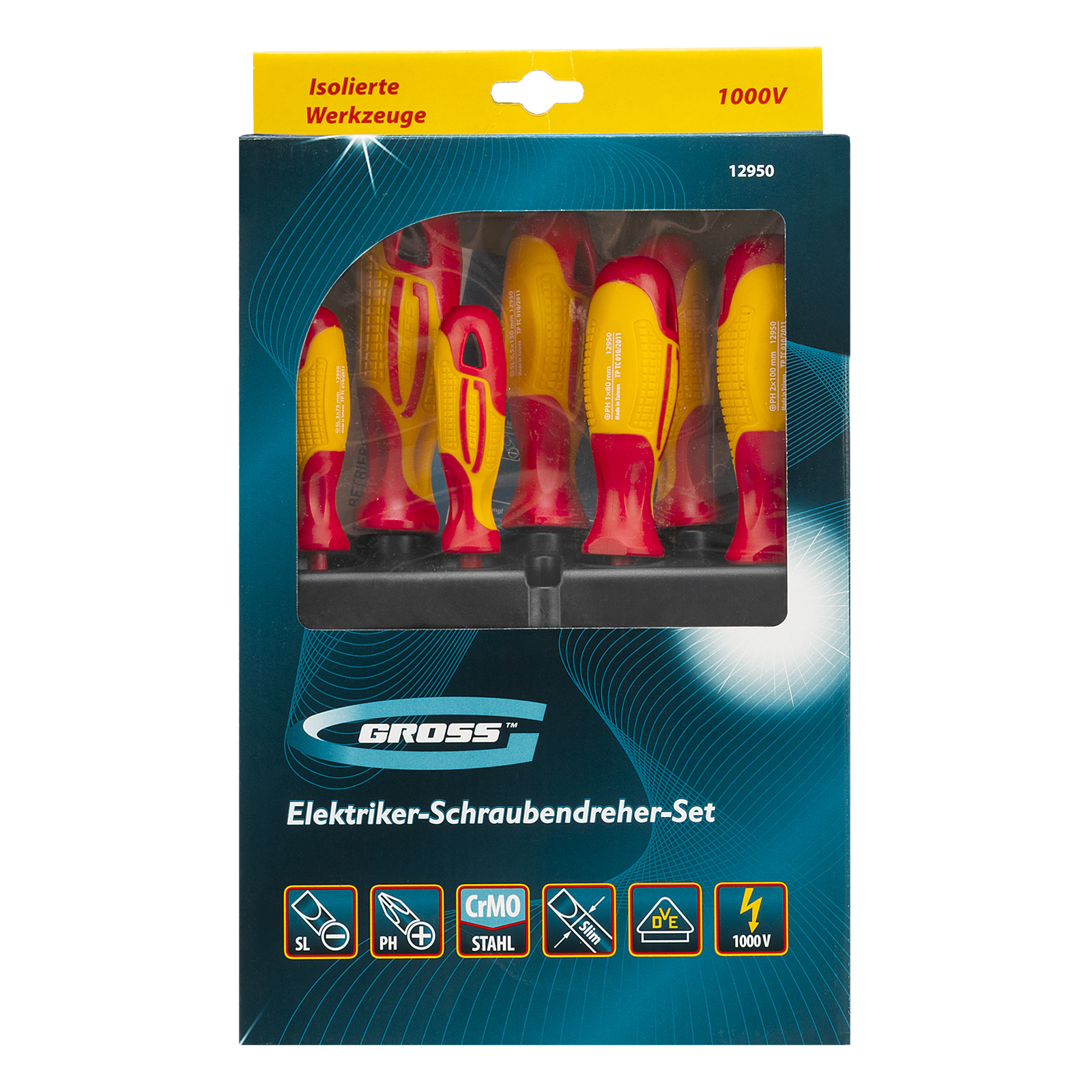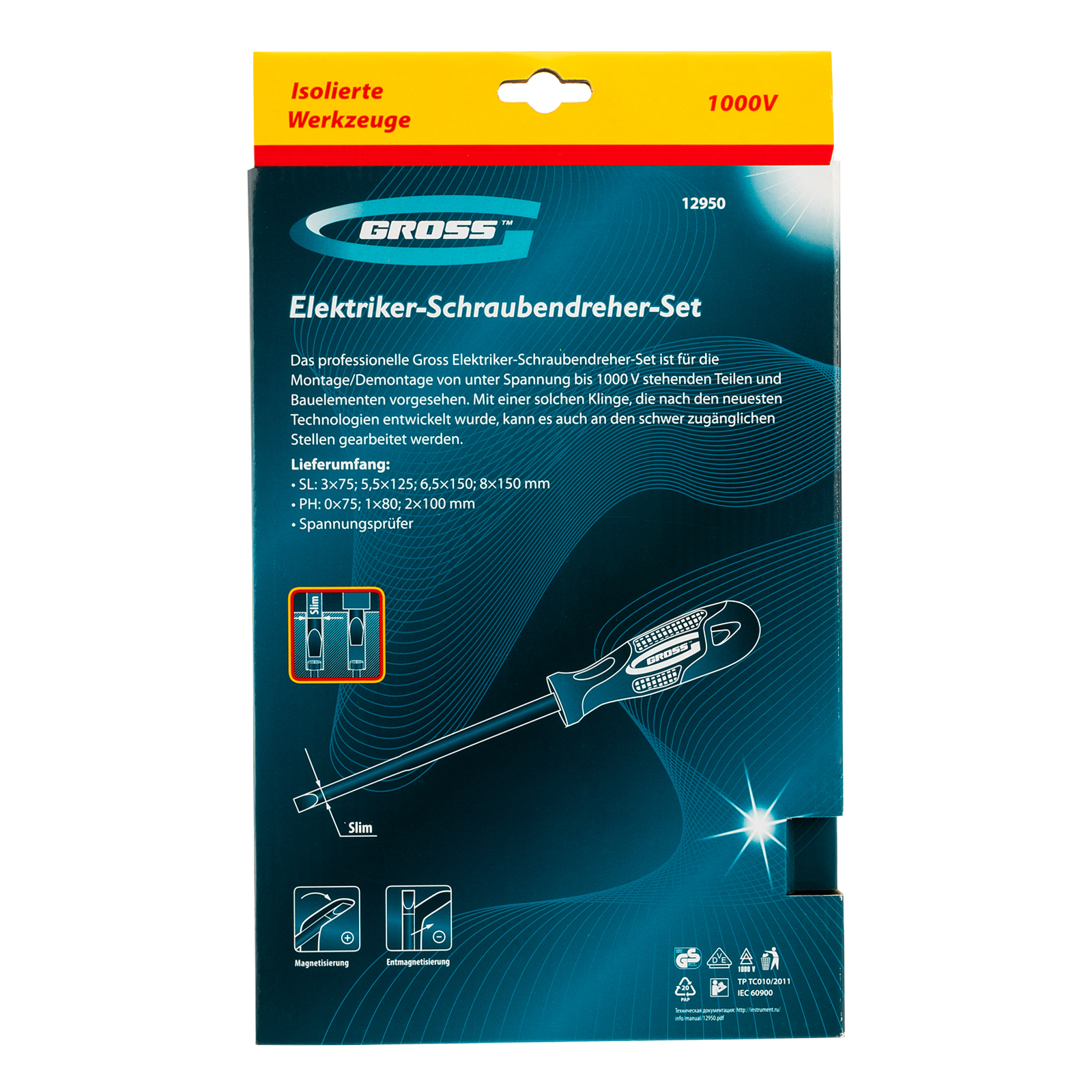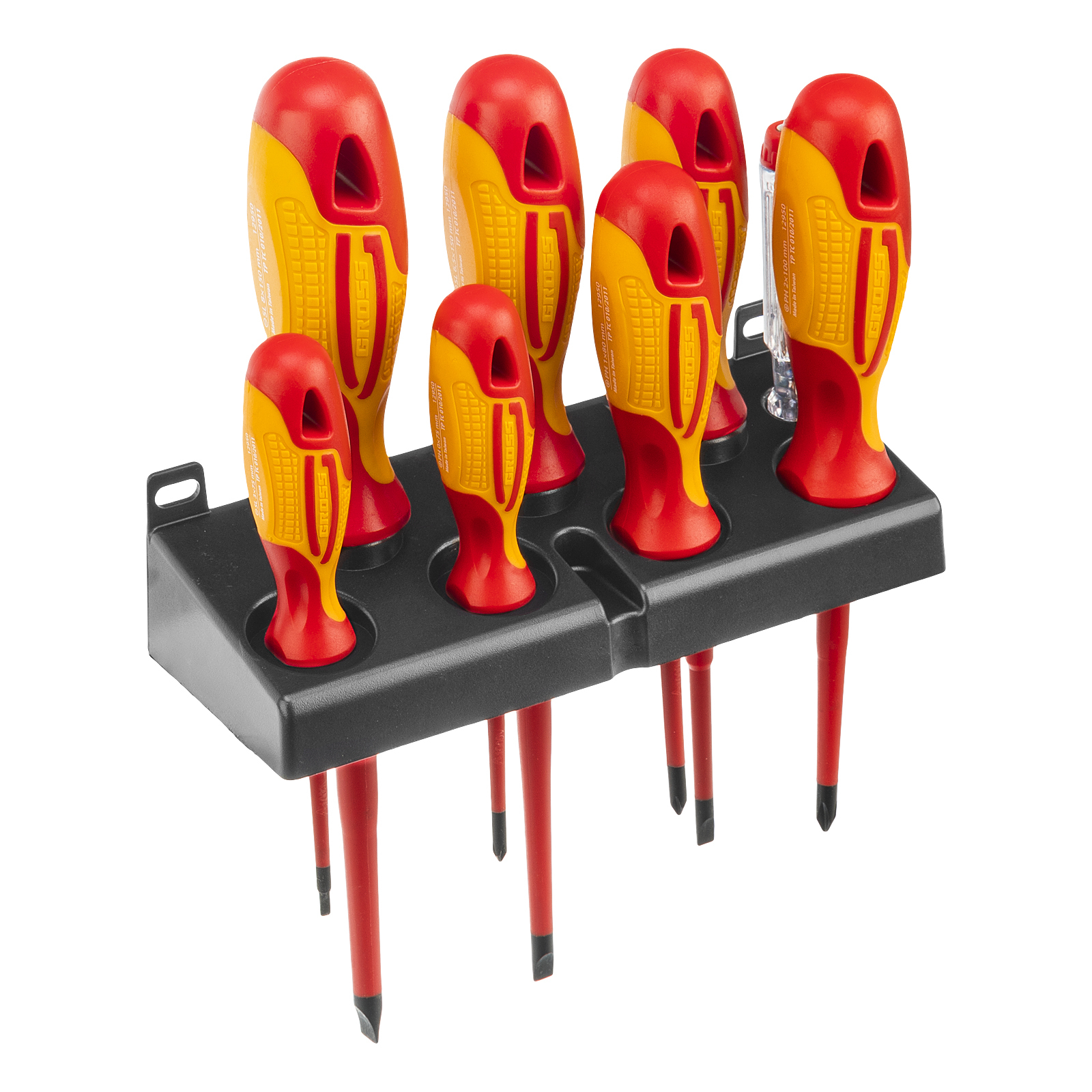 Набор диэлектрических отверток Gross 12950 с двухкомпонентными рукоятками включает 8 предметов из стали CrMo, в том числе тестер для проверки наличия напряжения в сети. Позволяет проводить монтаж/демонтаж крепежных элементов типа PH и SL под напряжением до 1000 В. Благодаря диэлектрическому покрытию стержней оператор защищен от поражения током во время ремонта электроприборов и электрооборудования. Набор включает отвертки с профилем PH и SL с зауженными стержнями 75-150 мм, что позволяет работать с крепежом в труднодоступных местах. Важно — техника безопасности запрещает работу под напряжением даже при использовании инструмента с диэлектрическим покрытием!