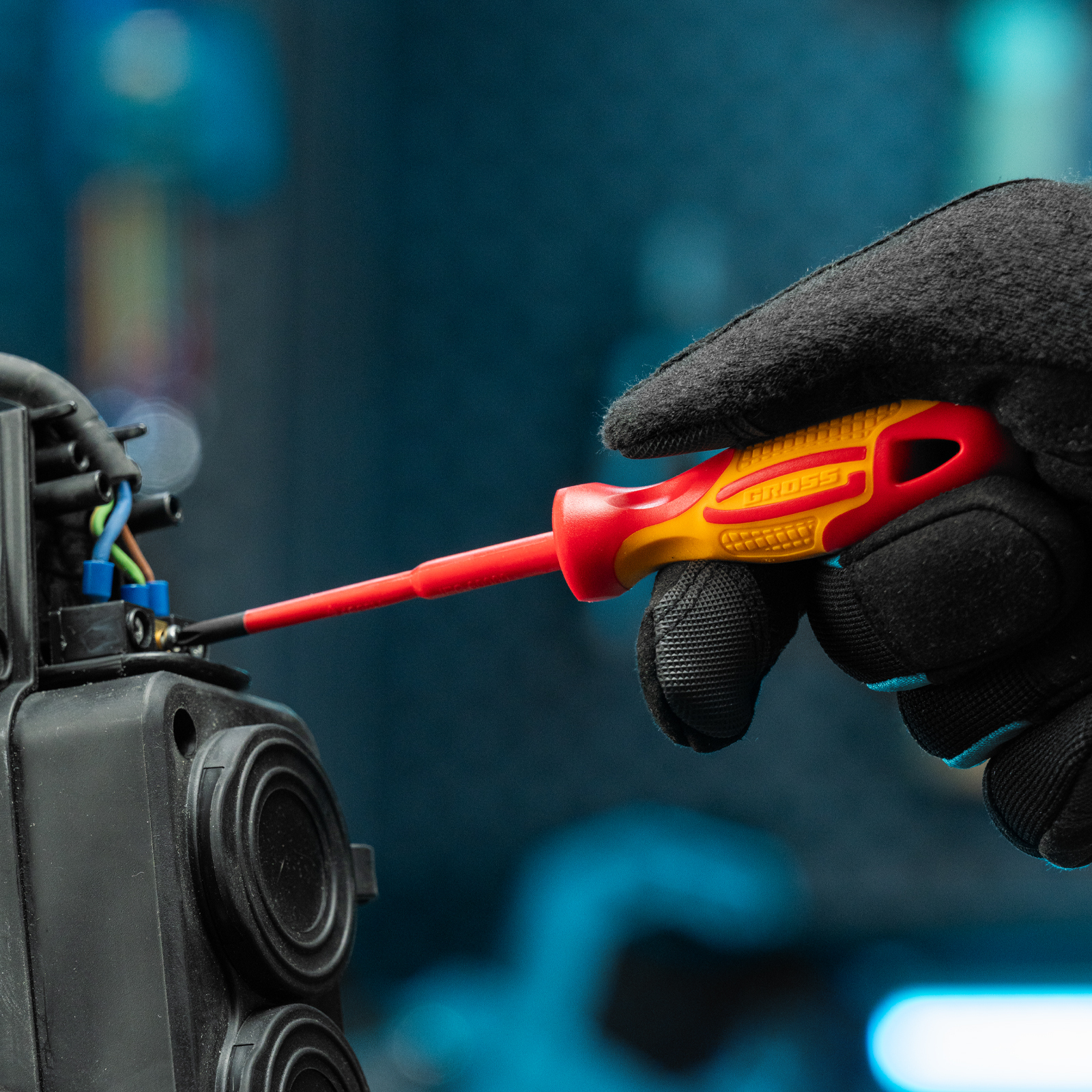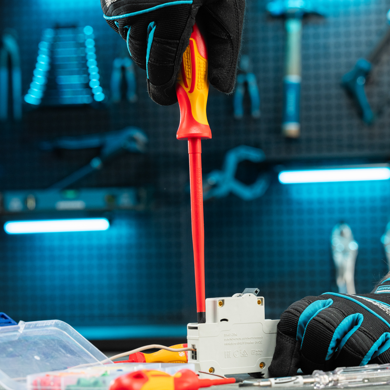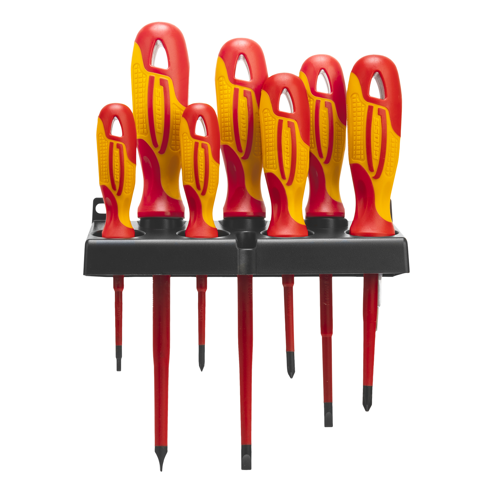 Набор диэлектрических отверток Gross 12950 с двухкомпонентными рукоятками включает 8 предметов из стали CrMo, в том числе тестер для проверки наличия напряжения в сети. Позволяет проводить монтаж/демонтаж крепежных элементов типа PH и SL под напряжением до 1000 В. Благодаря диэлектрическому покрытию стержней оператор защищен от поражения током во время ремонта электроприборов и электрооборудования. Набор включает отвертки с профилем PH и SL с зауженными стержнями 75-150 мм, что позволяет работать с крепежом в труднодоступных местах. Важно — техника безопасности запрещает работу под напряжением даже при использовании инструмента с диэлектрическим покрытием!