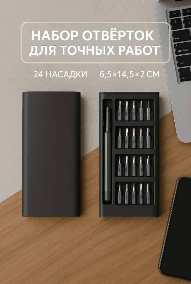 Набор маленьких отверток состоит из 24 сменных насадок с магнитными наконечниками для разборки, которые подходят для ремонта большинства современных часов, электронных устройств, ноутбуков, мобильного телефона, ПК, планшетов, очков, фотоаппаратов, игрушек и для мелкого ремонта автомобиля.
