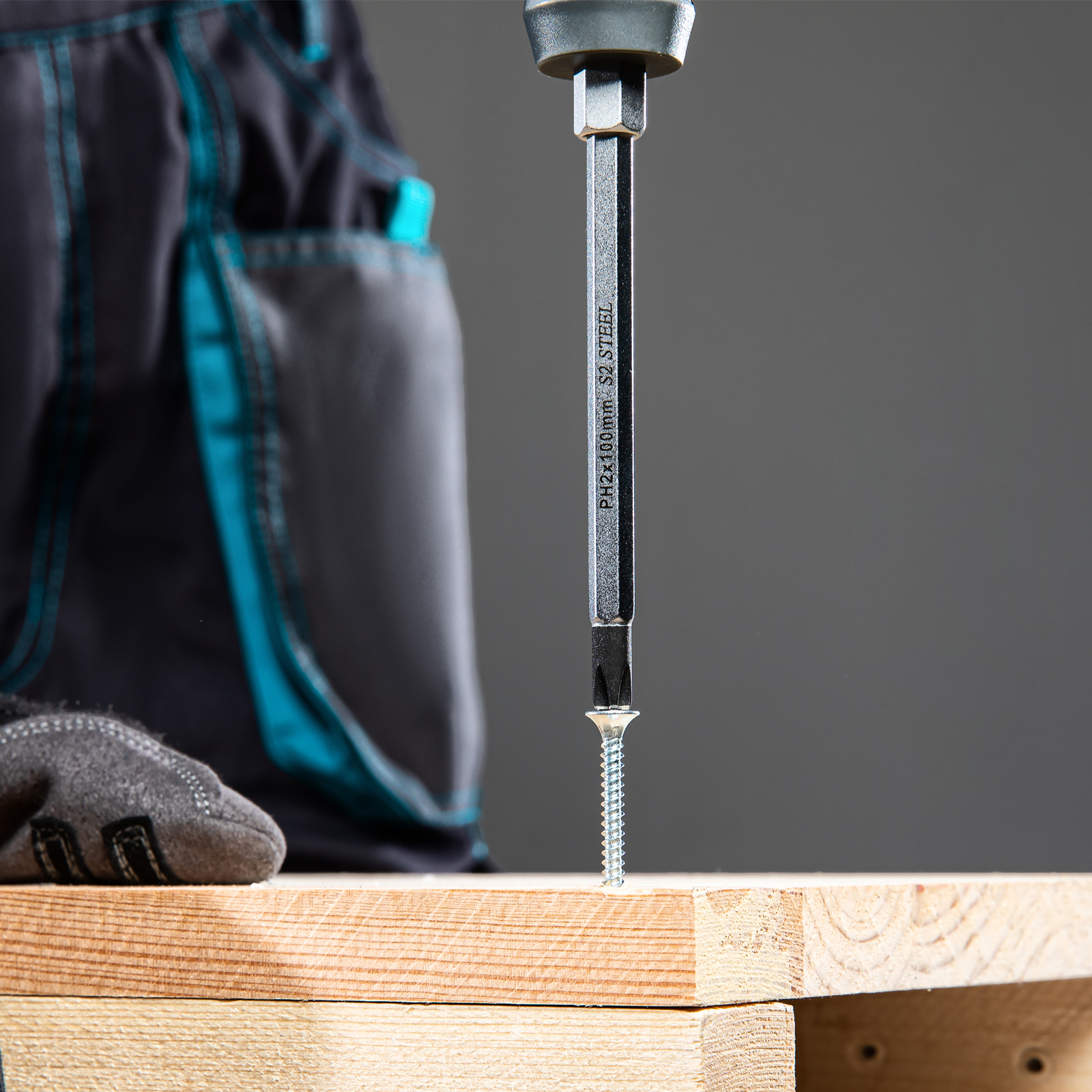 - Удобство использования — шлицы со специальными насечками и фосфатным покрытием надежно сцепляются с головкой крепежа, что снижает риск его повреждения.