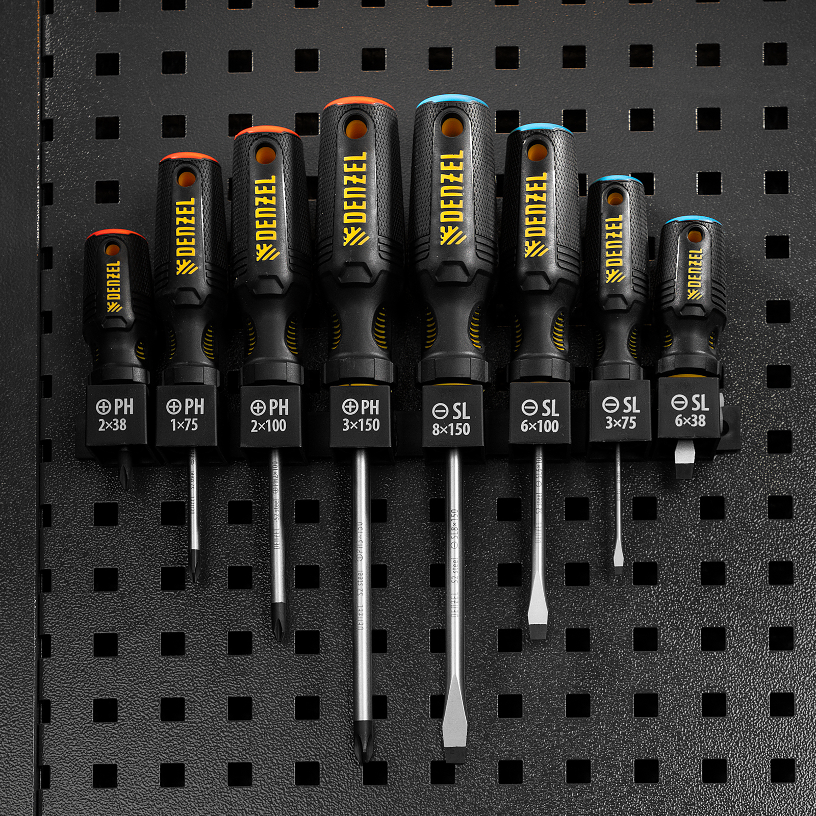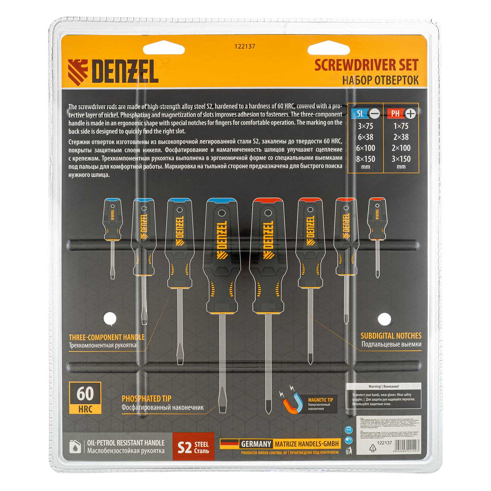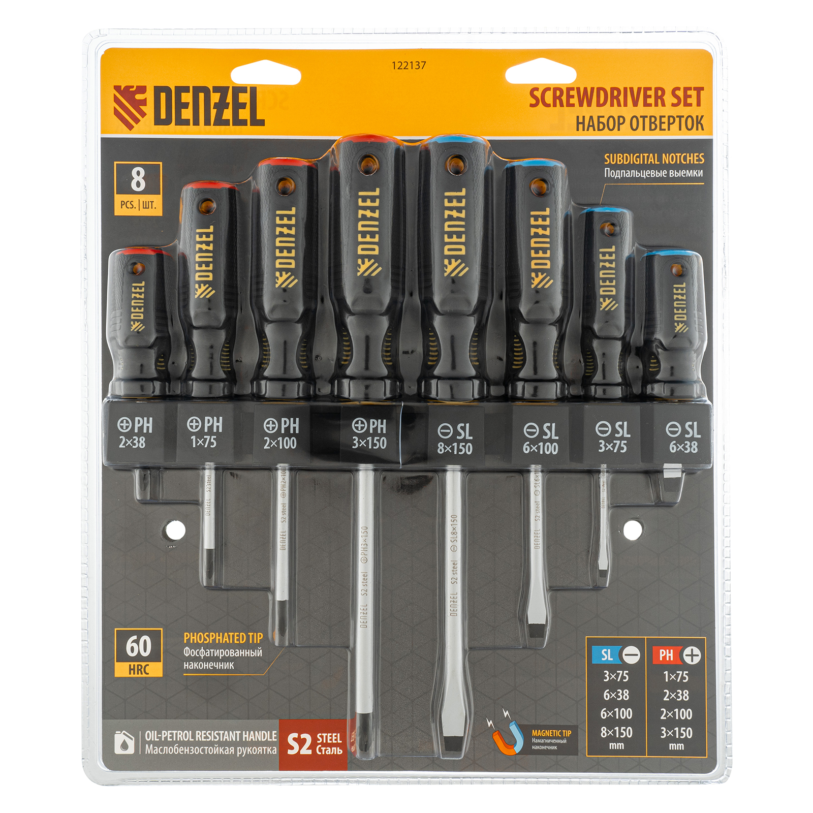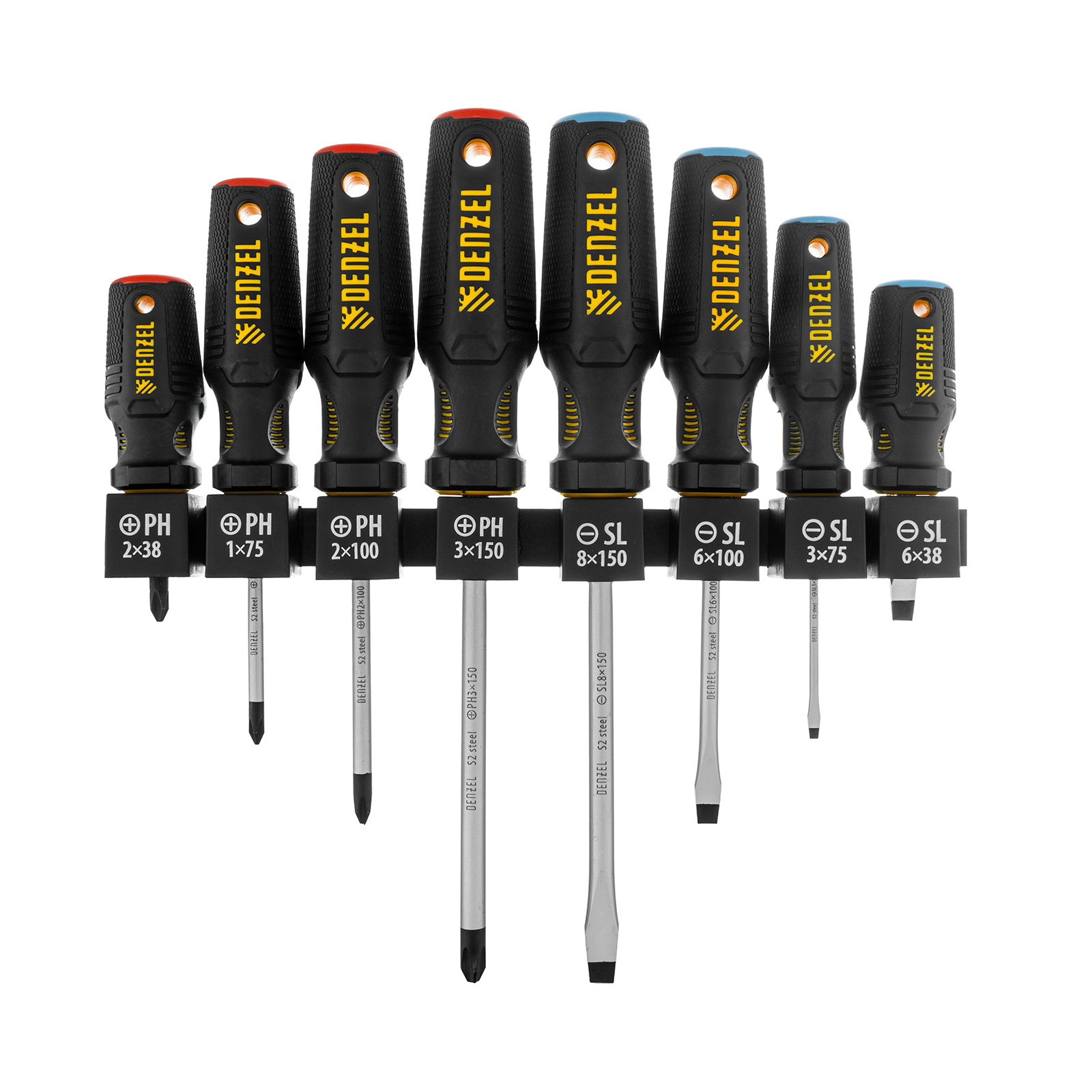 Набор Denzel 122137 состоит из 8 отверток с трехкомпонентными рукоятками, изготовленных из стали S2 и предназначенных для работы с резьбовым крепежом типа PH и SL. Благодаря намагниченным высокоточным шлицам направлять отвертки с крепежом можно одной рукой. Отвертка с длиной стержня 38 мм удобна для работы в ограниченном пространстве. Набор подходит для профессионального использования.