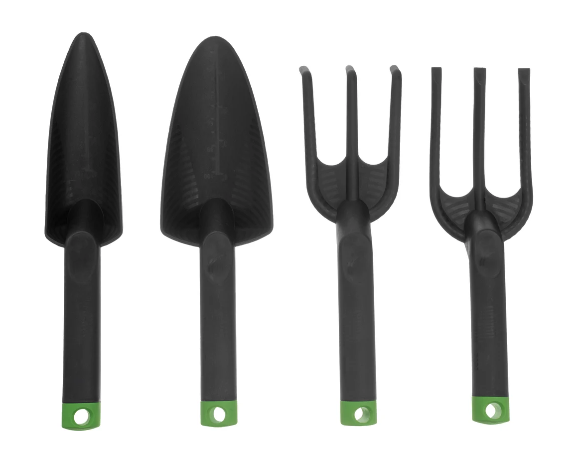 Набор садовых инструментов Palisad BASE 62912 состоит из 4 предметов, изготовленных из полиамида: посадочной вилки, рыхлителя, узкого и широкого совков. Предназначен для рыхления, вскапывания, разравнивания почвы, формирования лунок и бороздок для посадки растений. Компактные инструменты удобны для работы на небольших грядках и клумбах.