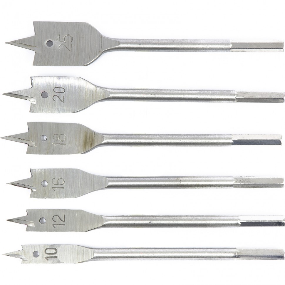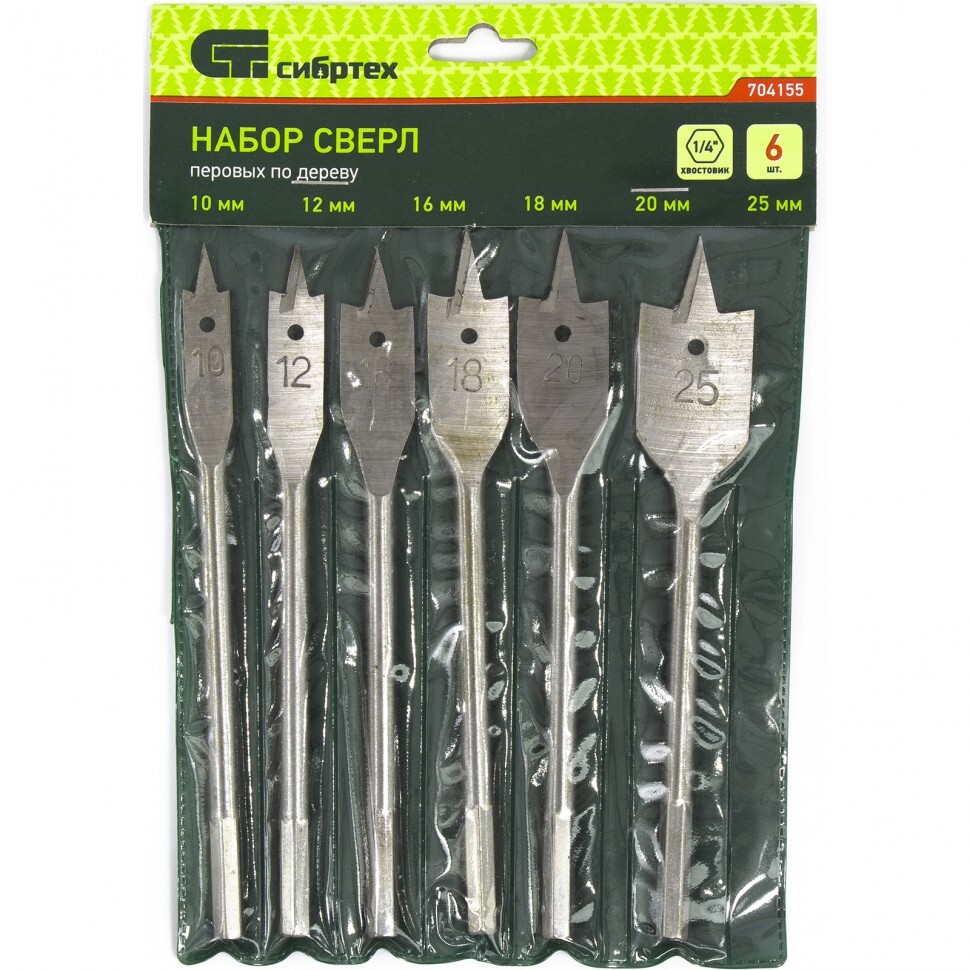 Набор Сибртех 704155 состоит из 6 перовых сверл по дереву размером 10-12-16-18-20-25 мм, с 6-гранным хвостовиком, используемых для получения глубоких сквозных отверстий в древесине. Ими также можно сверлить глухие отверстия, если нет строгих требований к форме их дна. Точное позиционирование сверл обеспечивают центральные шипы. Набор включает инструменты самых распространенных размеров и пригодится для сборки деревянных конструкций.