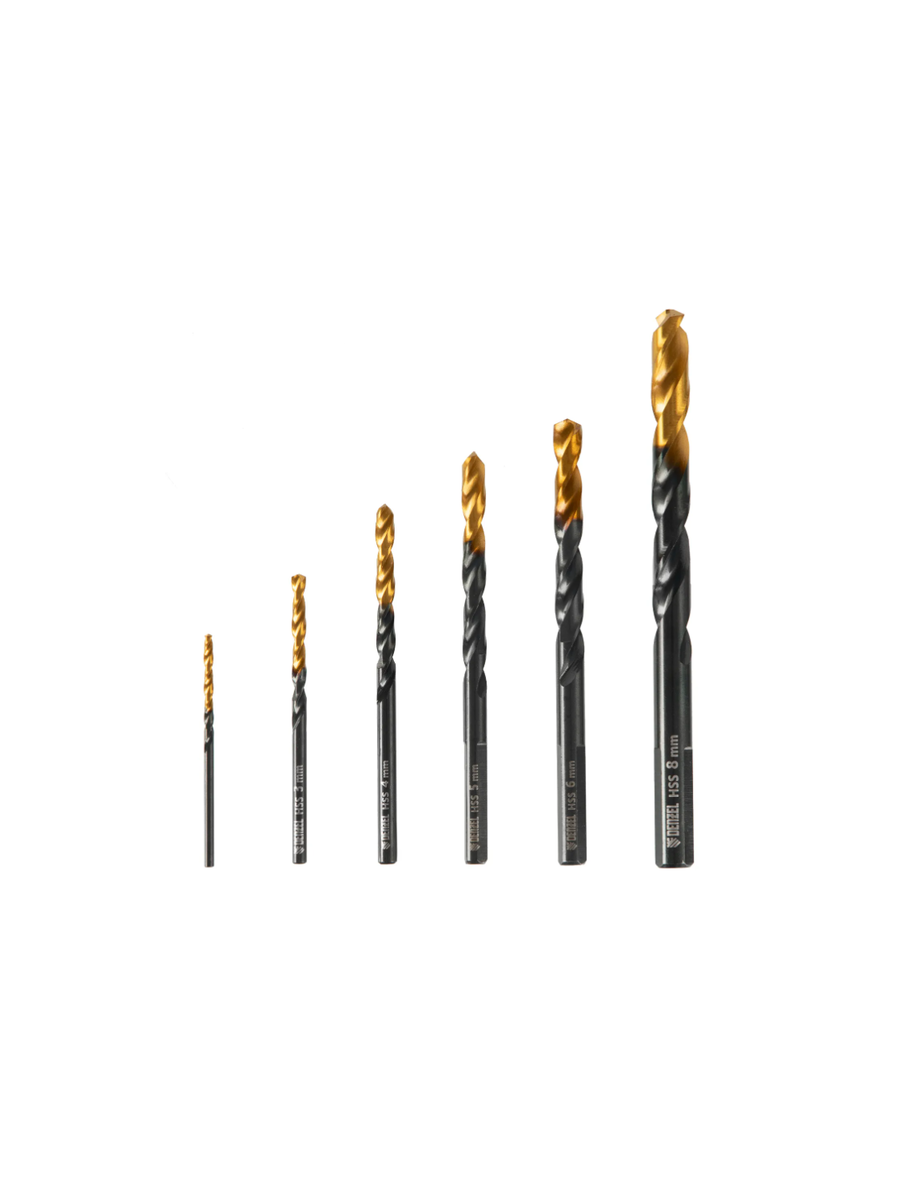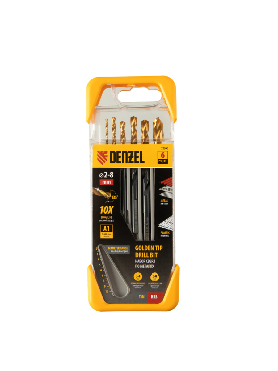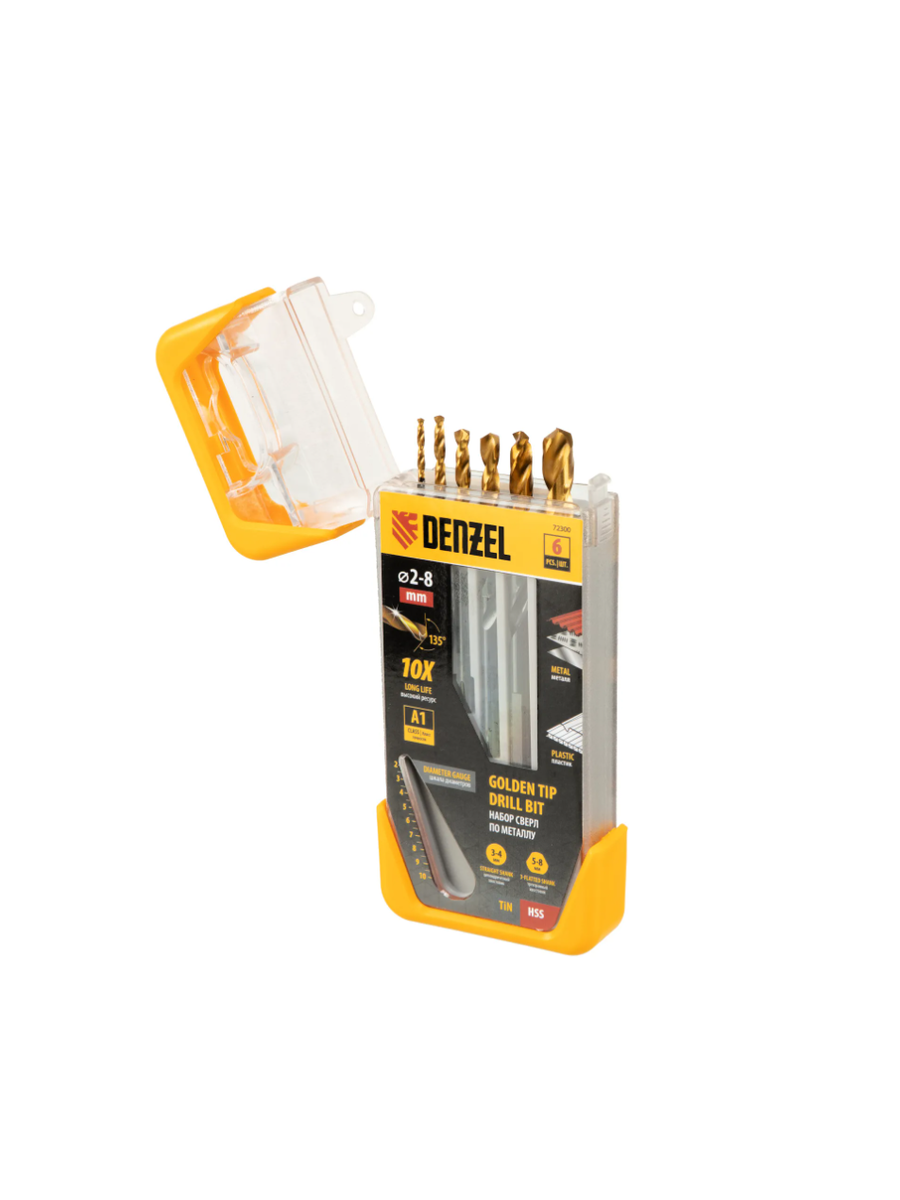 Набор Denzel Golden Tip 72300 включает 6 сверл по металлу диаметром 2, 3, 4, 5, 6 и 8 мм, предназначенных для сверления отверстий в заготовках из сталей различной твердости. Оснастке присвоен класс точности A1: оптимальная геометрия вышлифованных профилей обеспечивает высокую точность полученных отверстий.