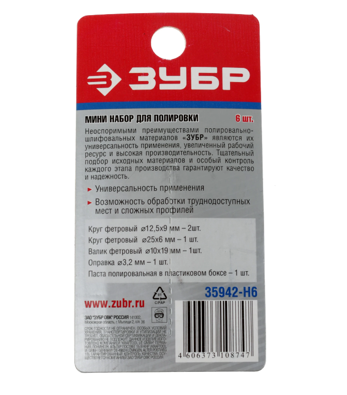 Шесть предметов комплекта насадок для полировки Зубр 35942-H6 адаптированы к использованию в граверах различных моделей и хорошо справляются со своими функциями. Изделия находятся в прозрачном блистере, позволяющем с первого взгляда установить комплектность набора. Функциональность и хороший рабочий ресурс этих кругов и валиков для полировки оценит даже специалист, работающий над полировкой металлических заготовок.