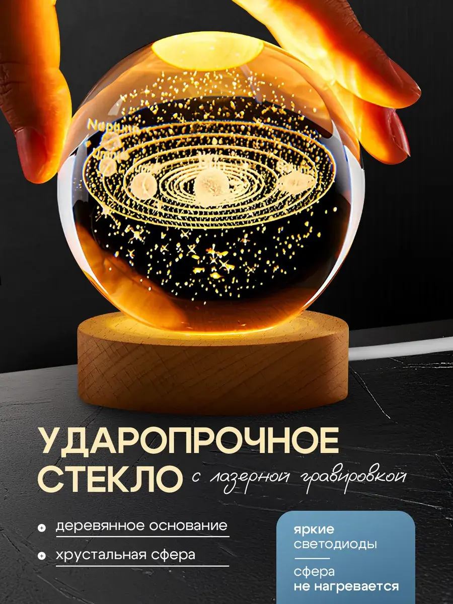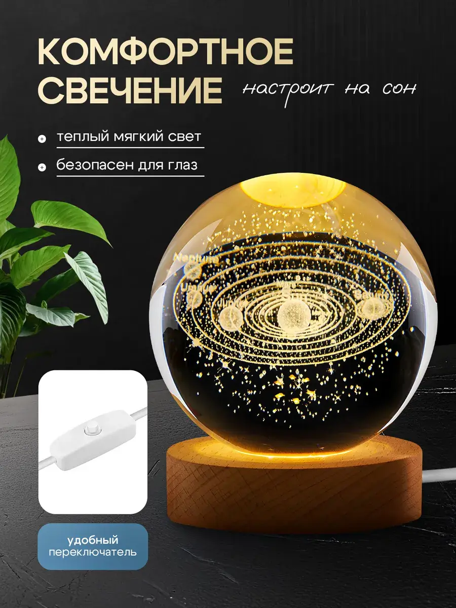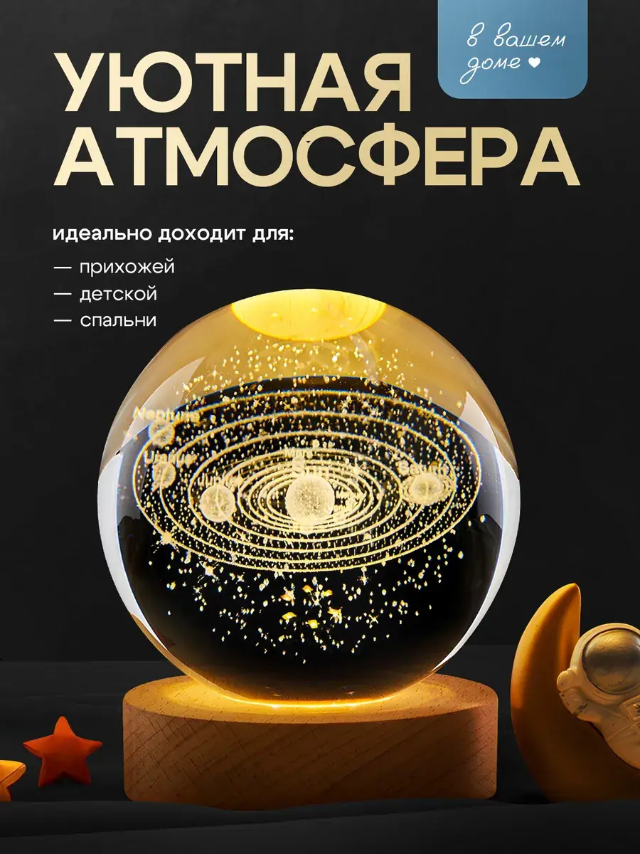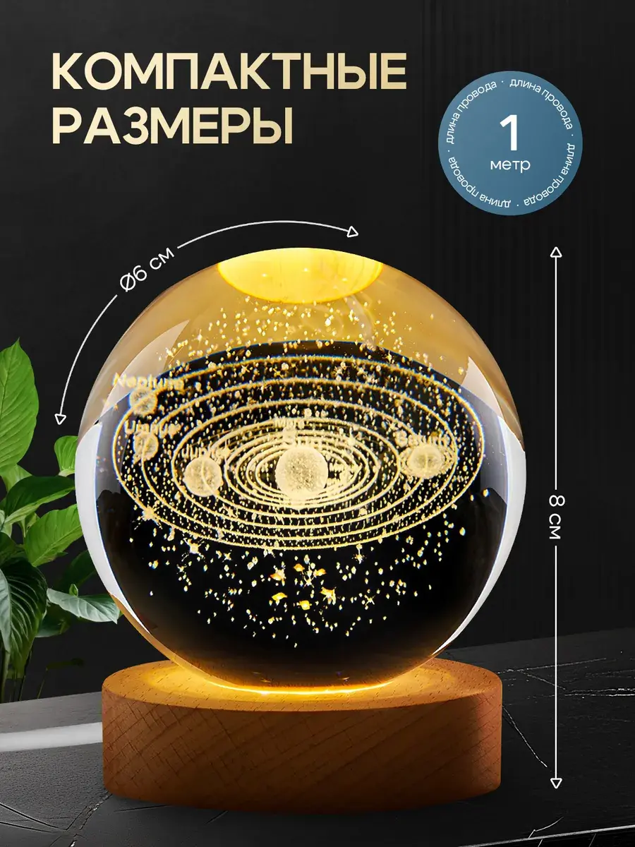 Ночник детский стеклянный шар светильник Космос — это не просто источник света, а настоящий шедевр, который украсит детскую комнату. Ночник служит оригинальным элементом декора для оформления спальни, гостиной или в качестве прикроватного ночника. Стеклянный шар с изображением солнечной системы создает волшебную атмосферу и наполняет пространство мягким, успокаивающим светом. Ночник детский работает от USB-кабеля, что делает его безопасным и удобным в использовании. Мягкий свет поможет малышу заснуть, а его необычный дизайн станет прекрасным дополнением к интерьеру детской. Светодиодный ночник излучает мягкое, успокаивающее свечение, напоминающее лунный свет. Этот светильник подойдет для девочек, мальчиков или новорожденных, а так же будет памятным подарком сыну или дочери, для мамы и сестры, а также близким, друзьям и коллегам.