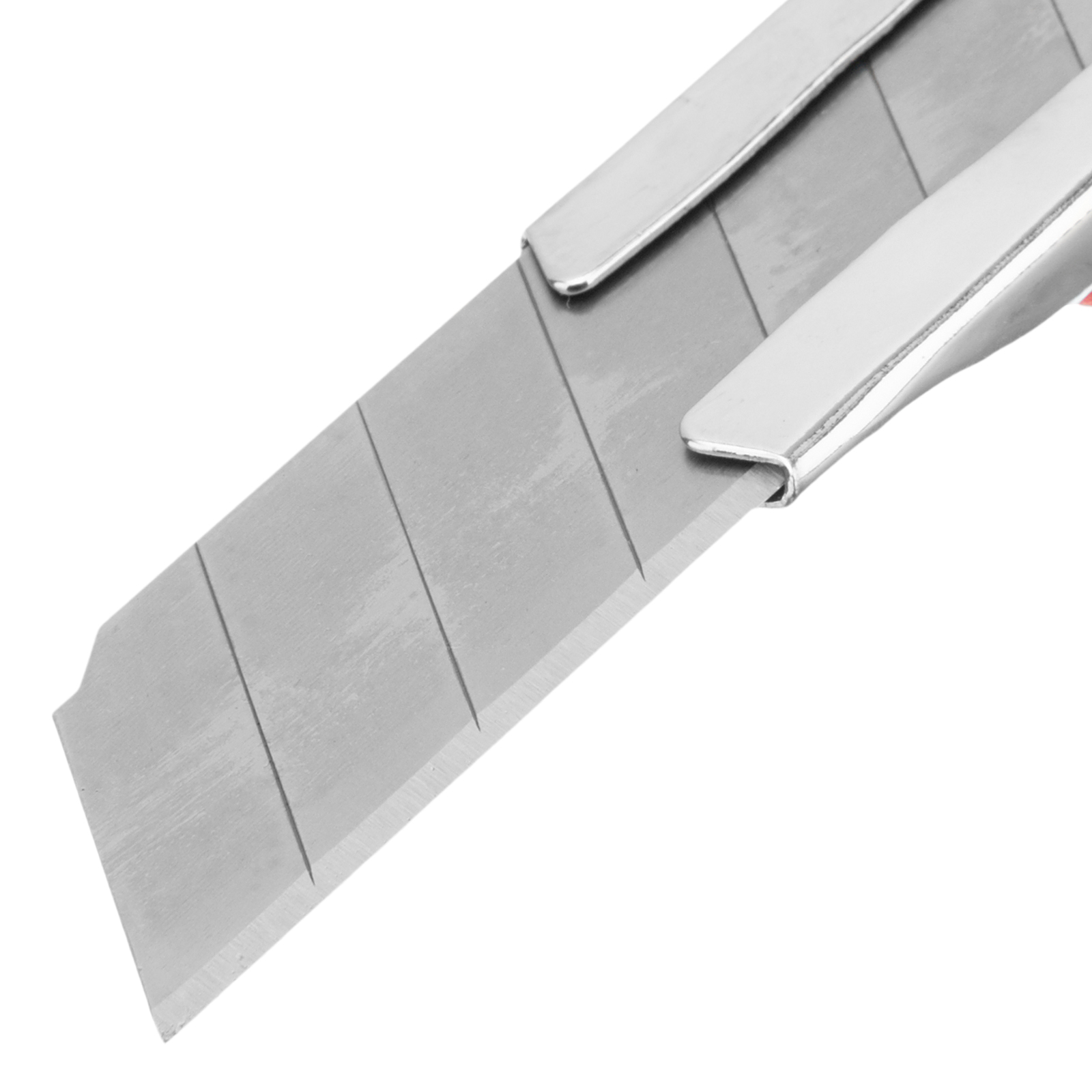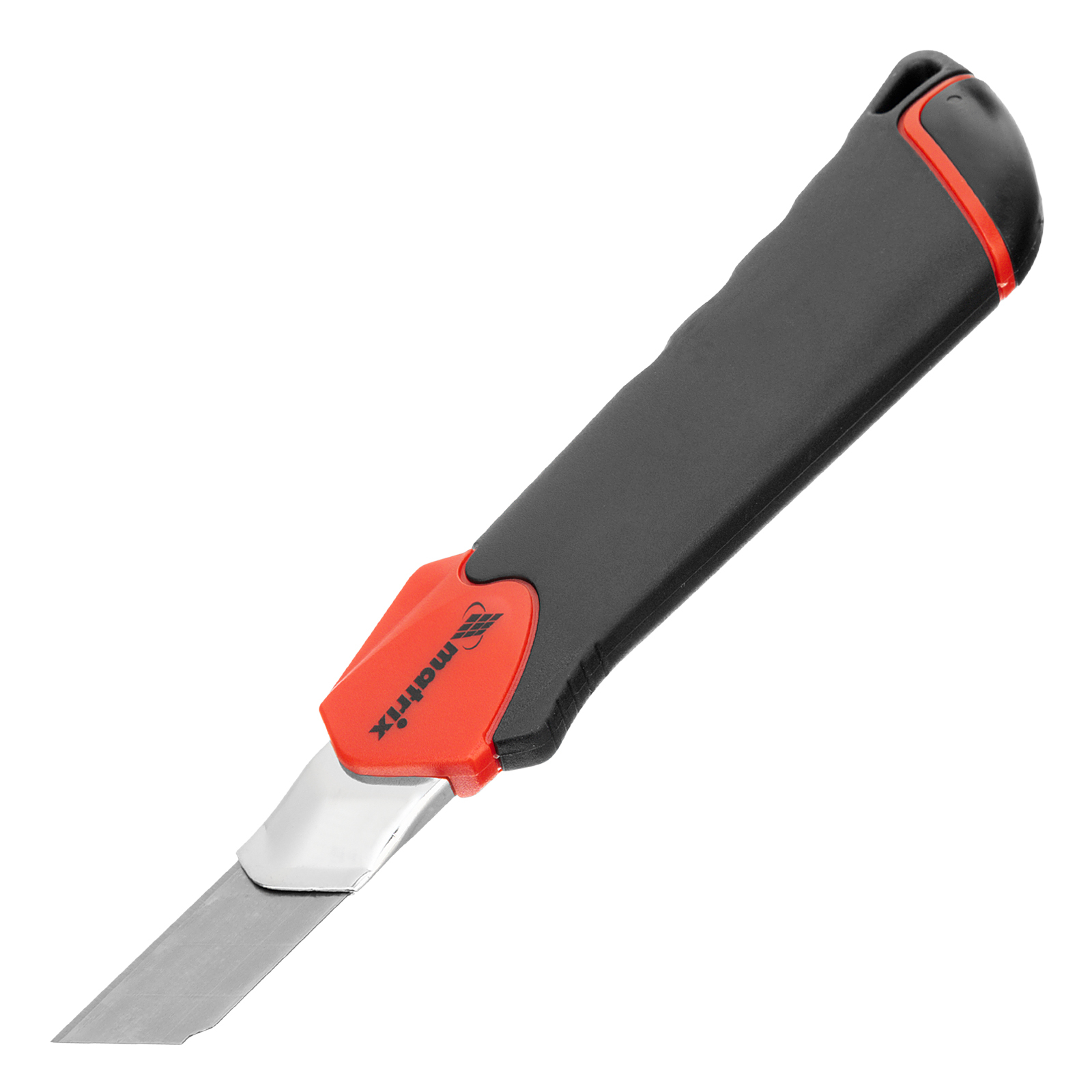 Нож Matrix 78933 с выдвижным лезвием шириной 18 мм, металлической направляющей и эргономичной двухкомпонентной рукояткой пригодится при выполнении ремонтных и строительных работ в мастерской и в быту. Он легко режет бумагу, картон, кожу, обои и другие материалы. Выдвижная конструкция позволяет с удобством эксплуатировать и безопасно перевозить нож.